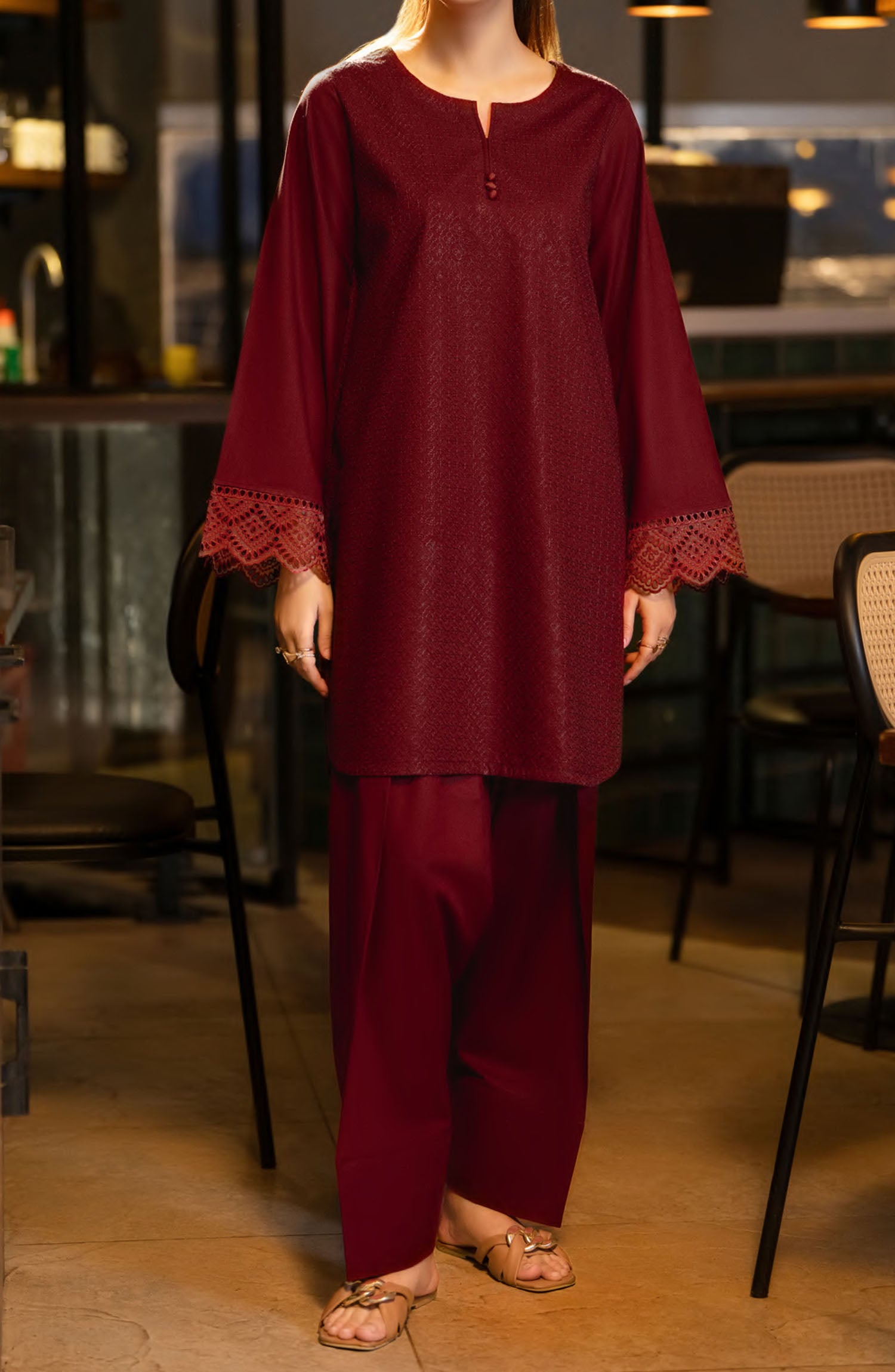 Home Casual Lite Embroidered Cotton Lawn Stitched 2 Piece Suit - Outfit-03 - CL25T70 - Maroon - Summer Collection