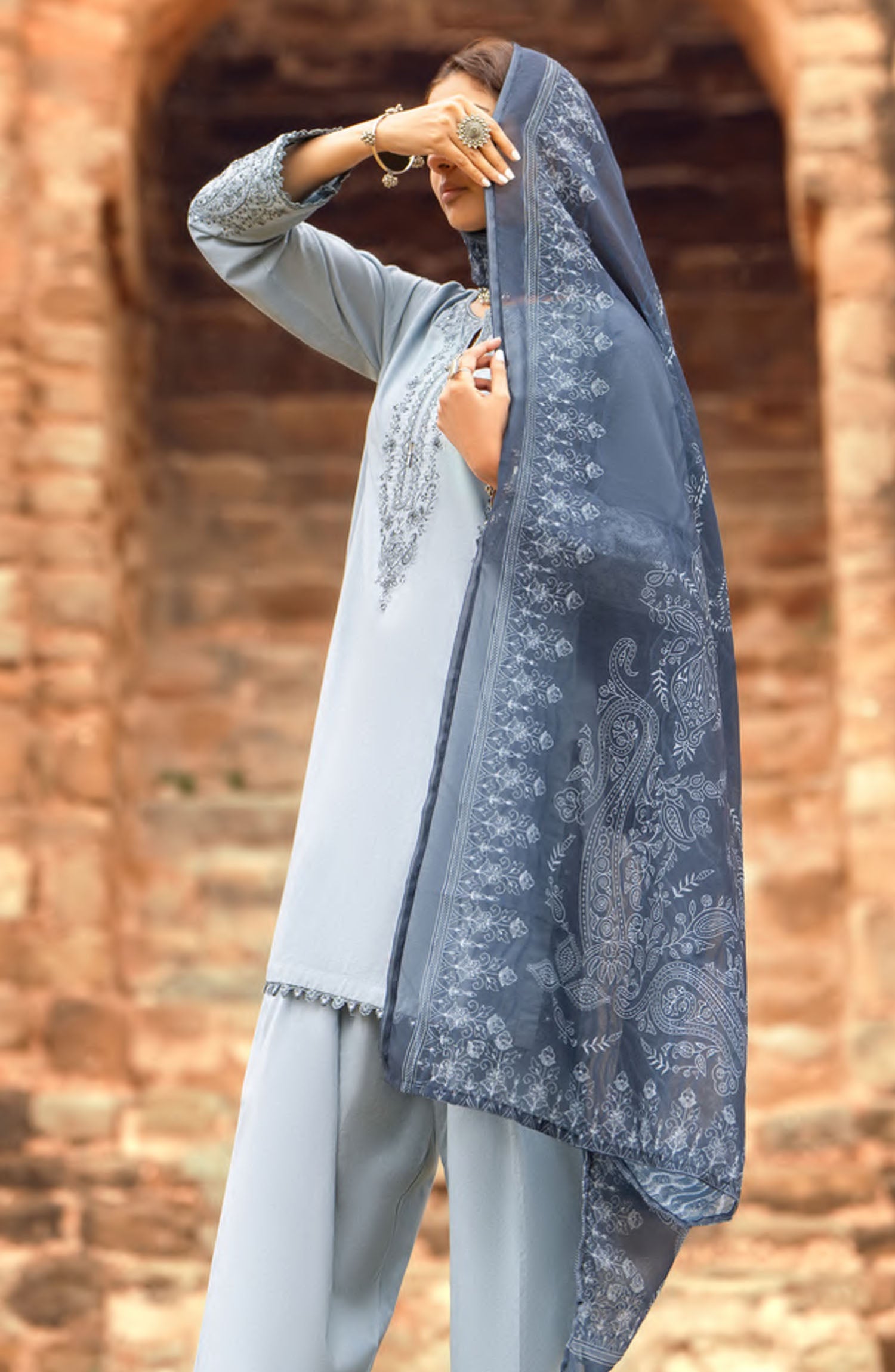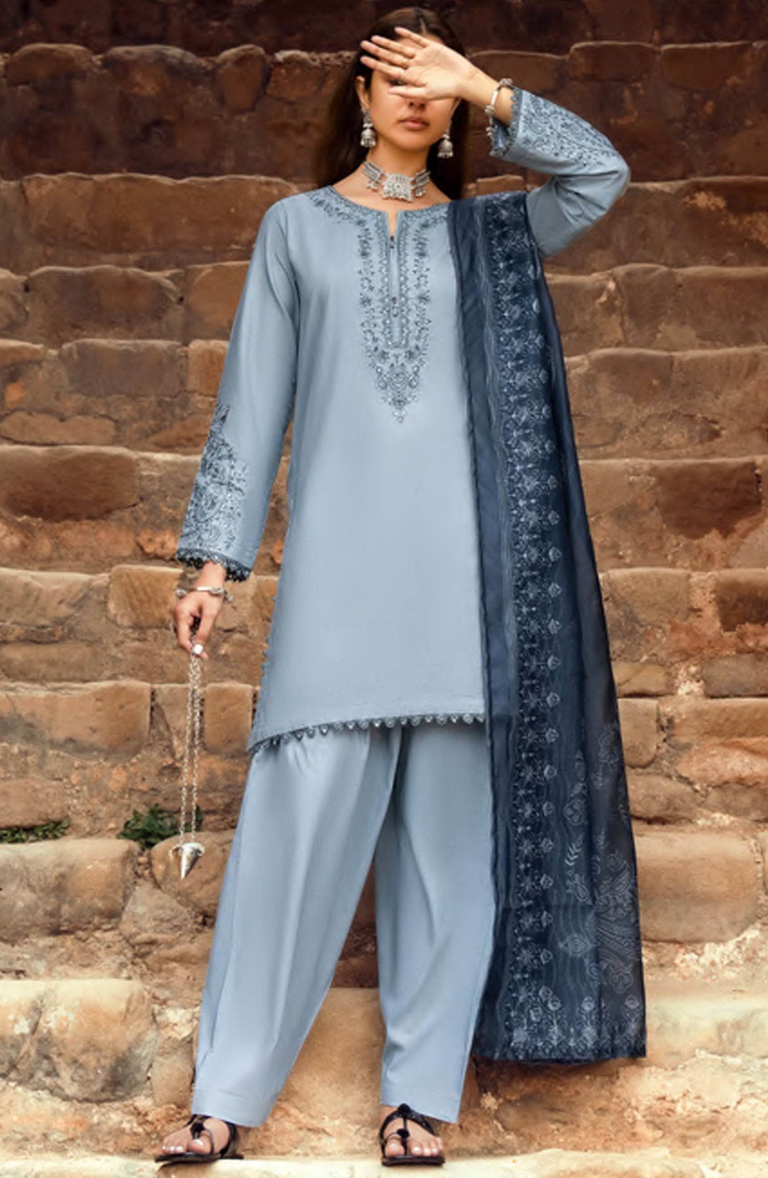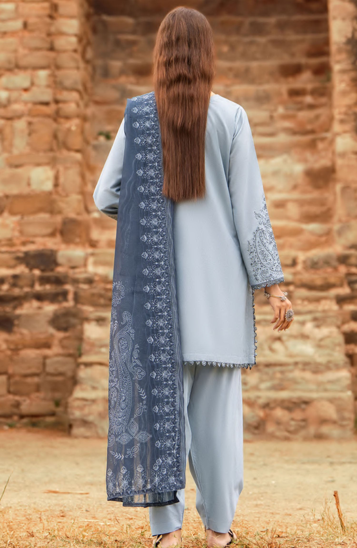 The standard style comes as a long-sleeved kameez with dupatta and trouser/shawlar.