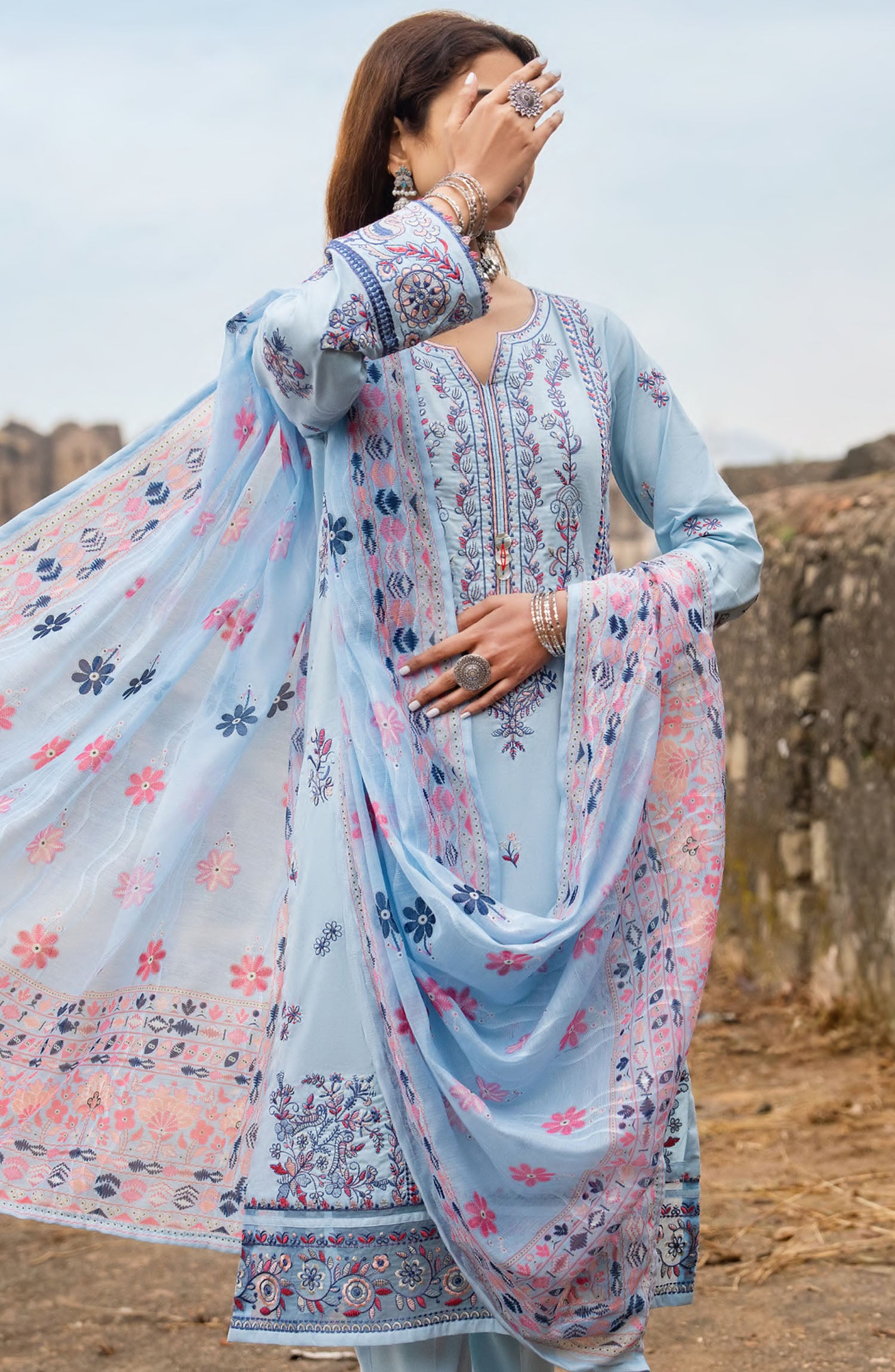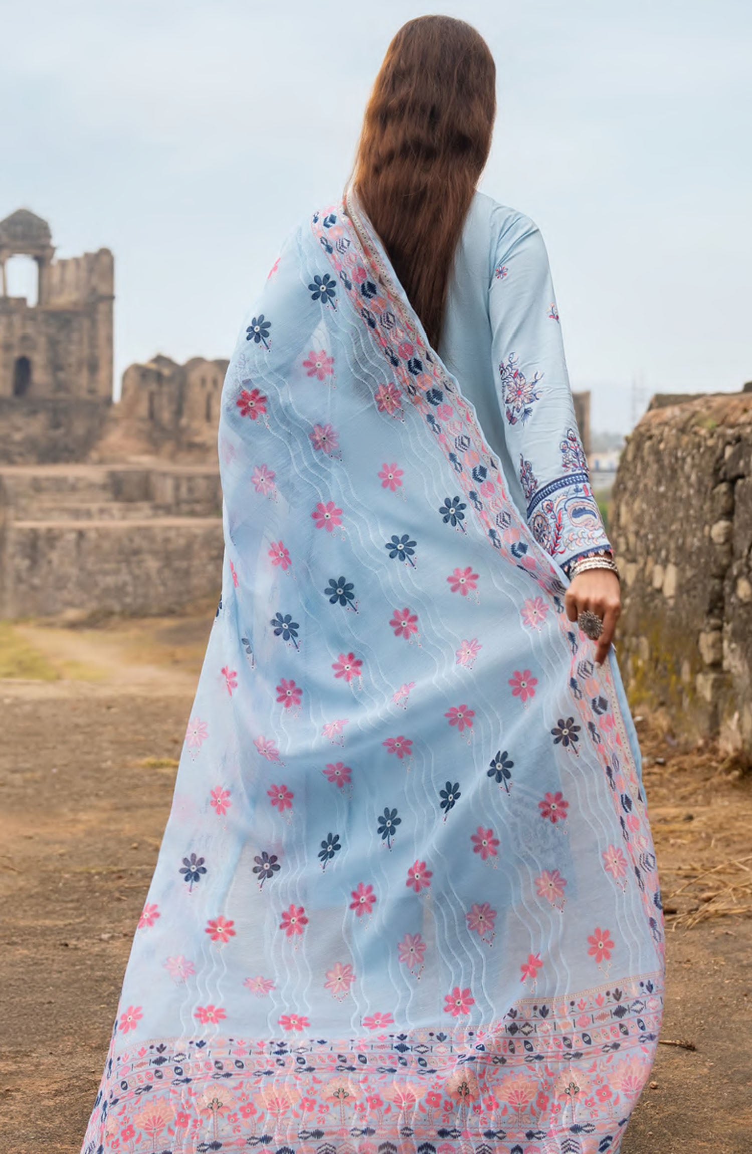 The standard style comes as a long-sleeved kameez with dupatta and trouser/shawlar.