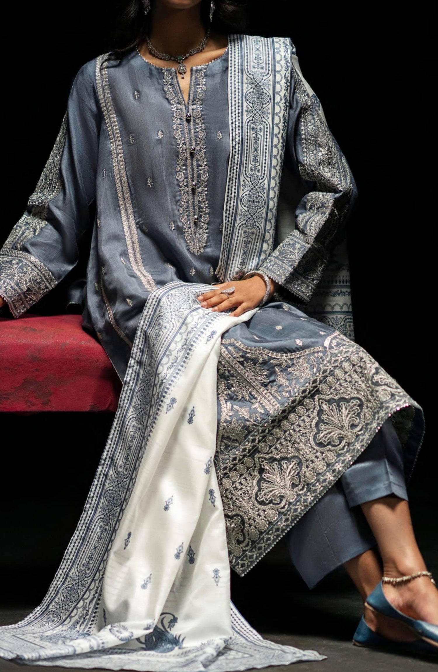 The standard style comes as a long-sleeved kameez with dupatta and trouser/shawlar.