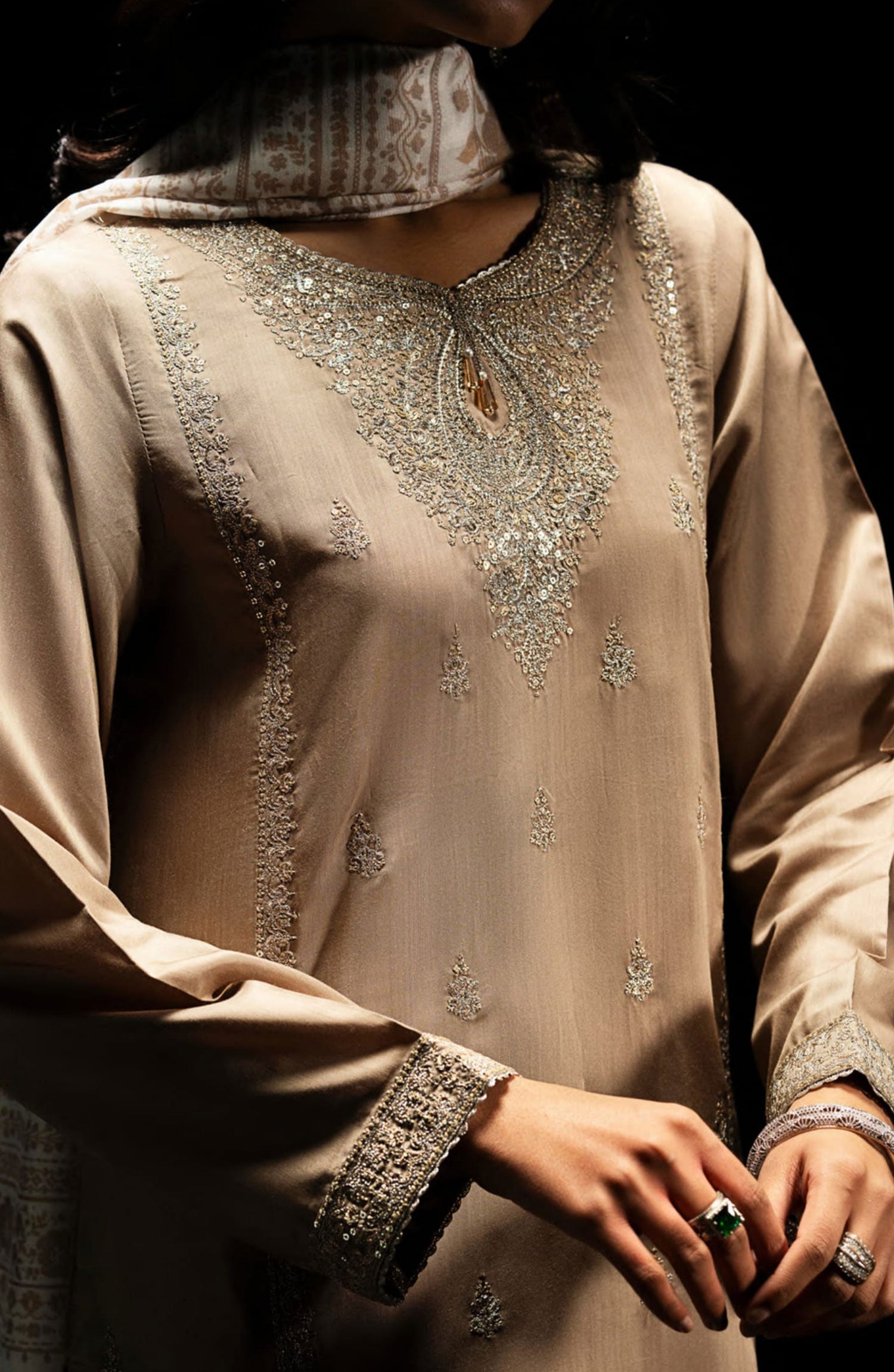 The standard style comes as a long-sleeved kameez with dupatta and trouser/shawlar.