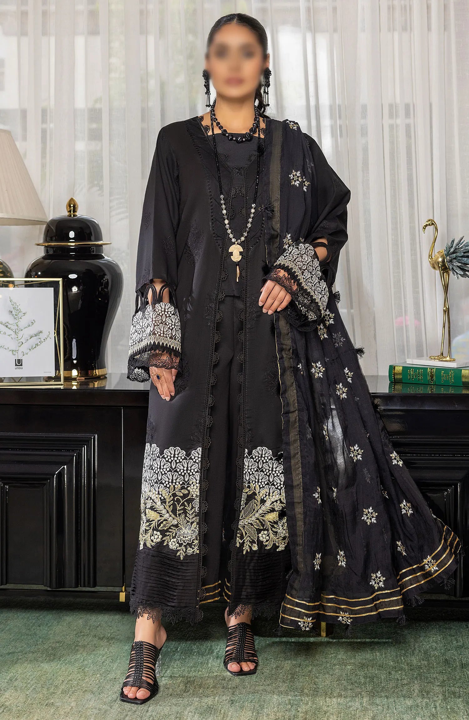 The standard style comes as a long-sleeved kameez with dupatta and trouser/shalwar.