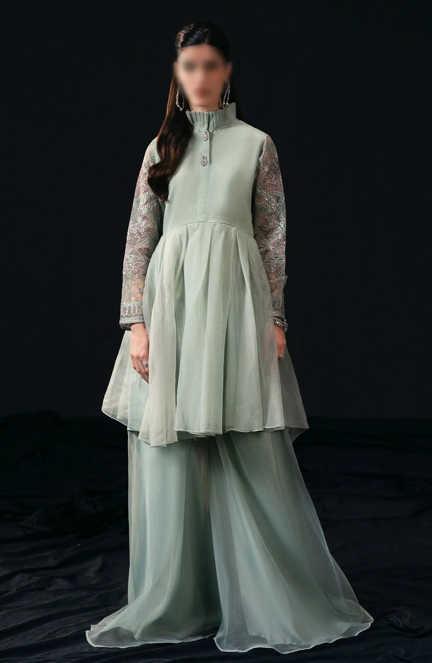 Plain Organza Fabric For Frock With Embroidered Organza Sleeves And Handmade Button,