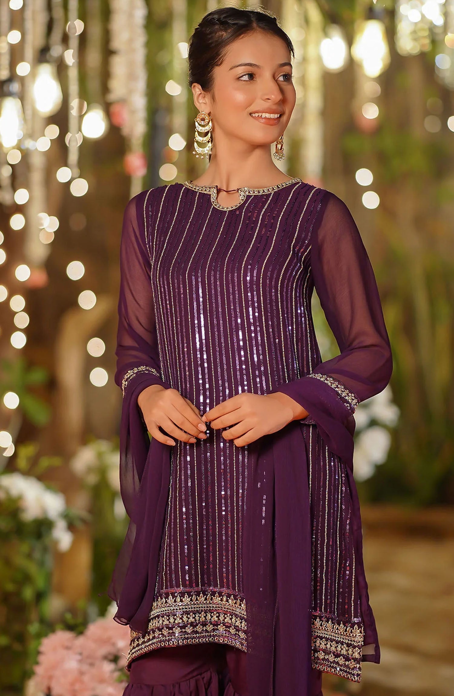 Chiffon Embroidered 3 Piece Suit - EM-47 - OCH25GFS - Purple - Casual Collection