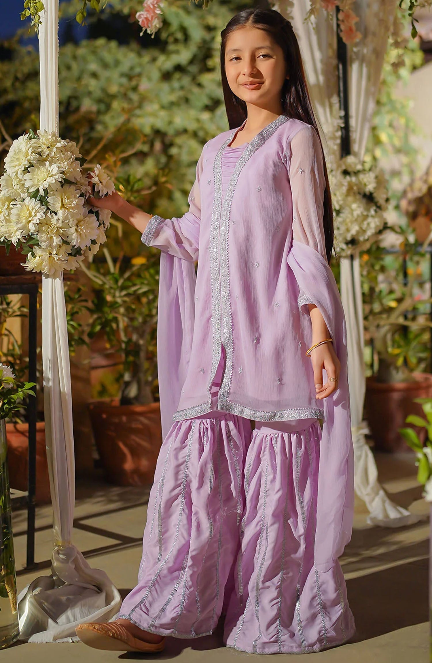 Top: Lavender Chiffon V-Neck Front Open Style Kurta with Embroidery And Stitched Malai Crepe Lining