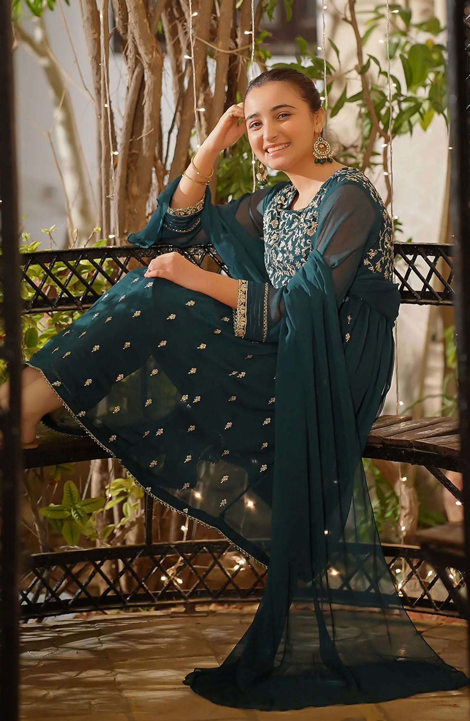 Top: Forest Green Chiffon Kurta With Embroidery, Laces and Stitched Malai Crepe Lining