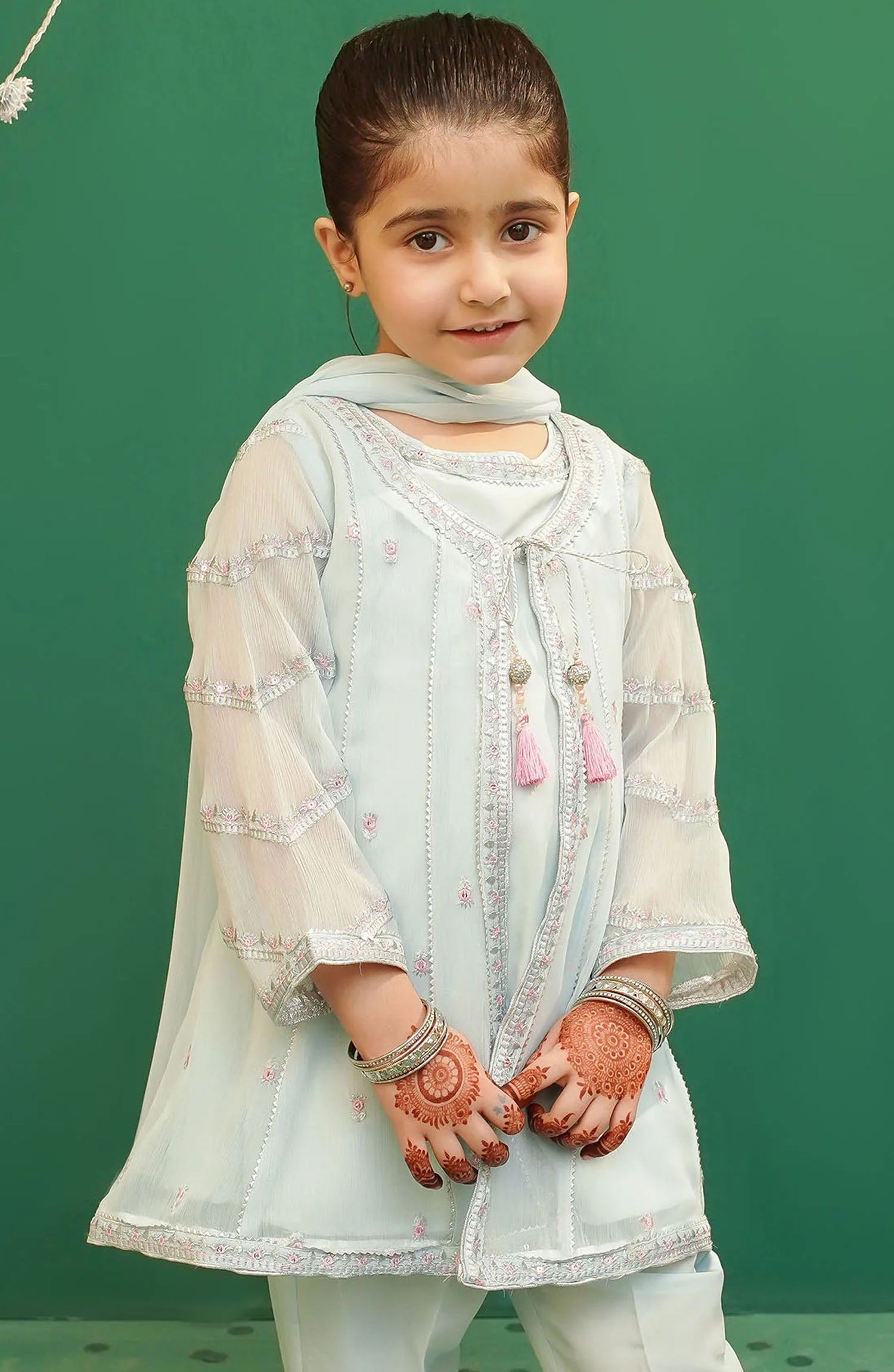 Top: Tiffany Blue Chiffon Coat Style Maxi With Embroidery, Tassels And Malai Crepe Stitched Lining