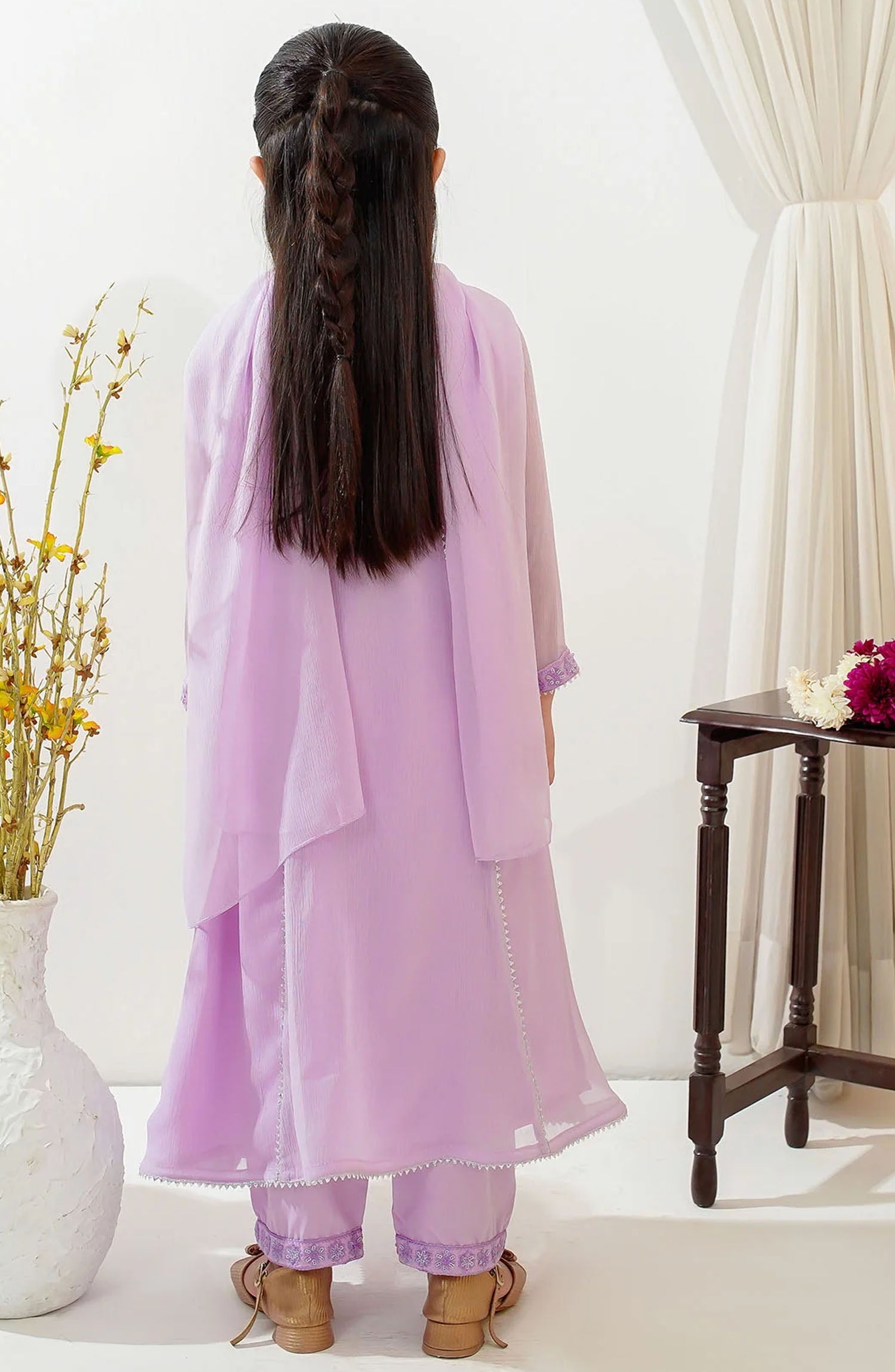 Top: Lavendar Chiffon Flared Kurta With Embroidery, Gota Lace Work And Malai Crepe Lining Stitched