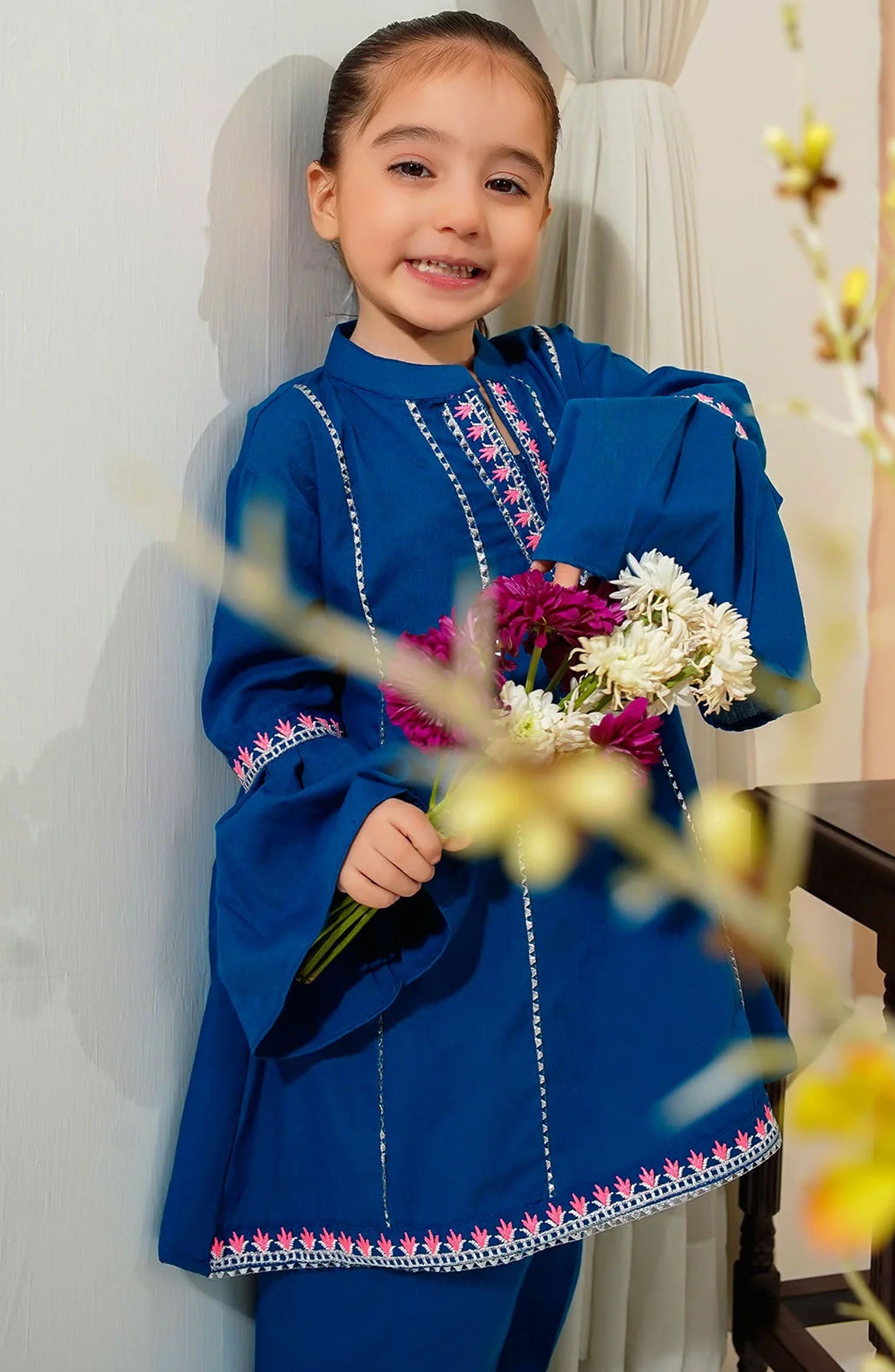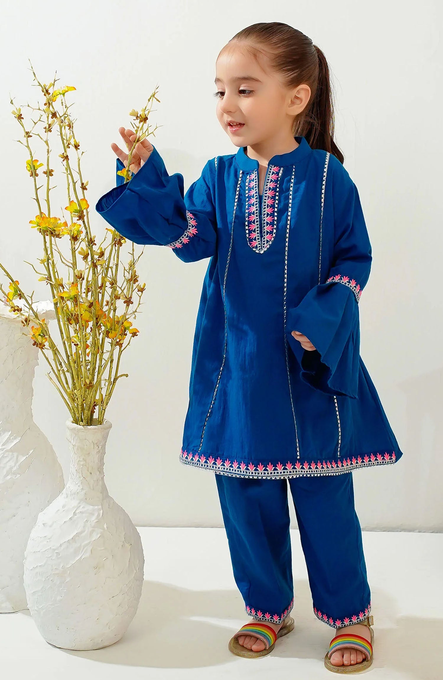 The standard style comes as a long-sleeved kameez with dupatta and trouser/shawlar.