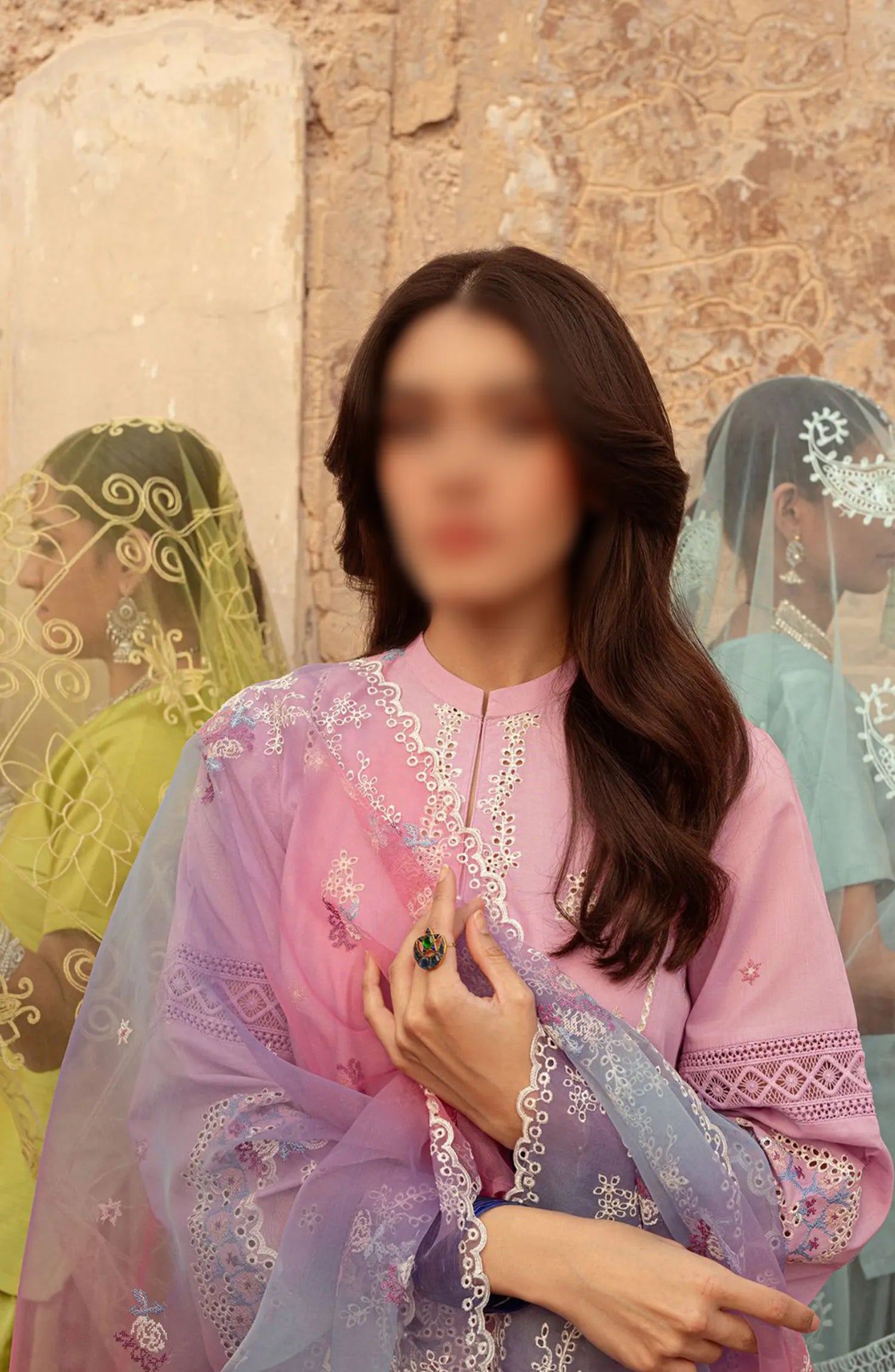 Cross Stitch Unstitched Premium Lawn Collection has been styled in the image for photography and illustrative purposes.