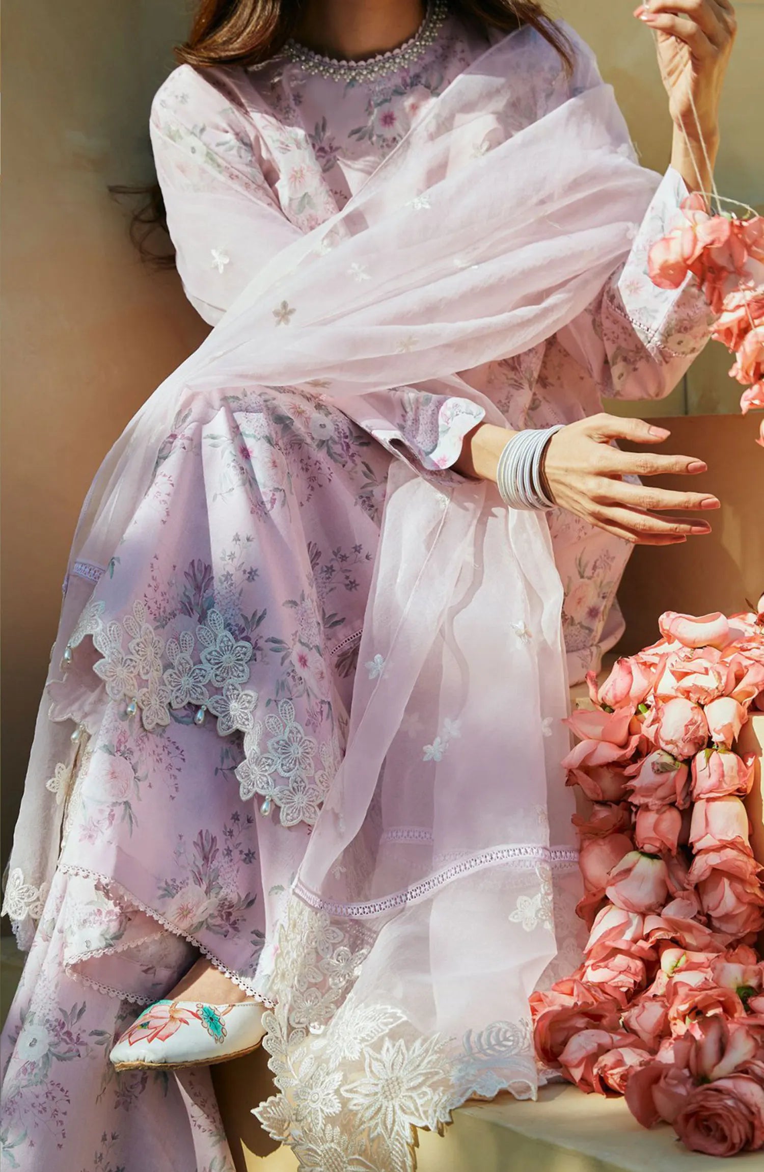 Cross Stitch Unstitched Premium Lawn Collection has been styled in the image for photography and illustrative purposes.