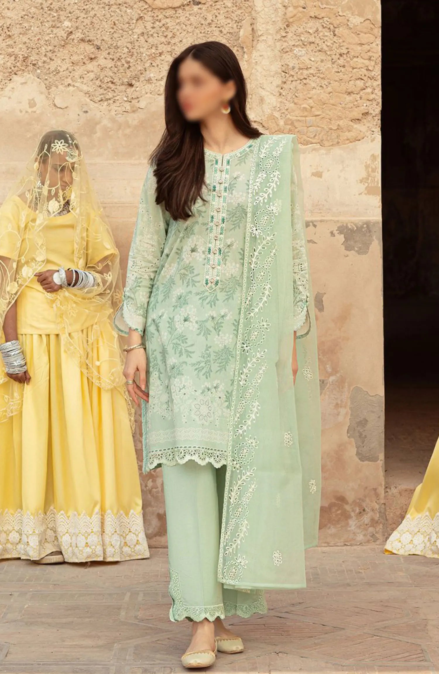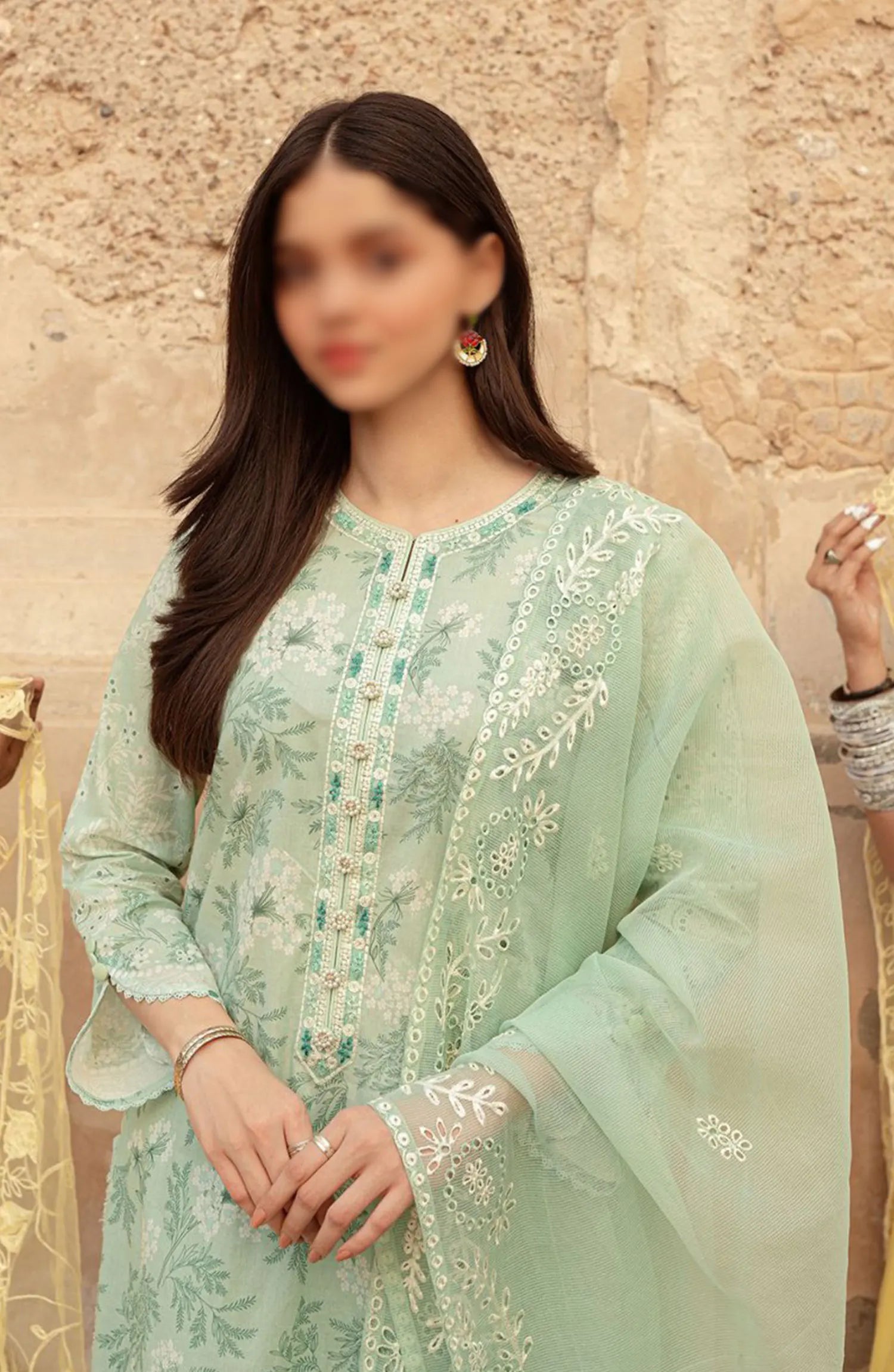 Cross Stitch Unstitched Premium Lawn Collection has been styled in the image for photography and illustrative purposes.