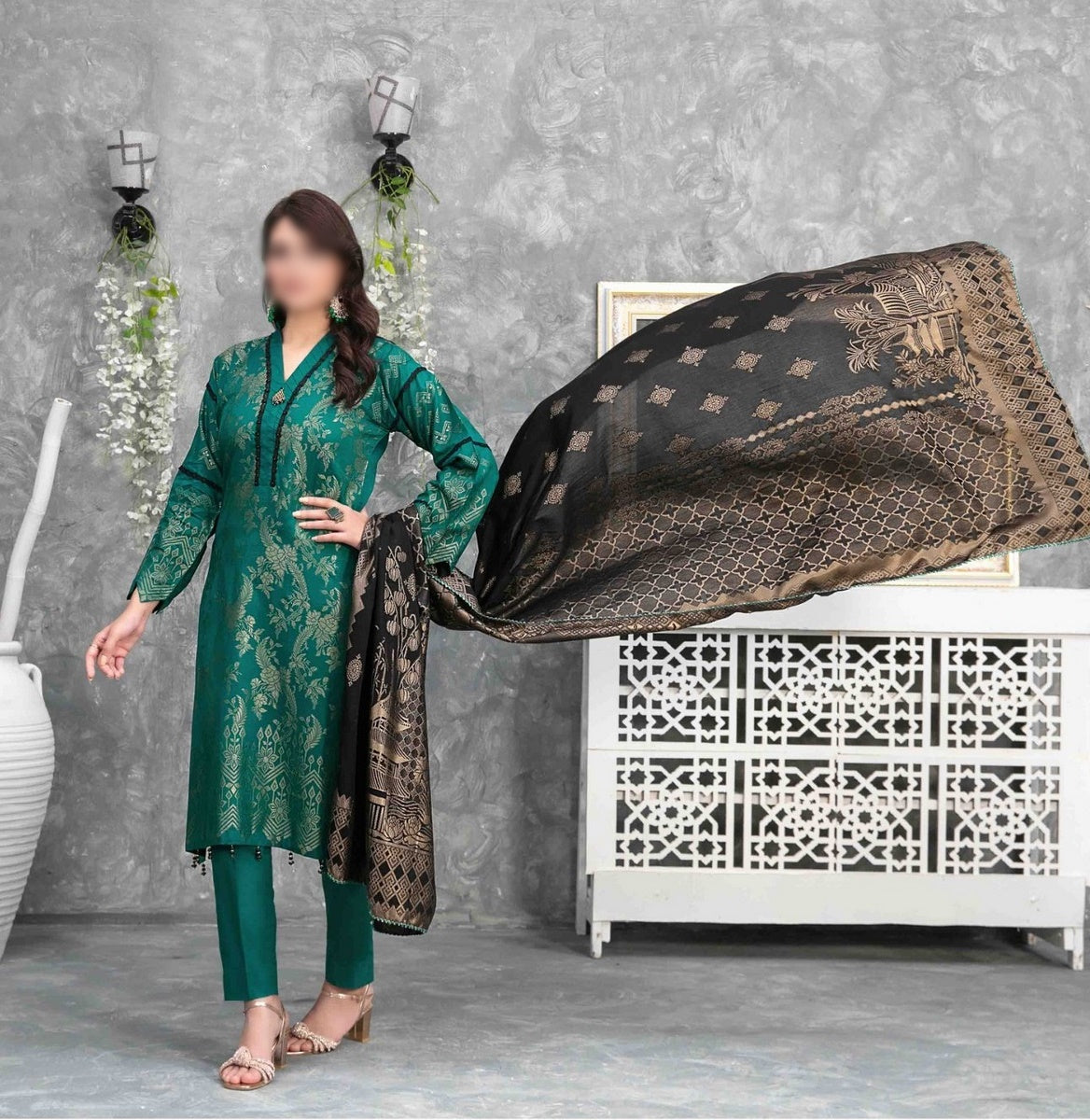 SANJH Lawn Banarsi Collection 2023 has been styled in the image for photography and illustrative purposes.