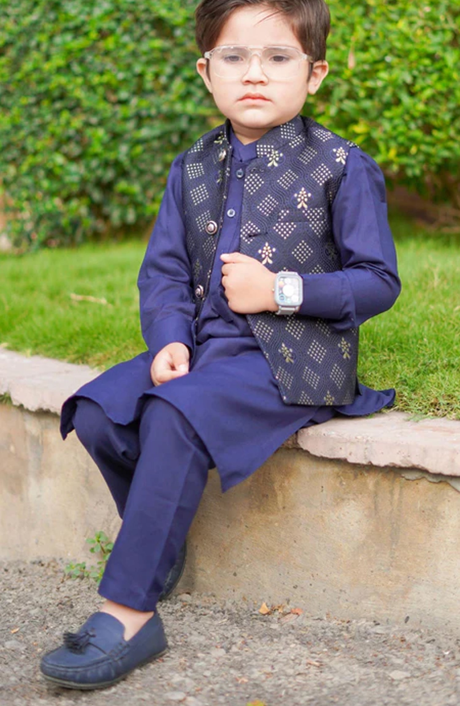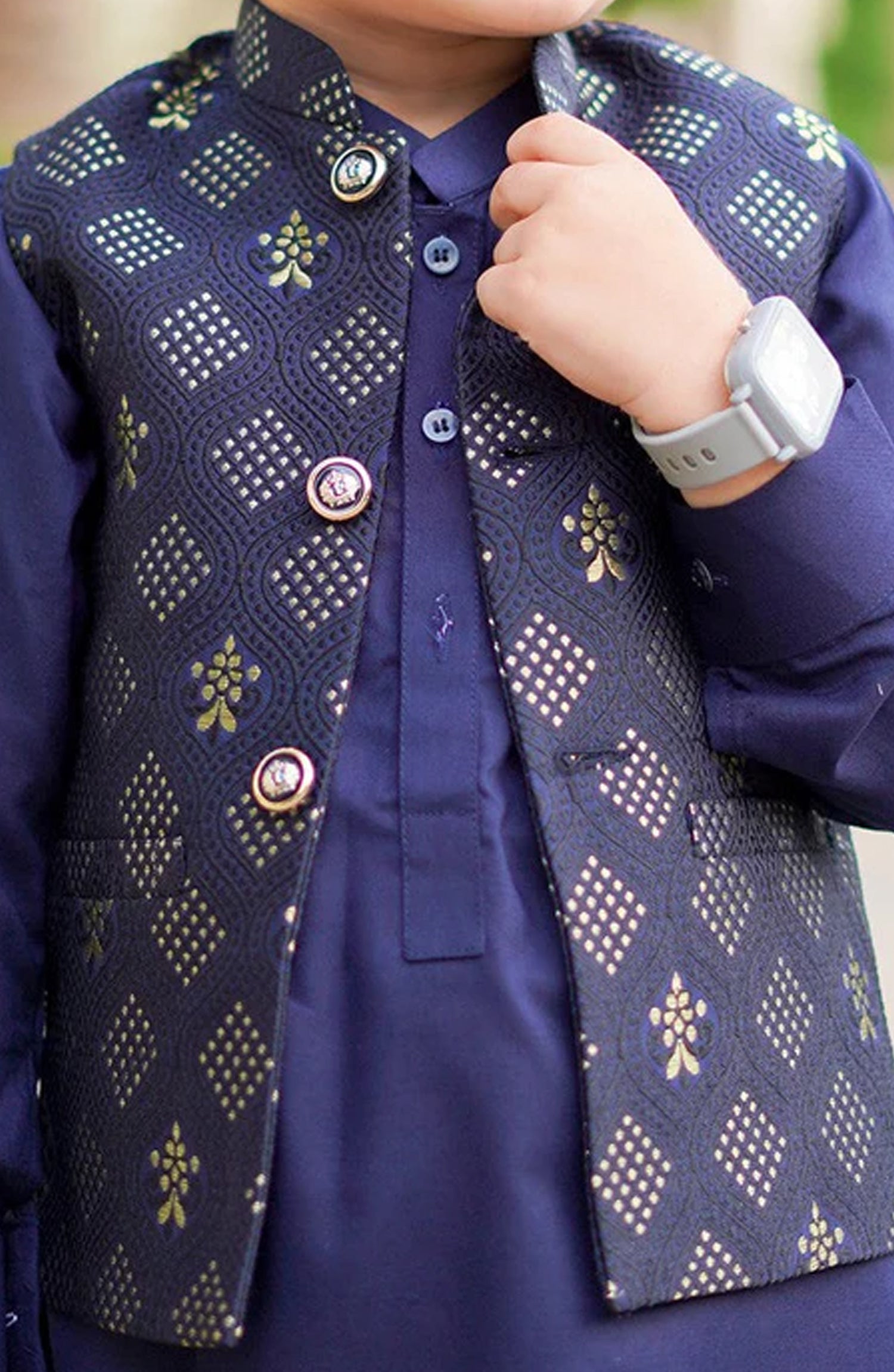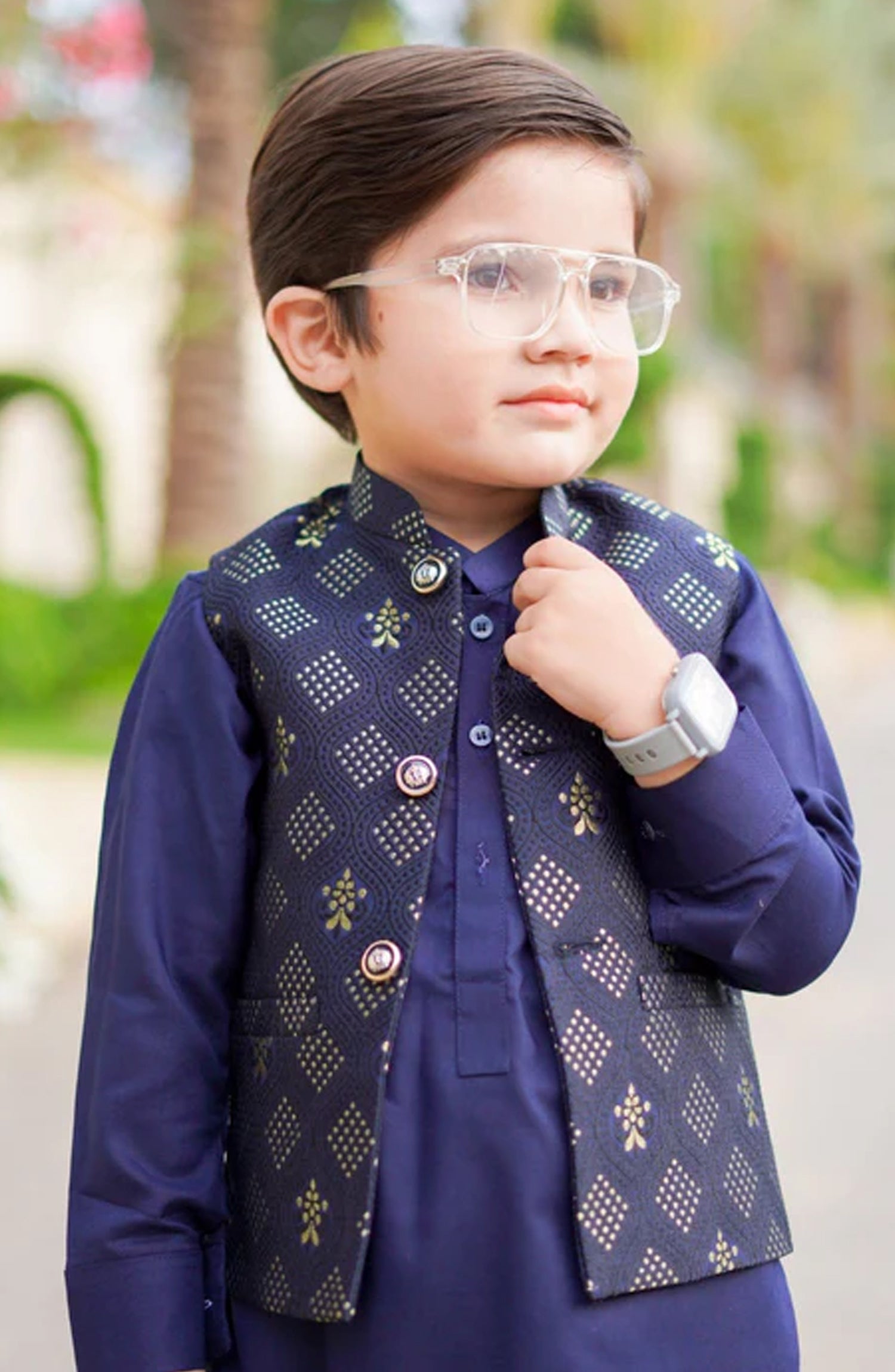 The combination of blue and gold is always a classic and sophisticated choice. The blue kurta adds a touch of elegance, while the jamawar blue and golden waistcoat with its intricate detailing and shimmering fabric takes the outfit to another level. It's a perfect choice for special occasions or formal events where you want to make a statement. You'll definitely turn heads and feel like a true fashion icon in this ensemble!