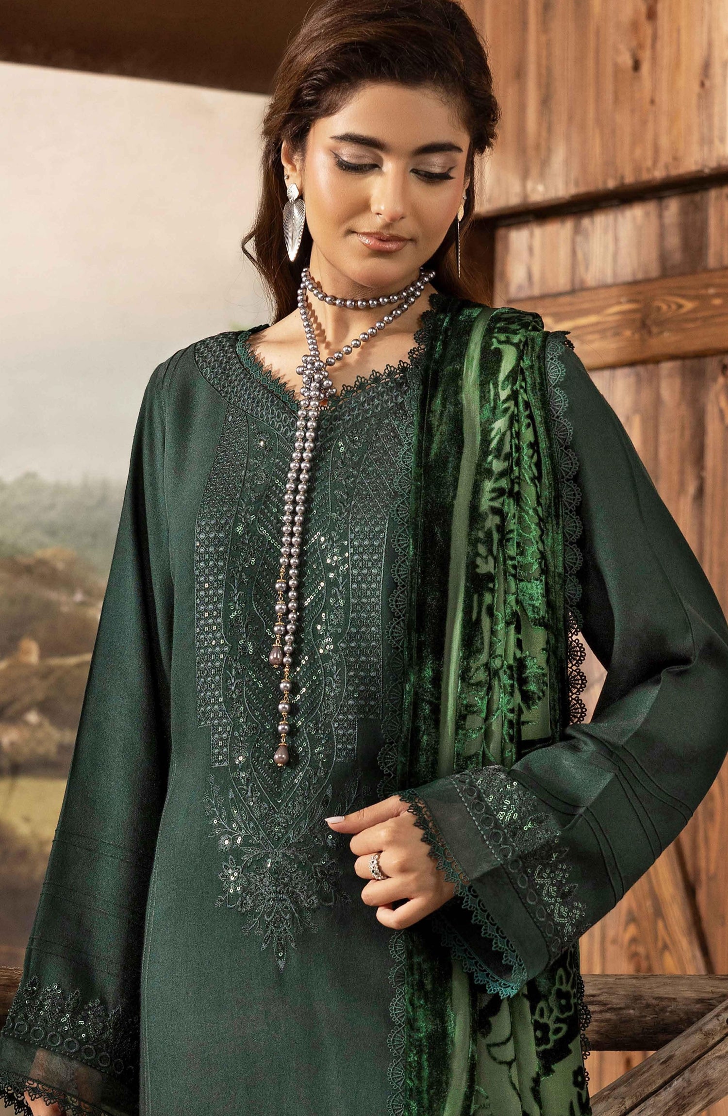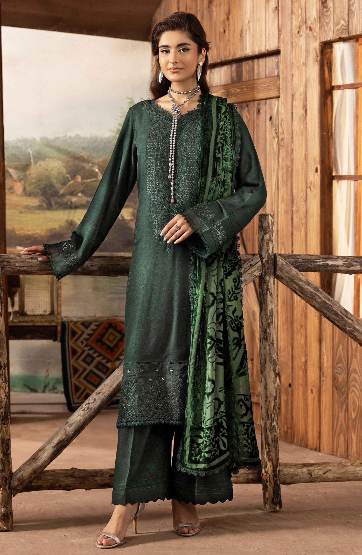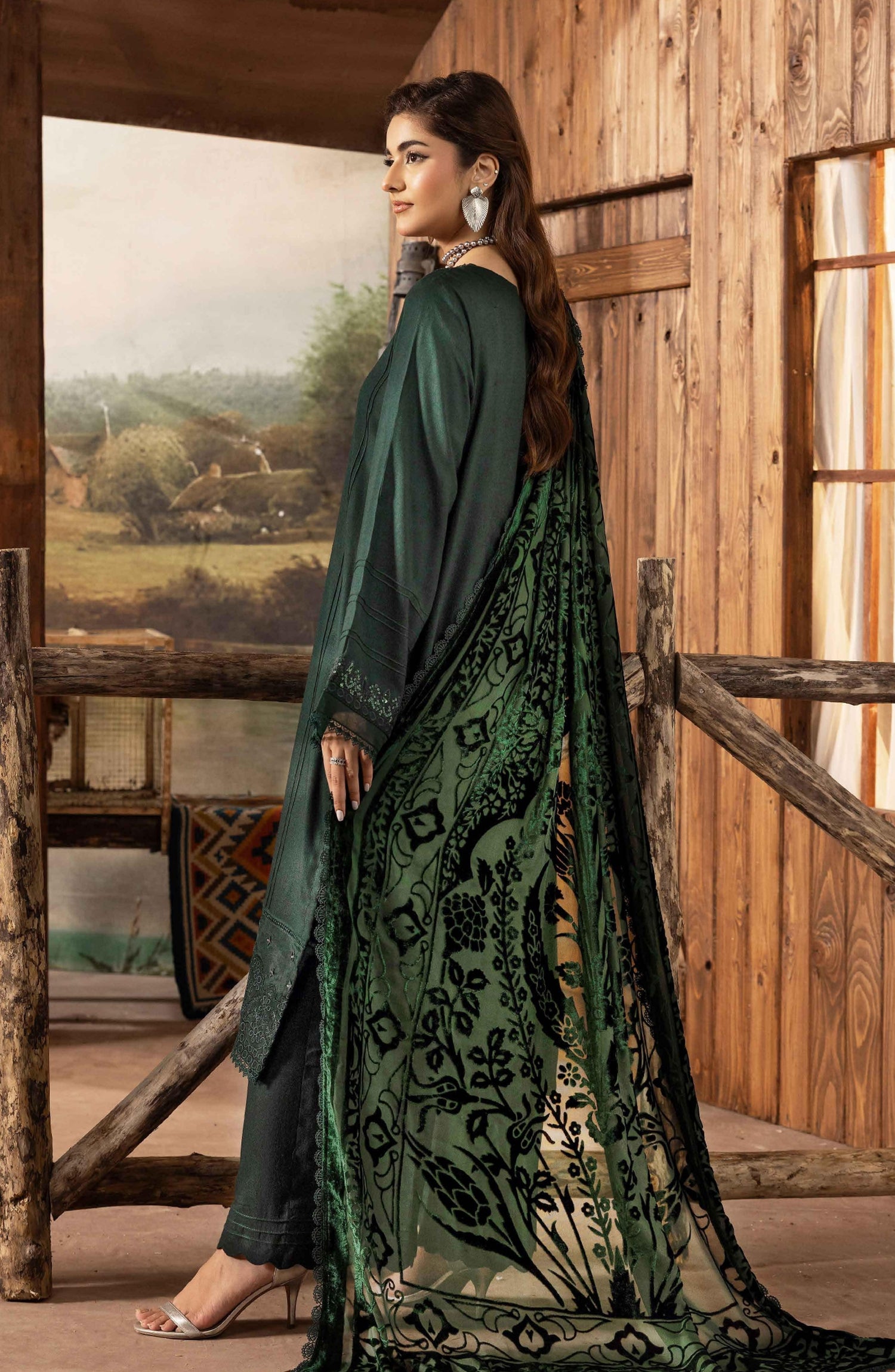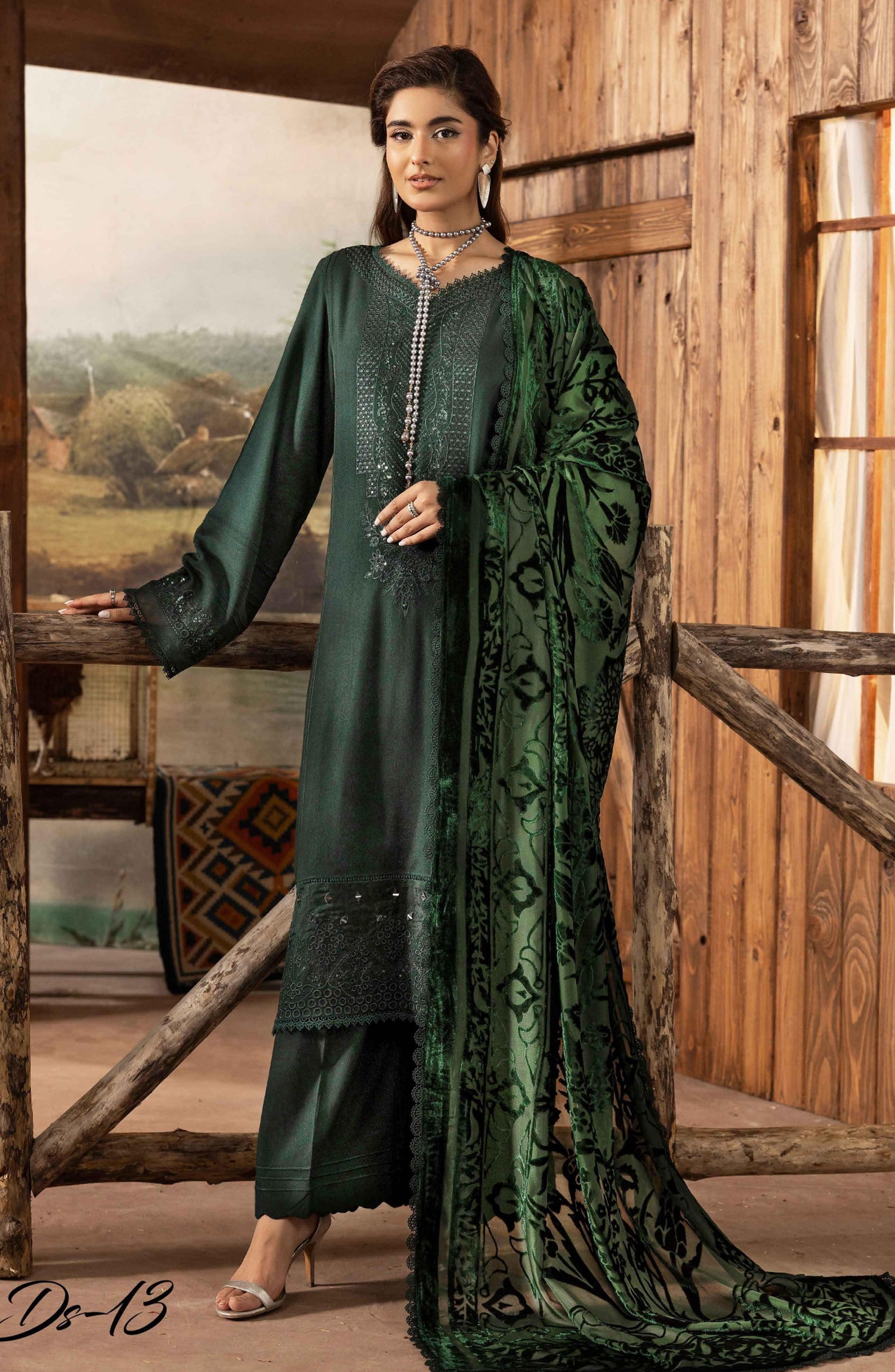Premium Embroidered Leather Peach Unstitched Suit with velvet palachi shawl