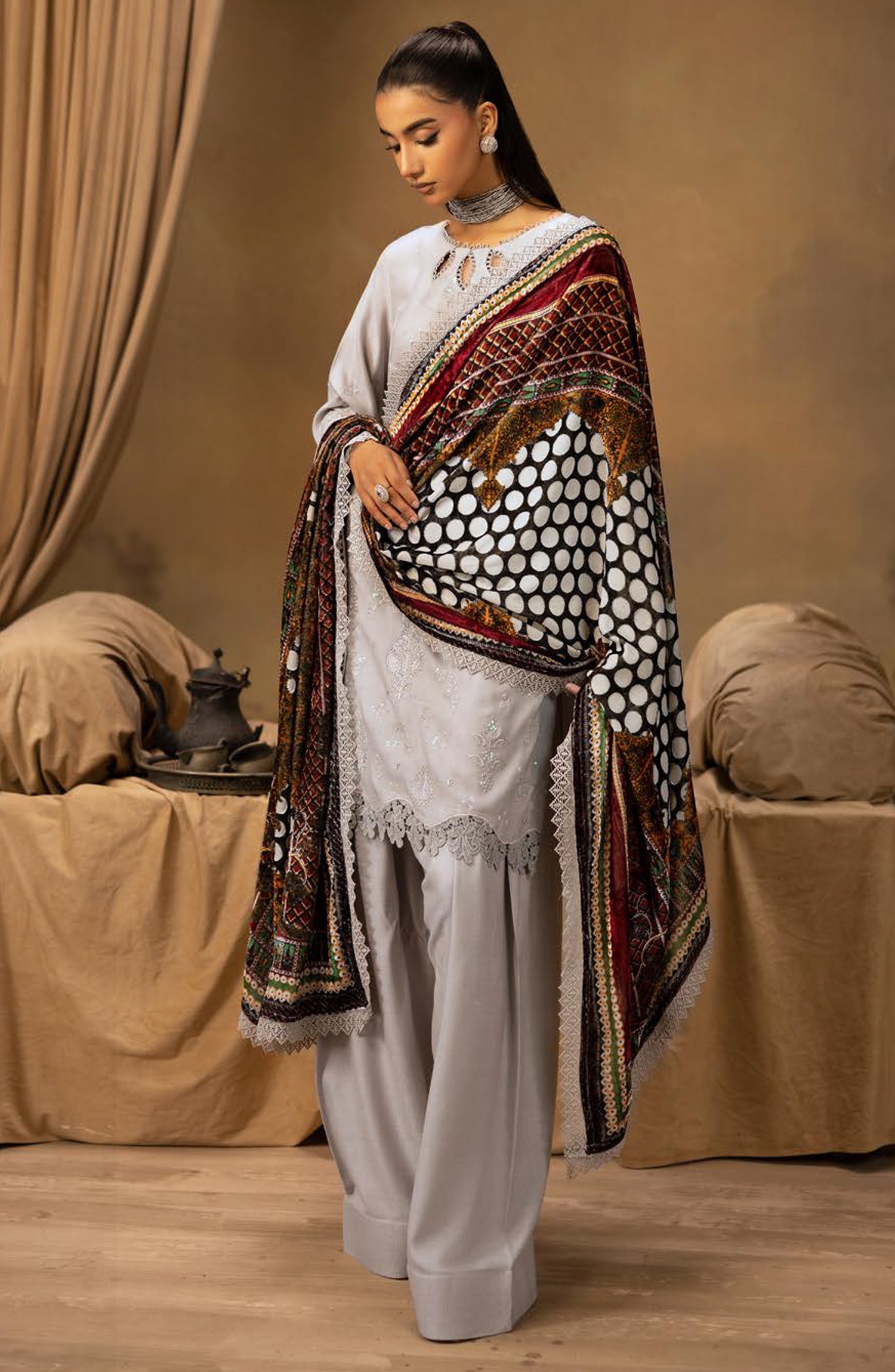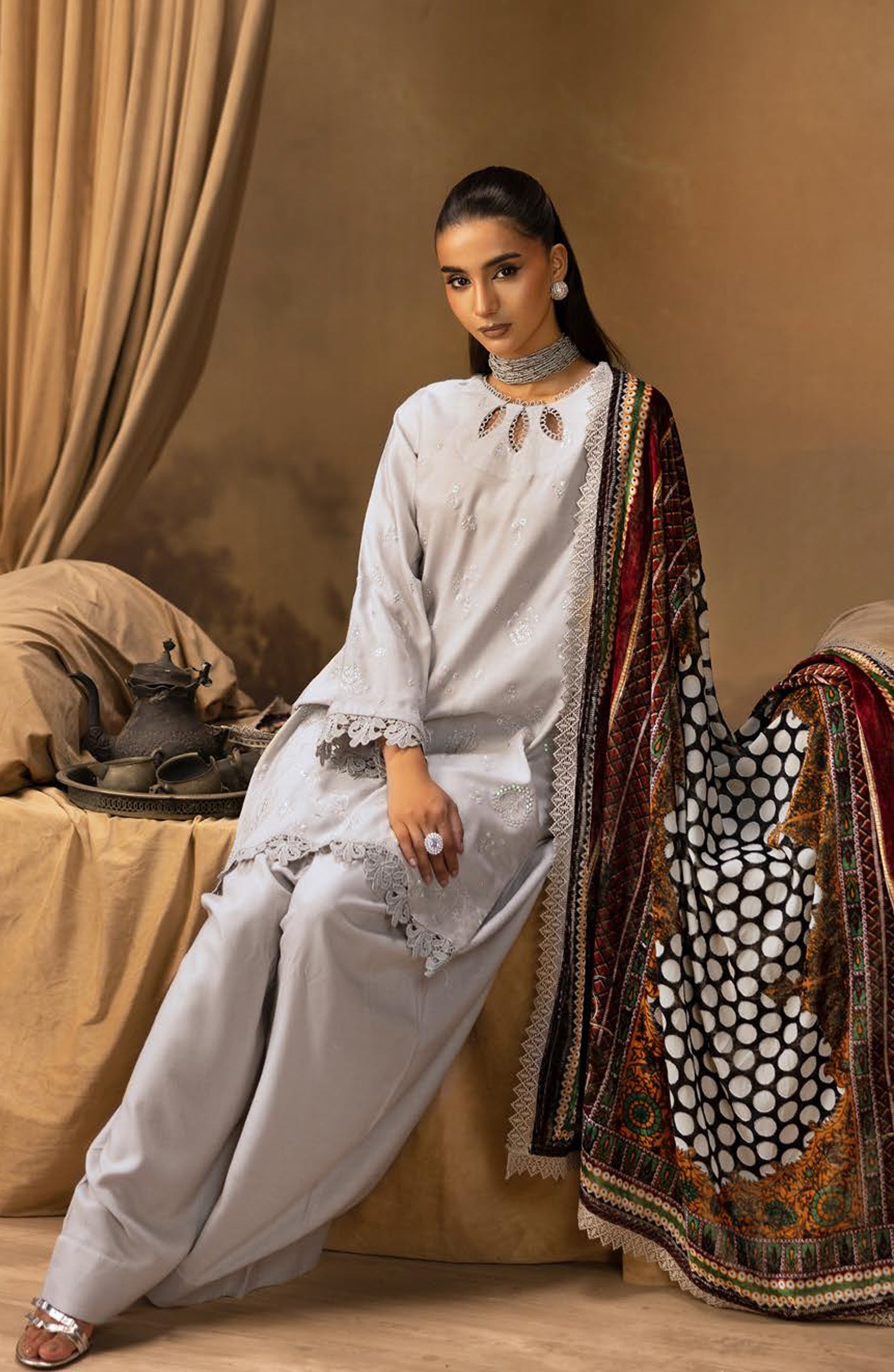 Dastan by Riaz Arts Embroidered Leather Peach Unstitched 3 Piece Suit - DS-37 - RA25DTN - Grey - Winter Collection