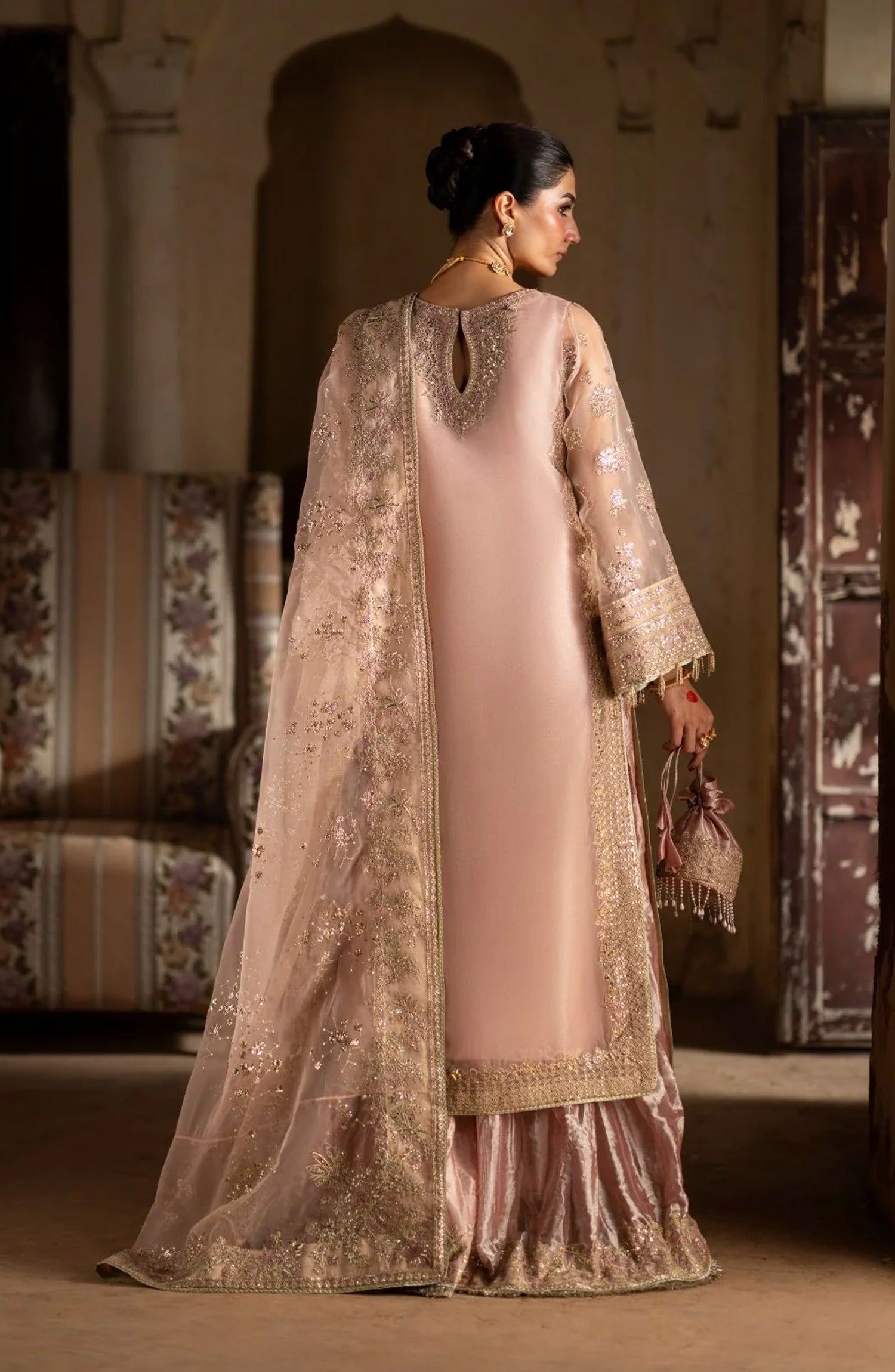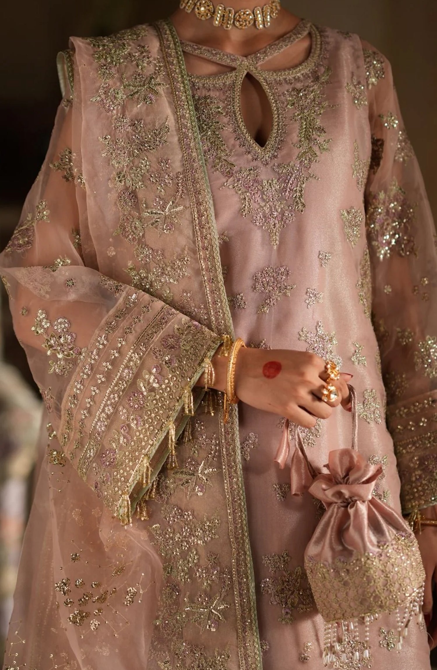 Resham and sequin embroidered organza back neckline