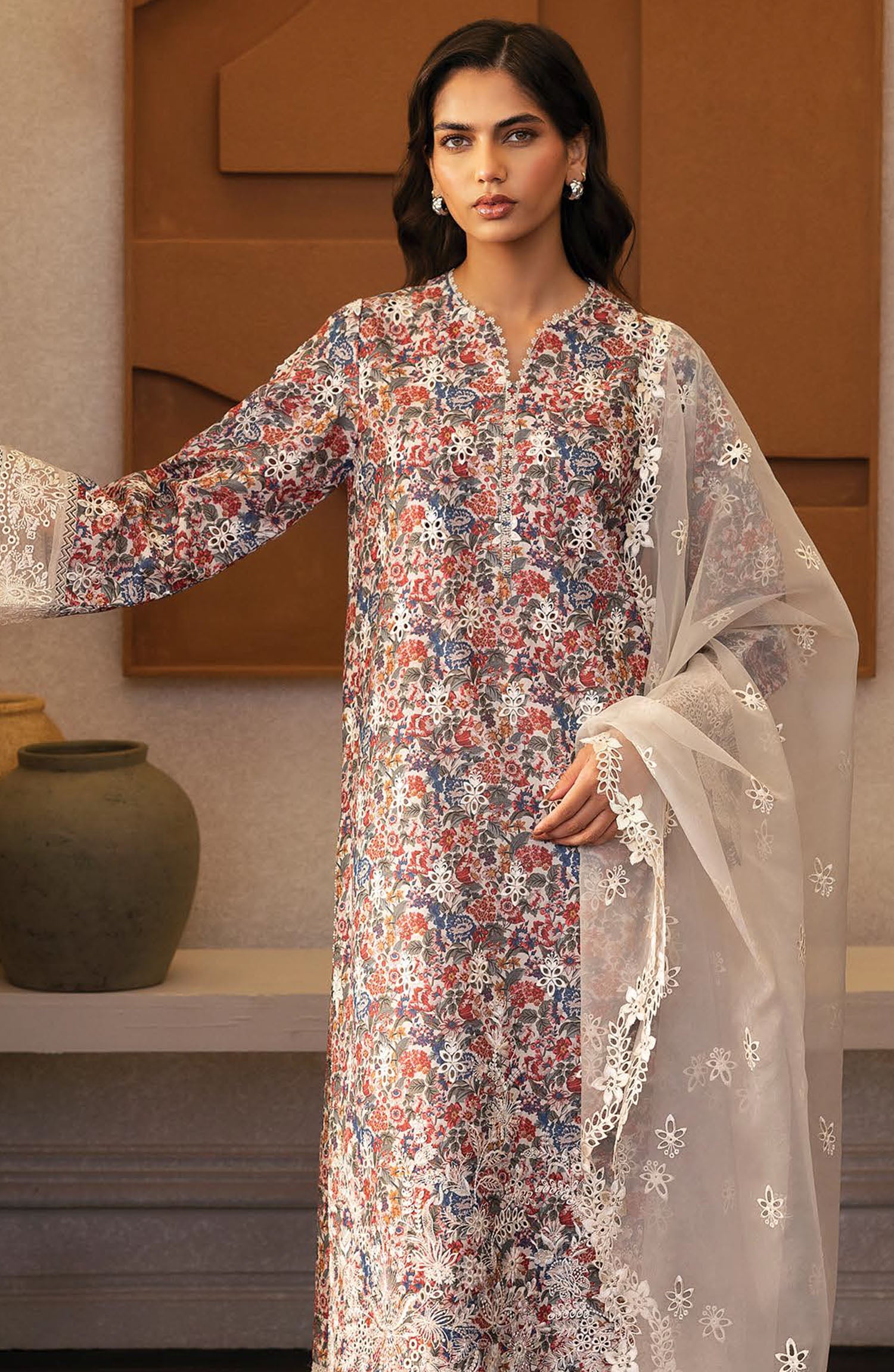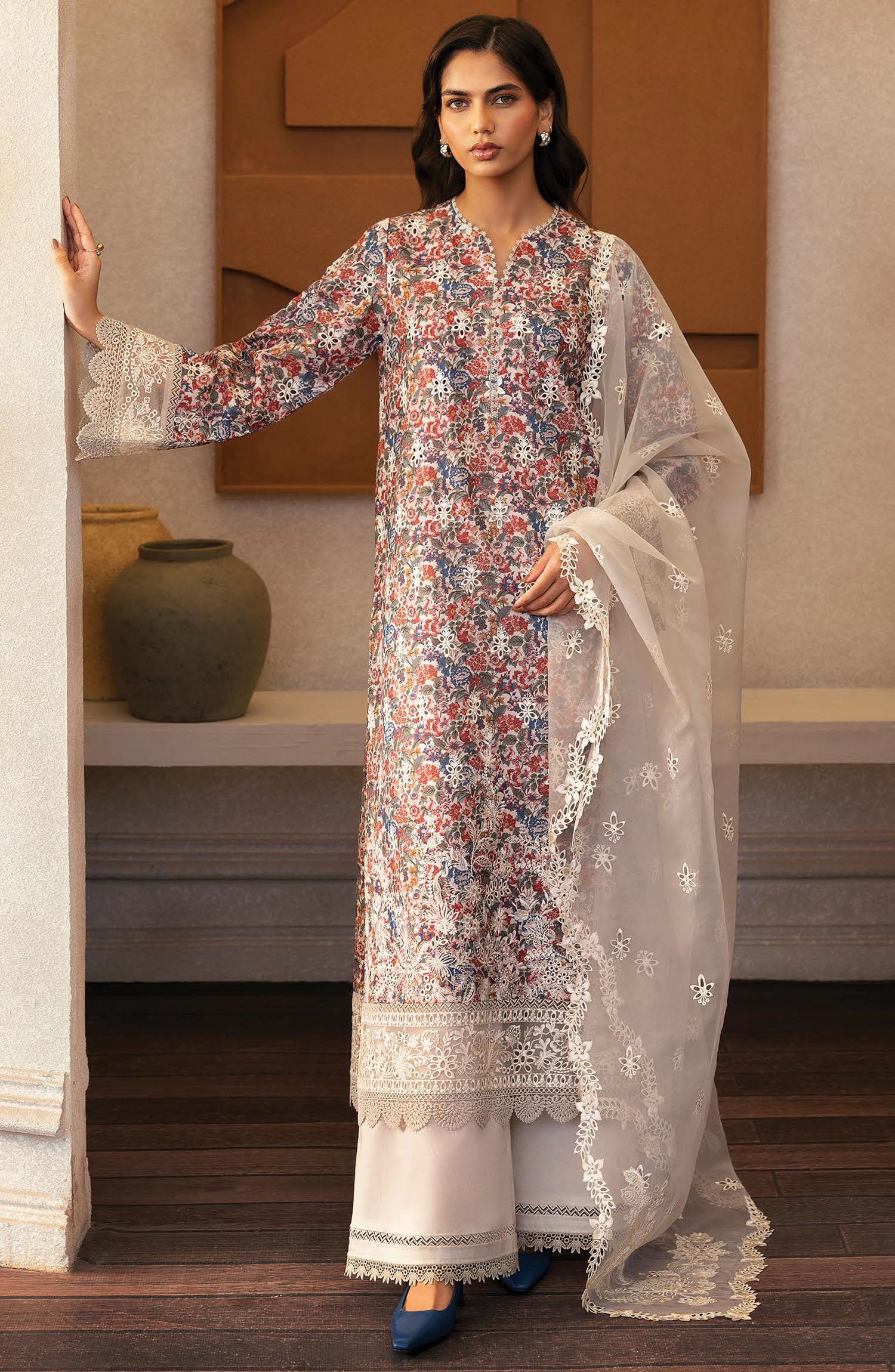 The standard style comes as a long-sleeved kameez with dupatta and trouser/shawlar.