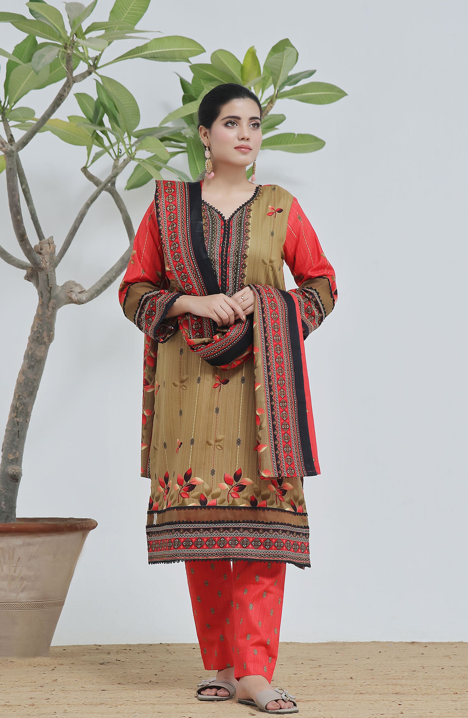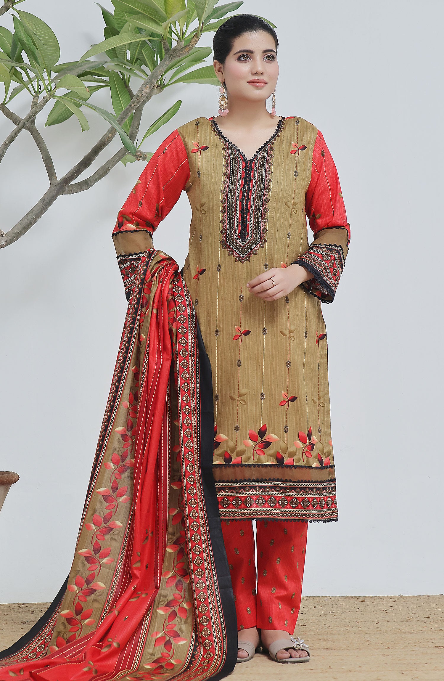 The standard style comes as a long-sleeved kameez with dupatta and trouser/shawlar.