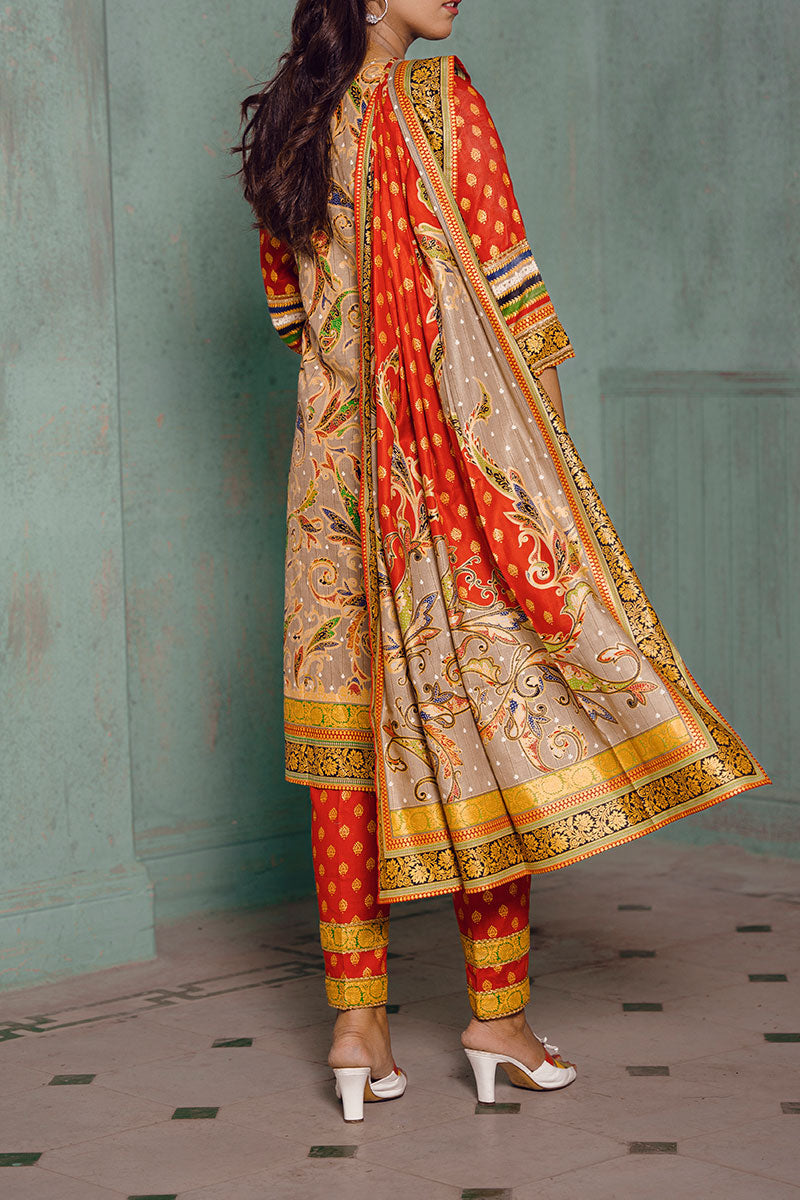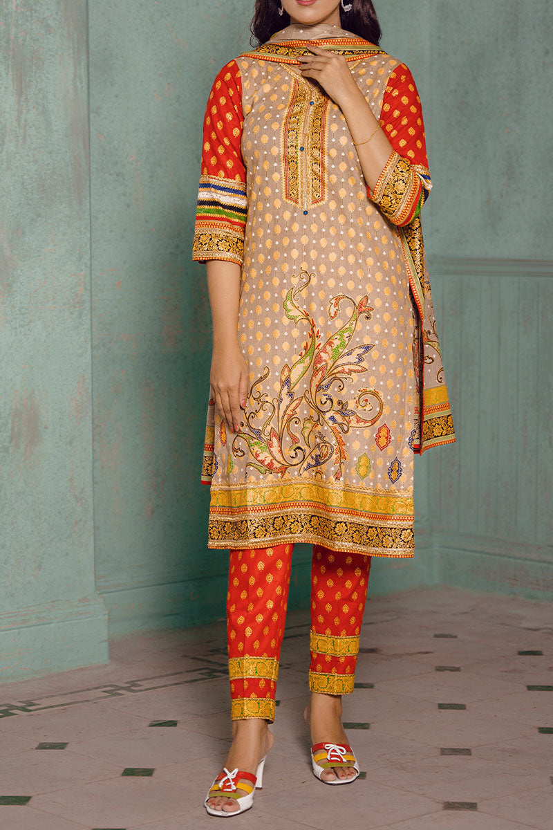 The standard style comes as a long-sleeved kameez with dupatta and trouser/shawlar.