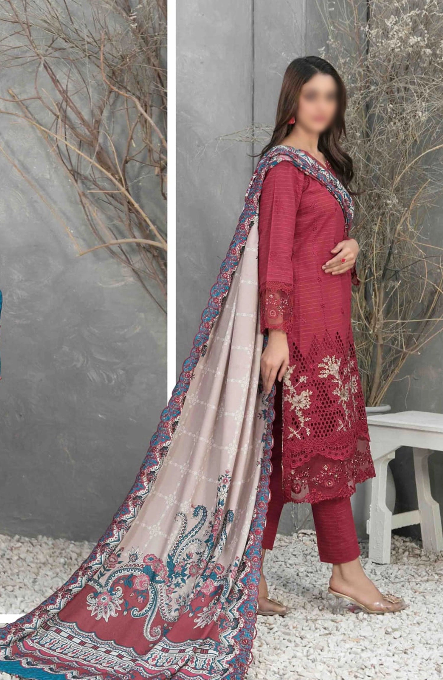 Dimah - Embroidered Schiffli Khaddar Collection has been styled in the image for photography and illustrative purposes.