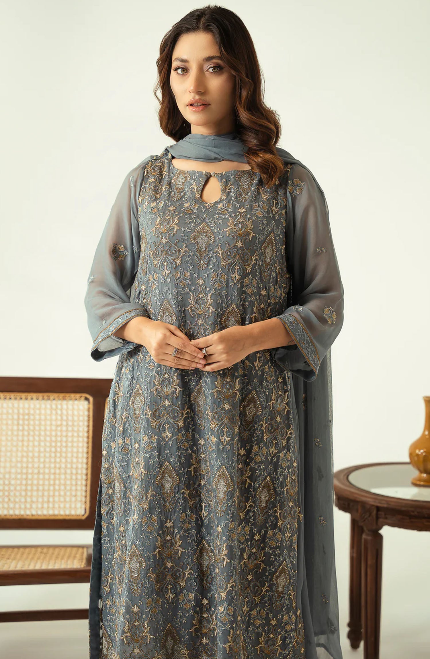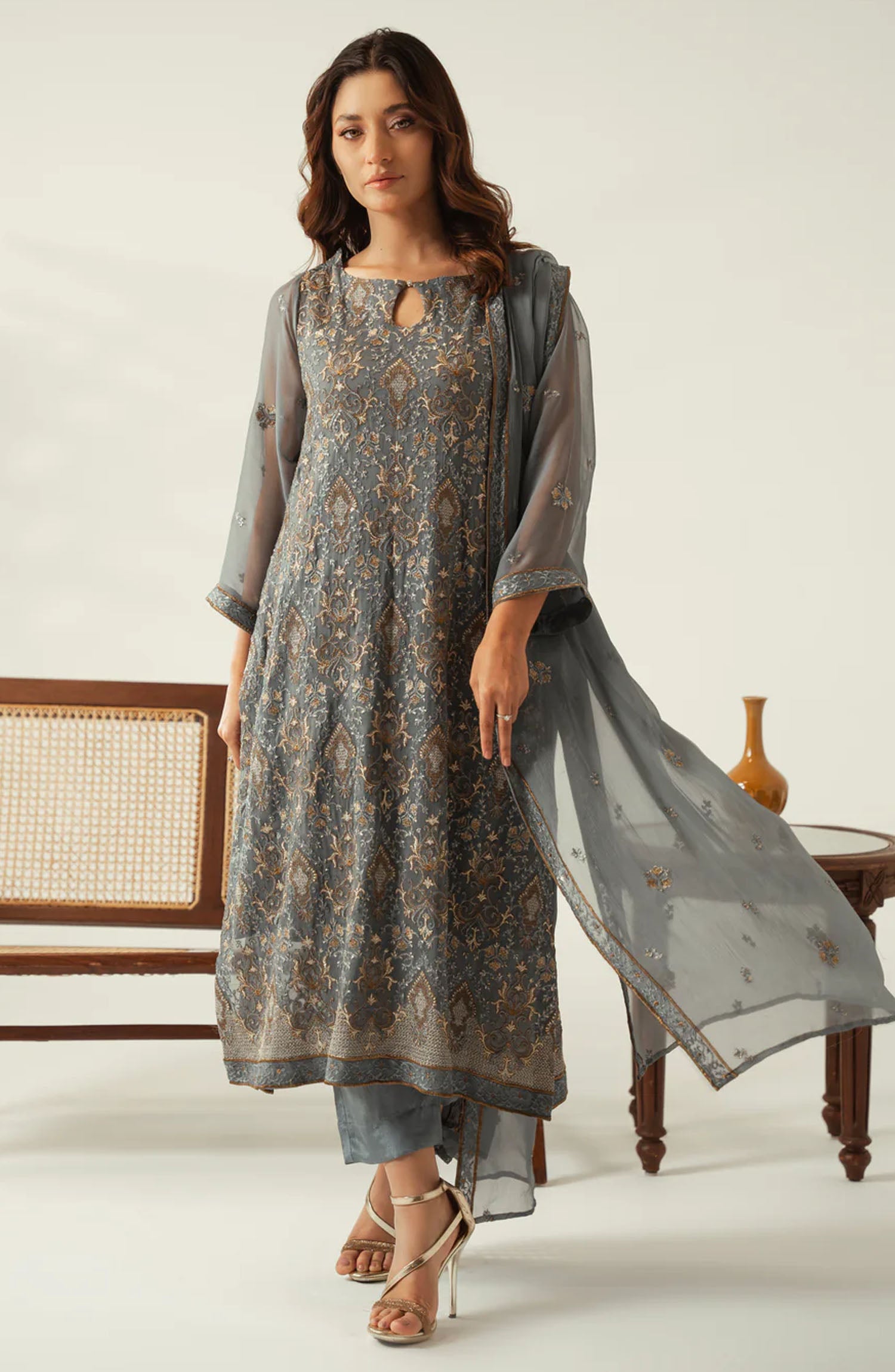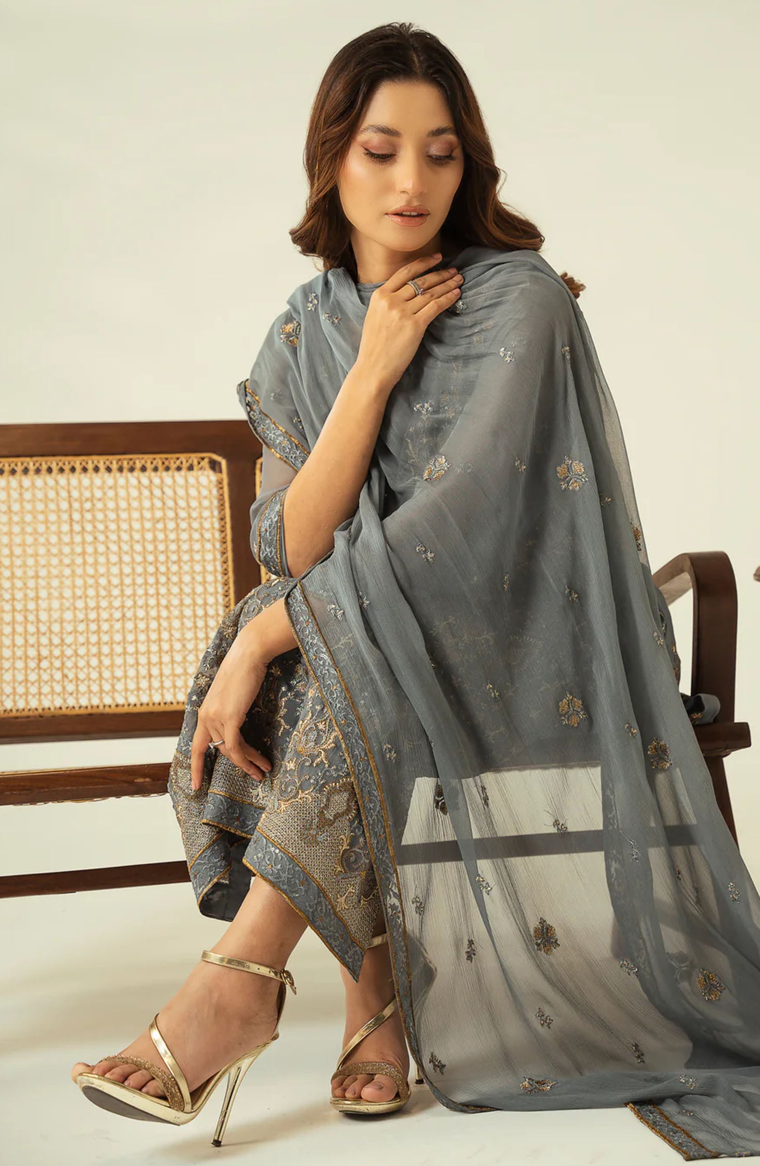 Diva by Zouj Embroidered Chiffon Unstitched 3 Piece Suit - Silver Charm - ZJ25DFL - Grey - Festive Collection