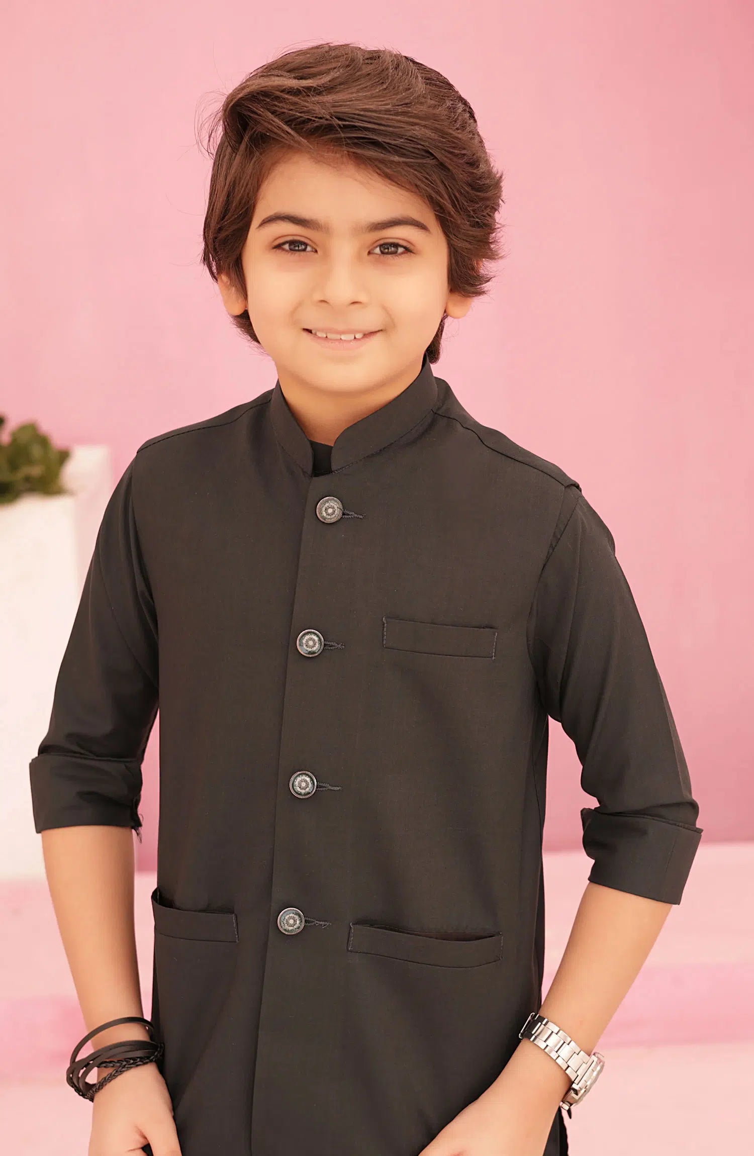 The waistcoat is of blended suiting fabric that adds a stylish touch to the outfit. It's made of a contrasting fabric and features intricate detailing like buttons. The kurta is made from smooth and comfortable wash and wear fabric, and it can have intricate detailing work on the collar, cuffs, or front panel. It's a versatile and elegant outfit choice for both formal and casual occasions.
