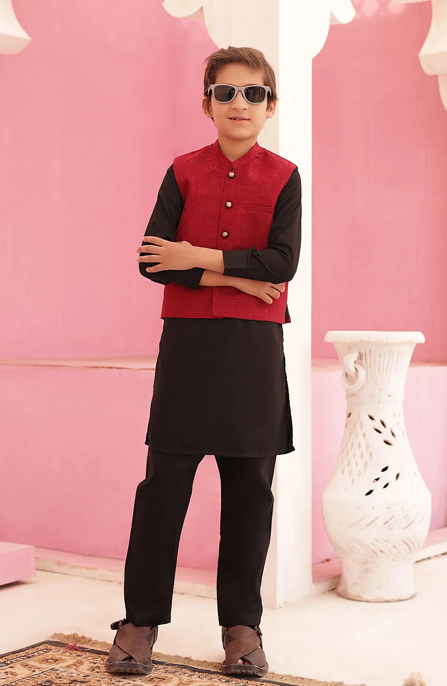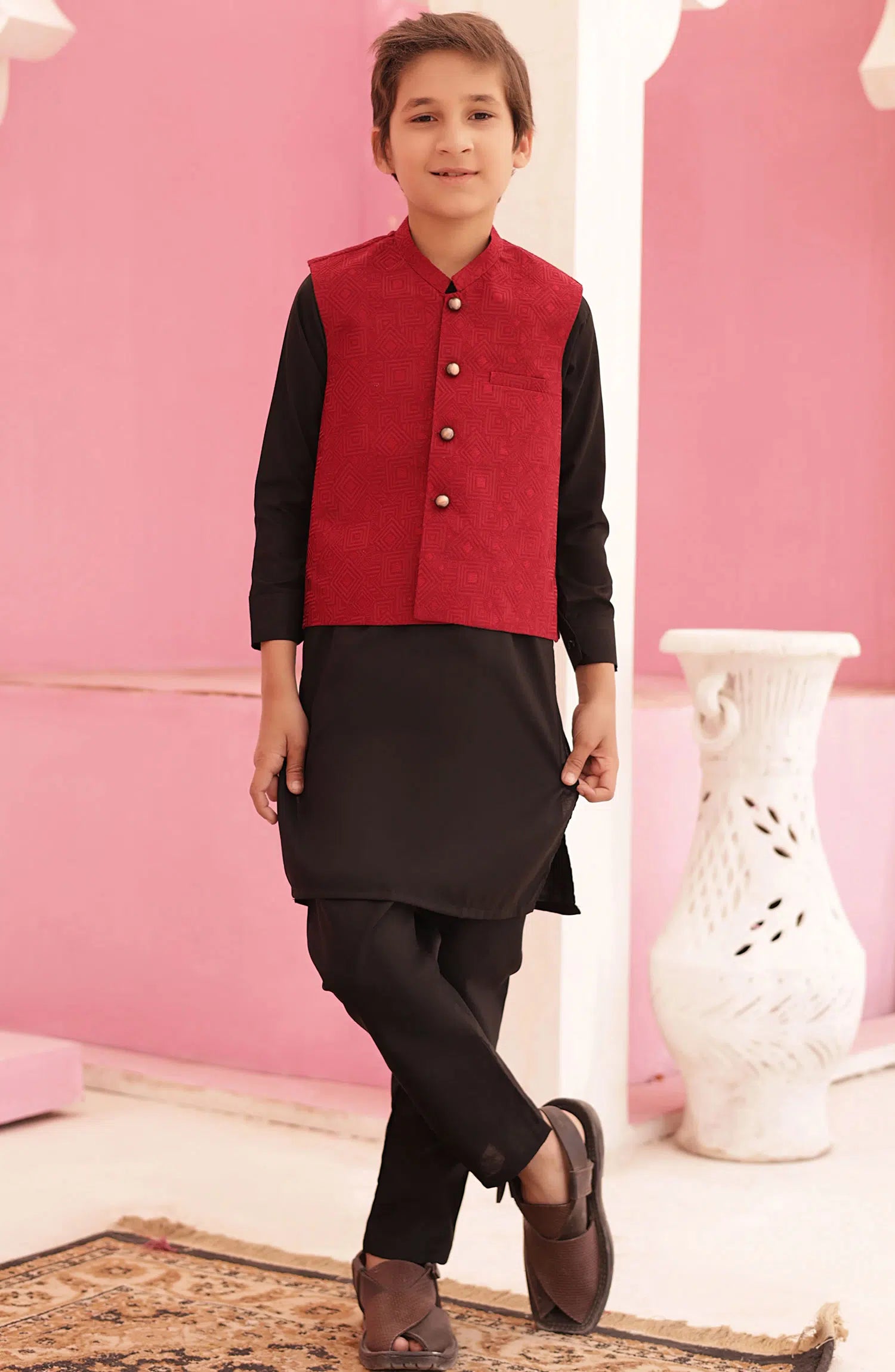 The waistcoat is of blended suiting fabric that adds a stylish touch to the outfit. It's made of a contrasting fabric and features intricate detailing like buttons. The kurta is made from smooth and comfortable wash and wear fabric, and it can have intricate detailing work on the collar, cuffs, or front panel. It's a versatile and elegant outfit choice for both formal and casual occasions.