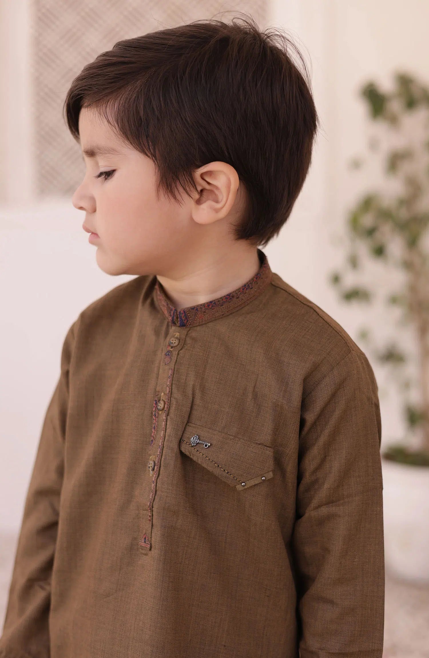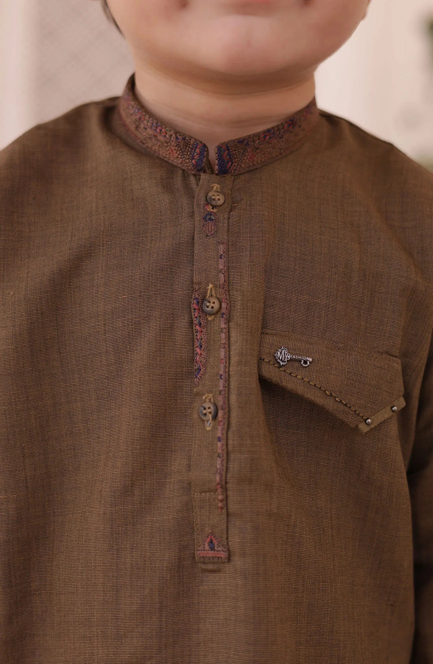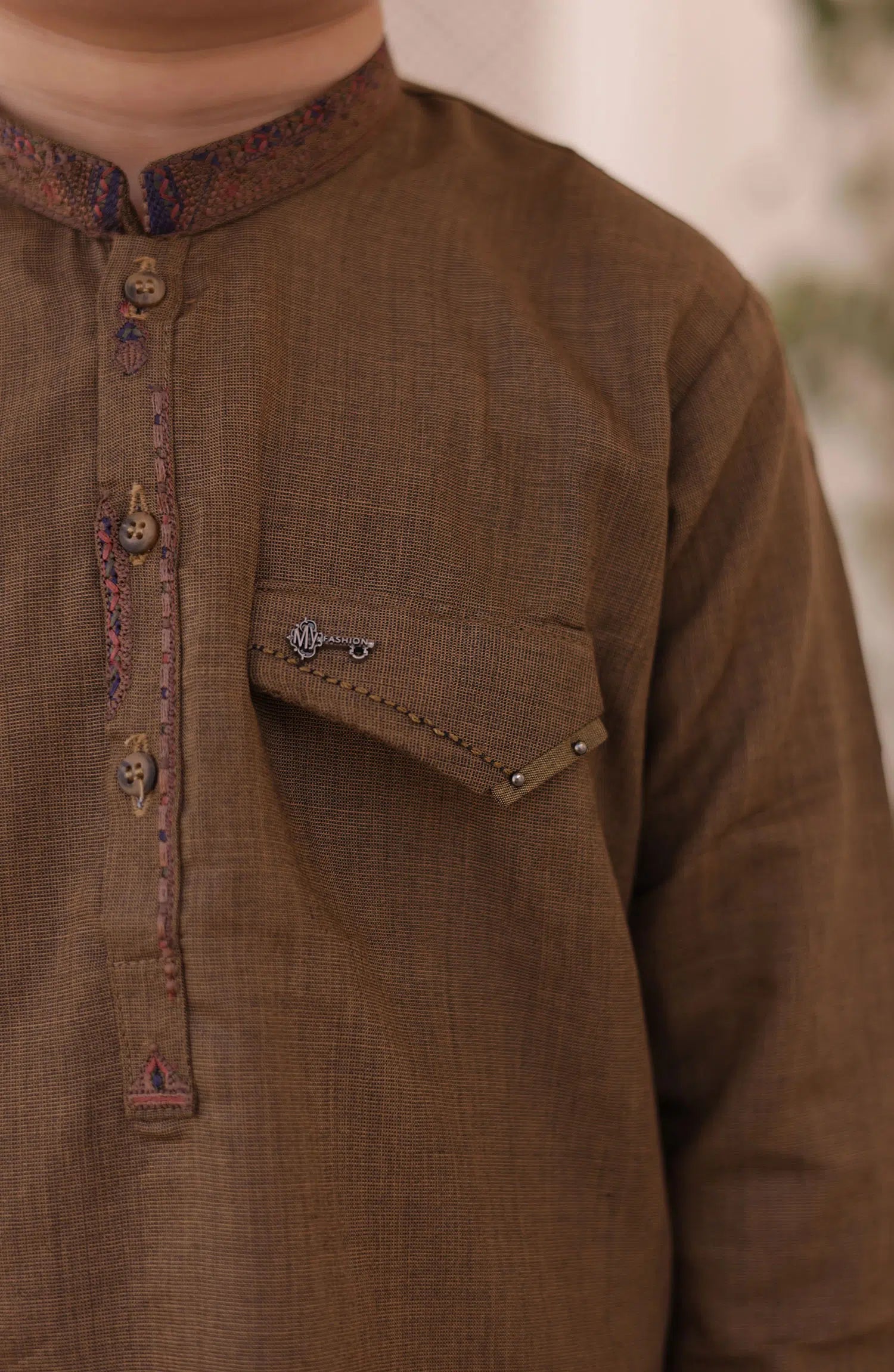 The kurta is a stylish shade of brown and features intricate detailing work, which adds a touch of elegance.