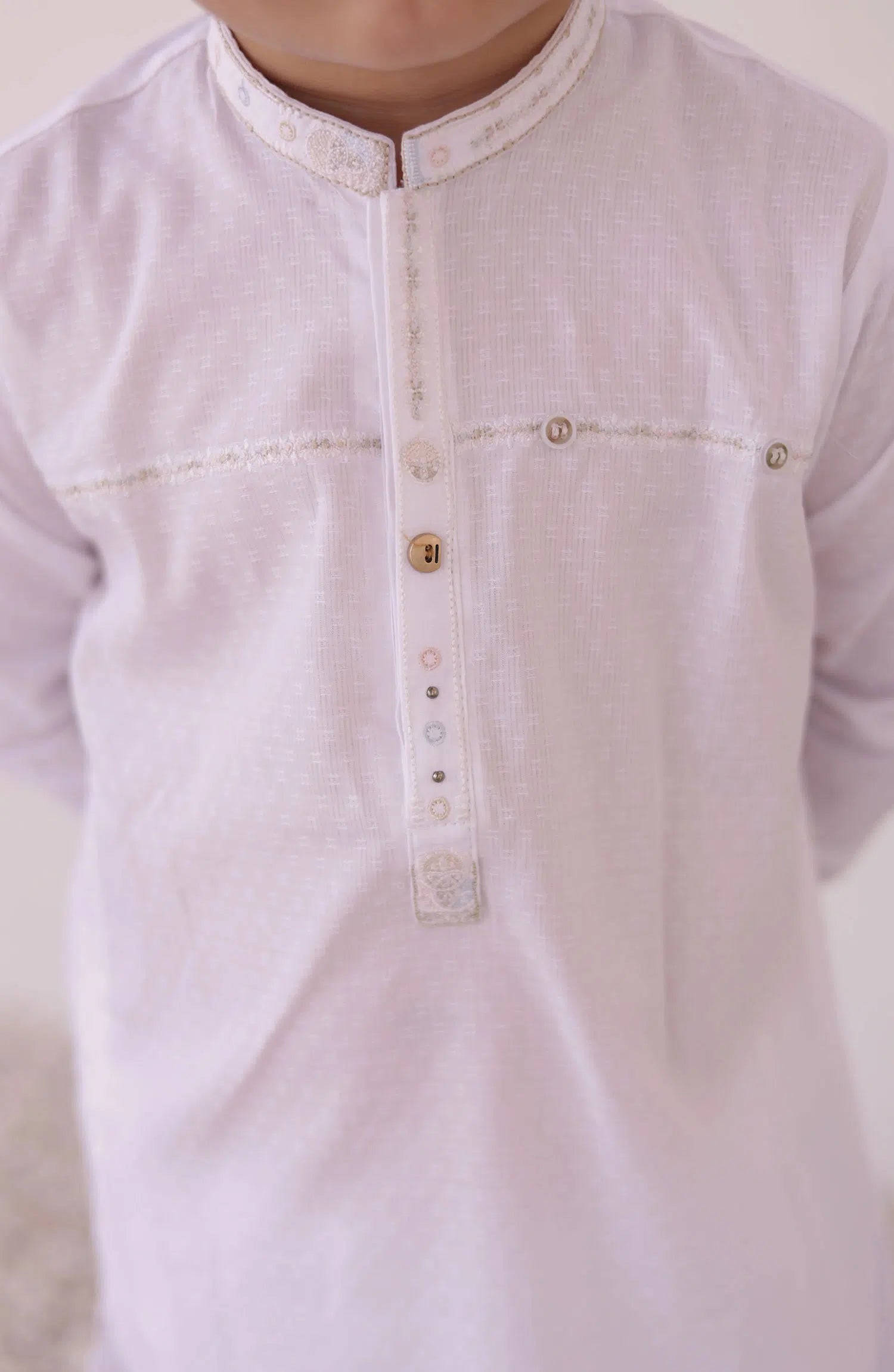 The kurta is a stylish shade of white and features intricate detailing work, which adds a touch of elegance.