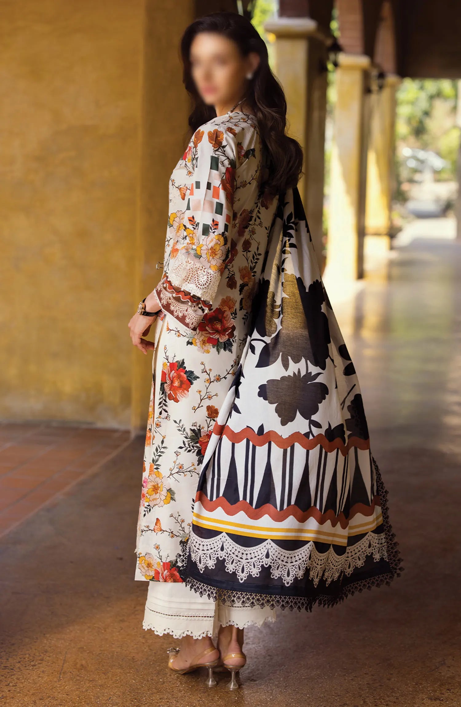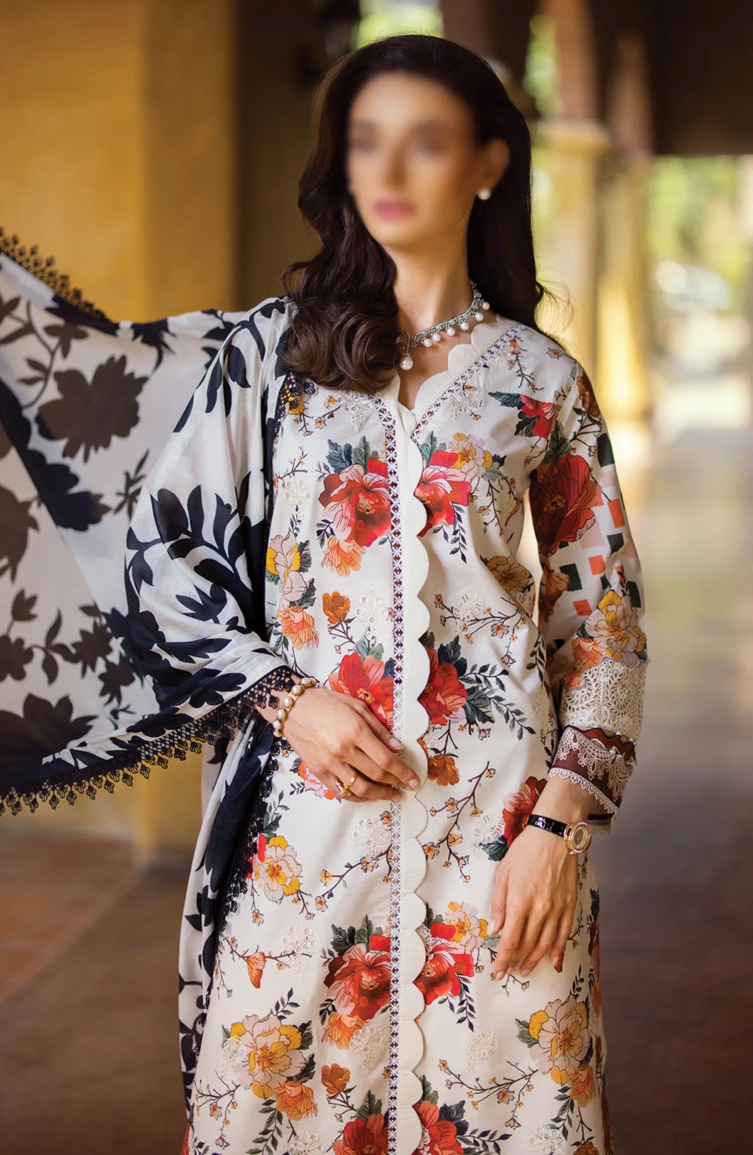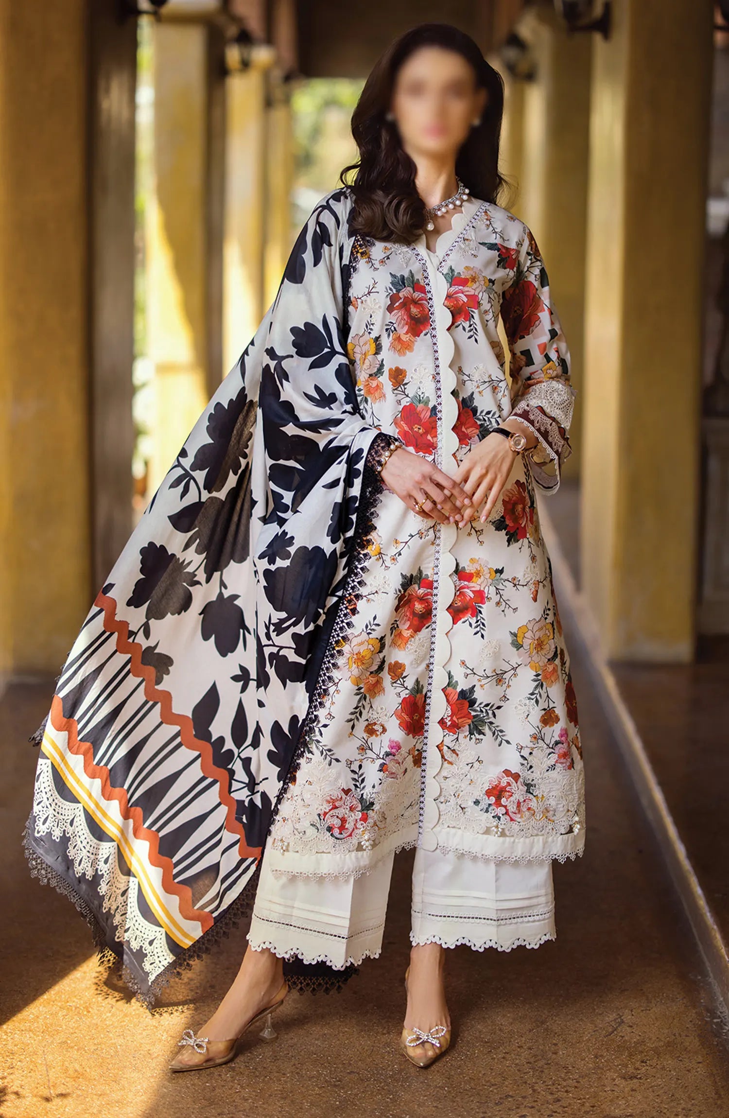 Elaf Print Chikankari Collection 2024 has been styled in the image for photography and illustrative purposes.