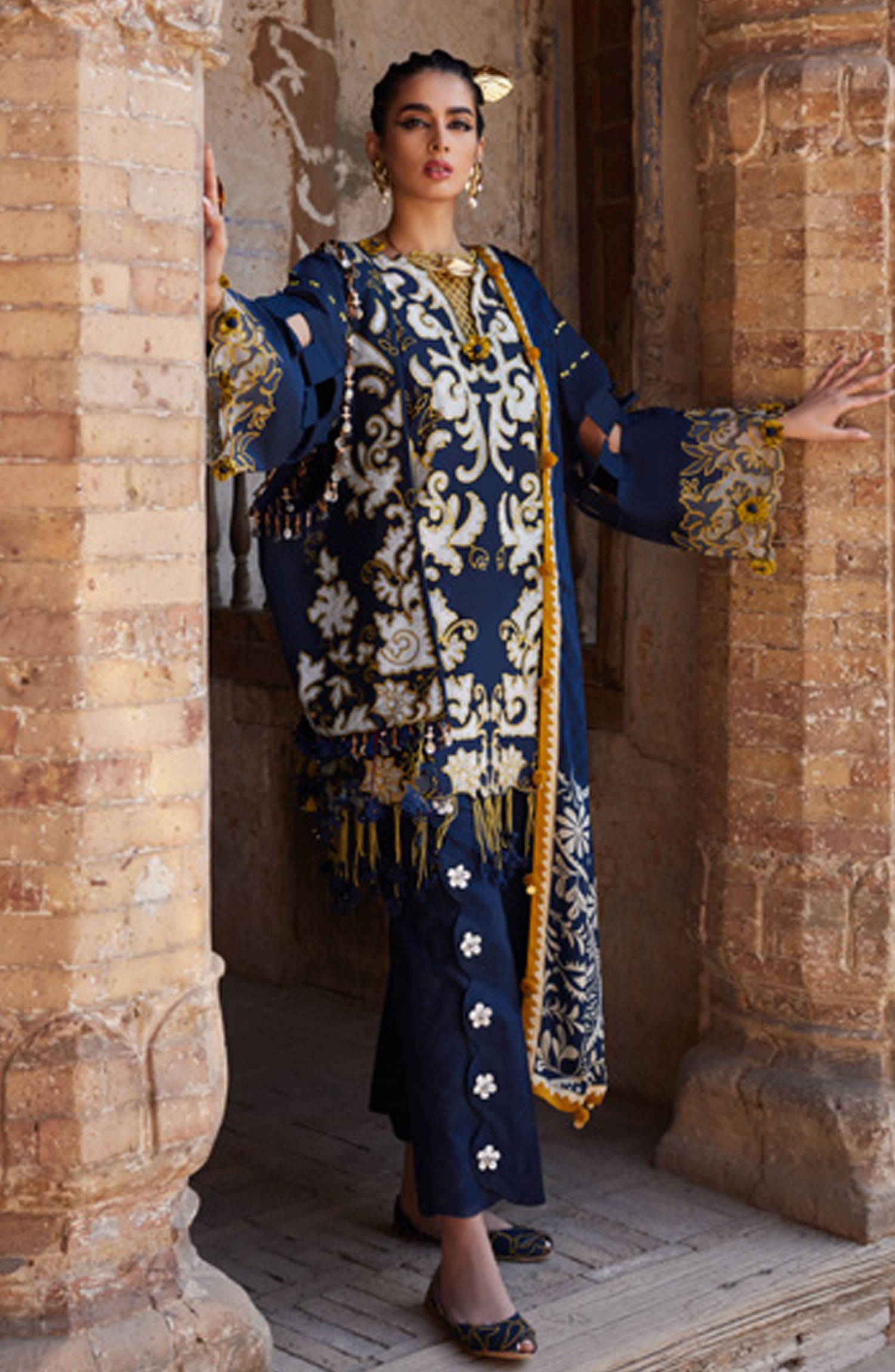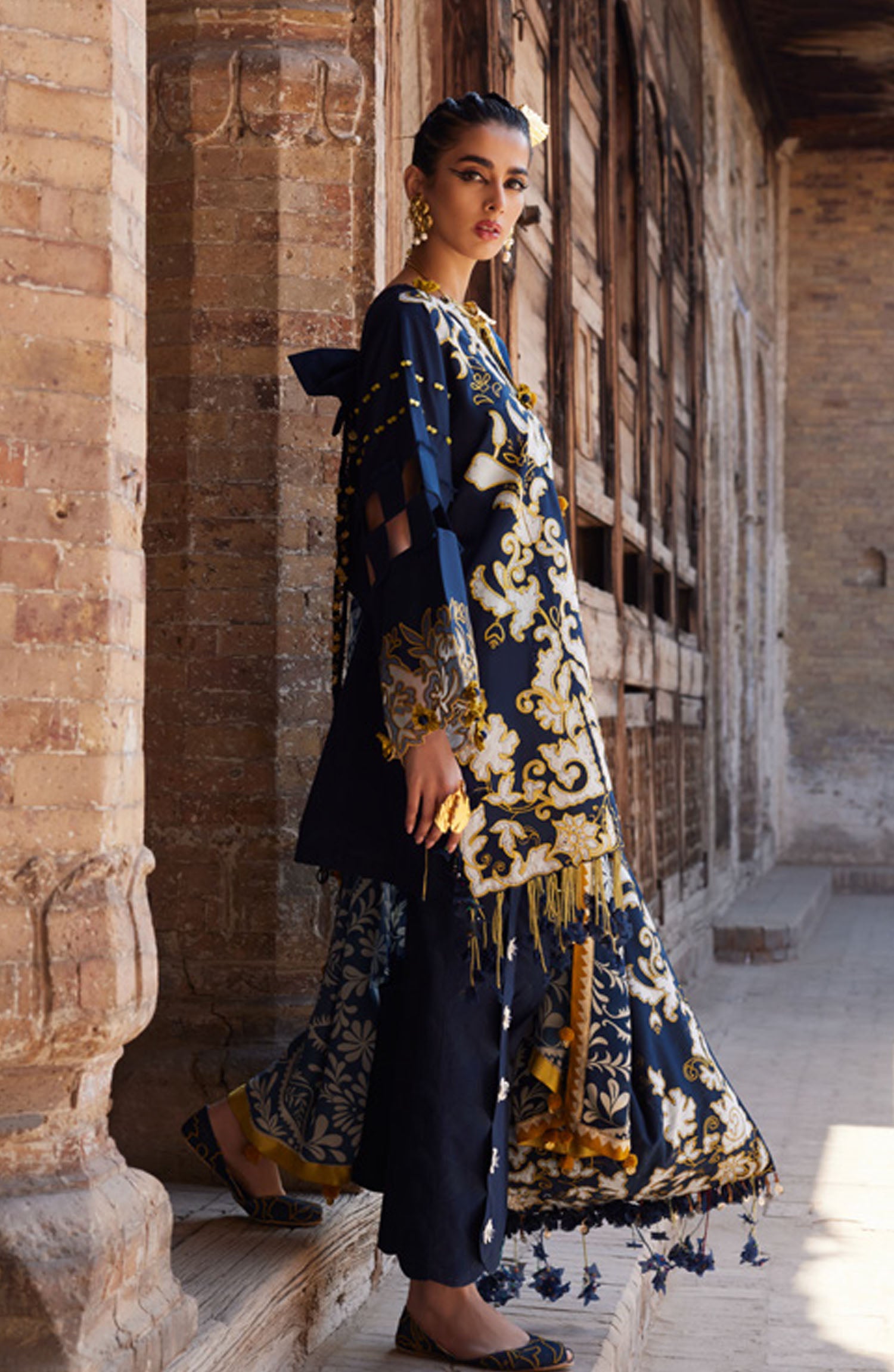The standard style comes as a long-sleeved kameez with dupatta and trouser/shawlar.