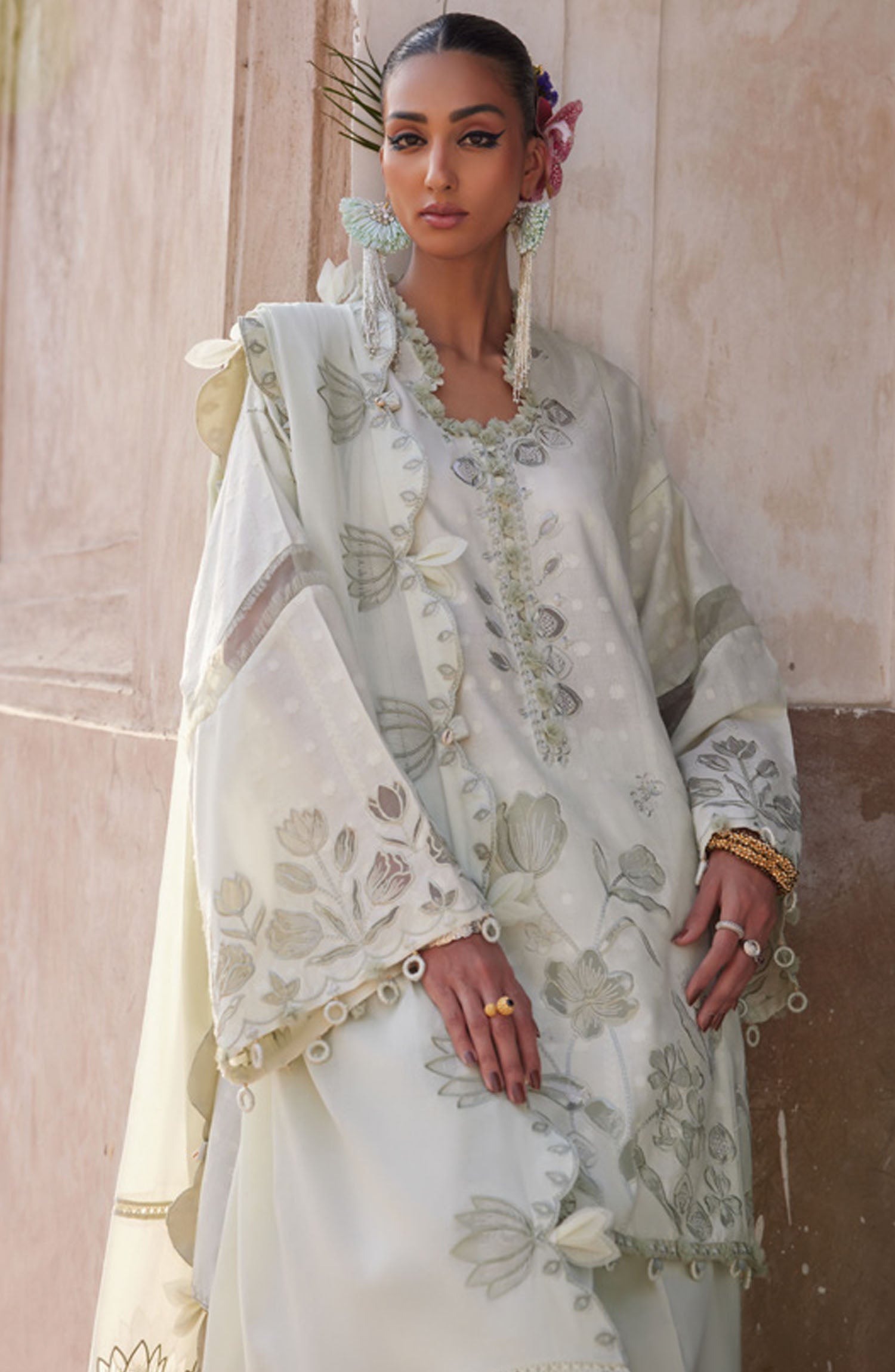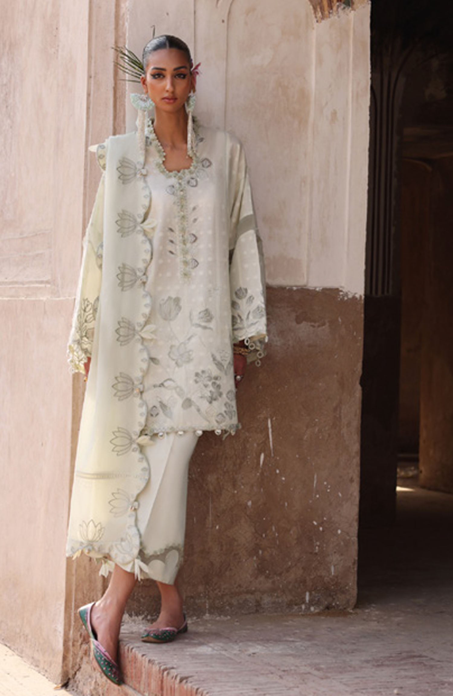 The standard style comes as a long-sleeved kameez with dupatta and trouser/shawlar.