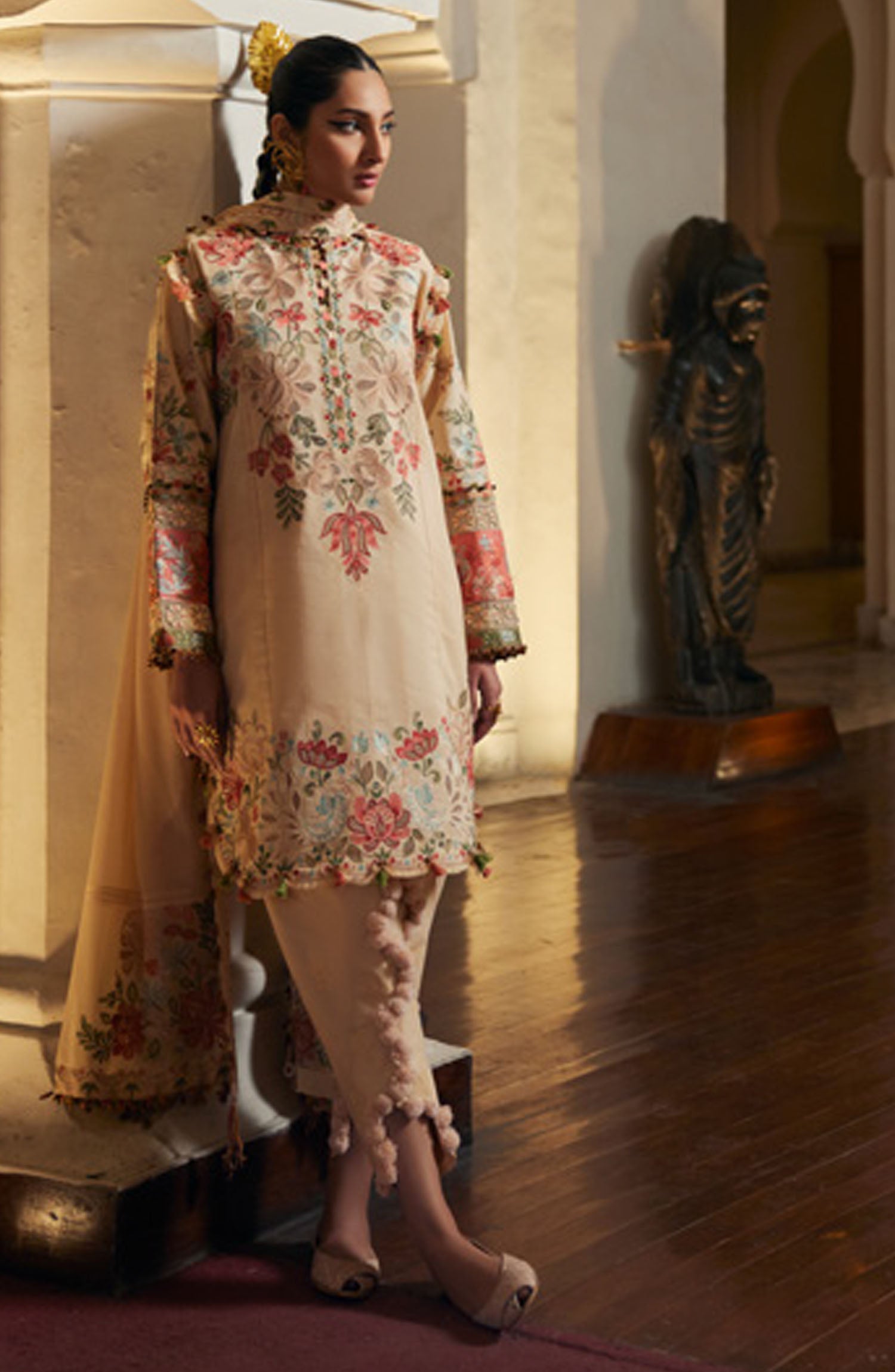 The standard style comes as a long-sleeved kameez with dupatta and trouser/shawlar.