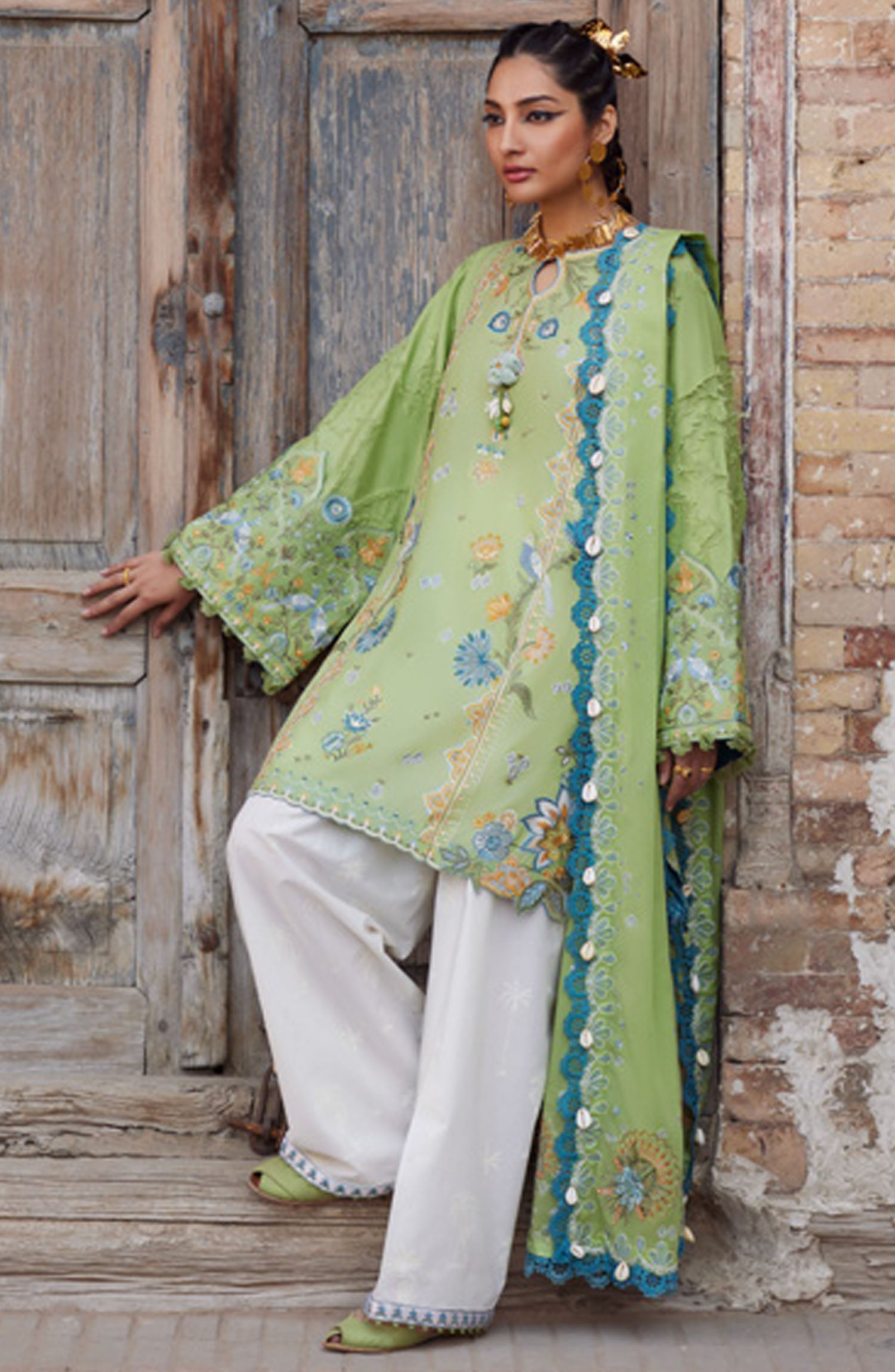 The standard style comes as a long-sleeved kameez with dupatta and trouser/shawlar.