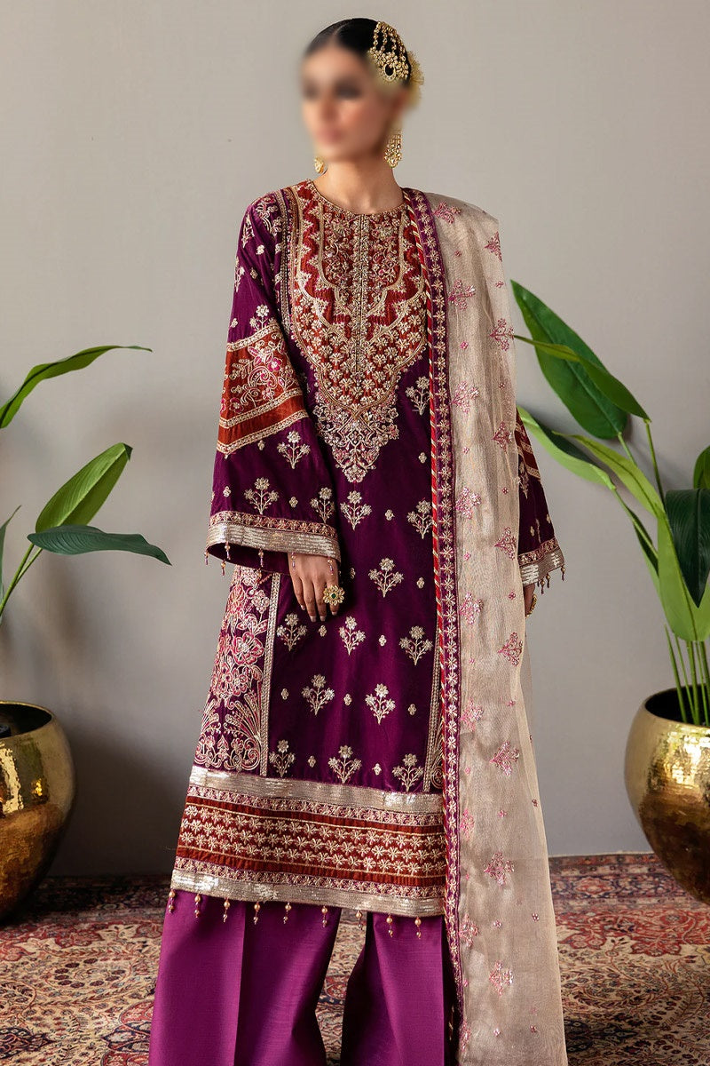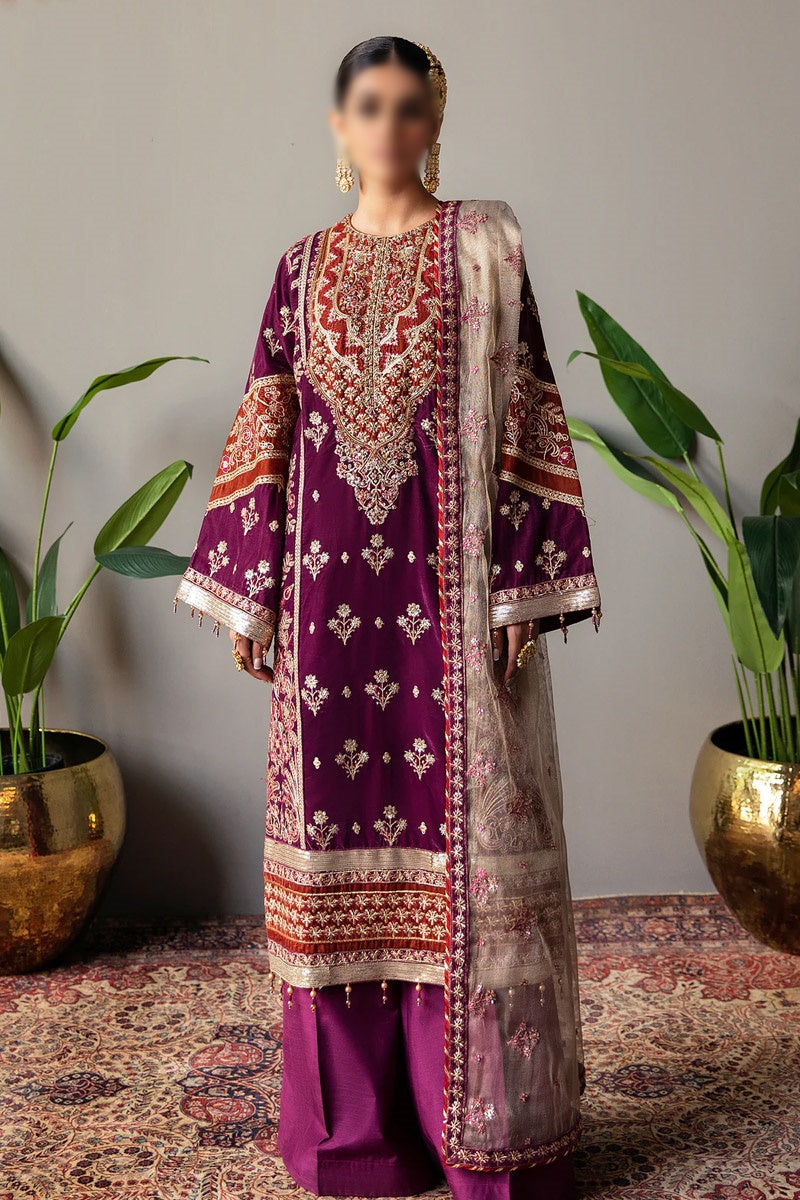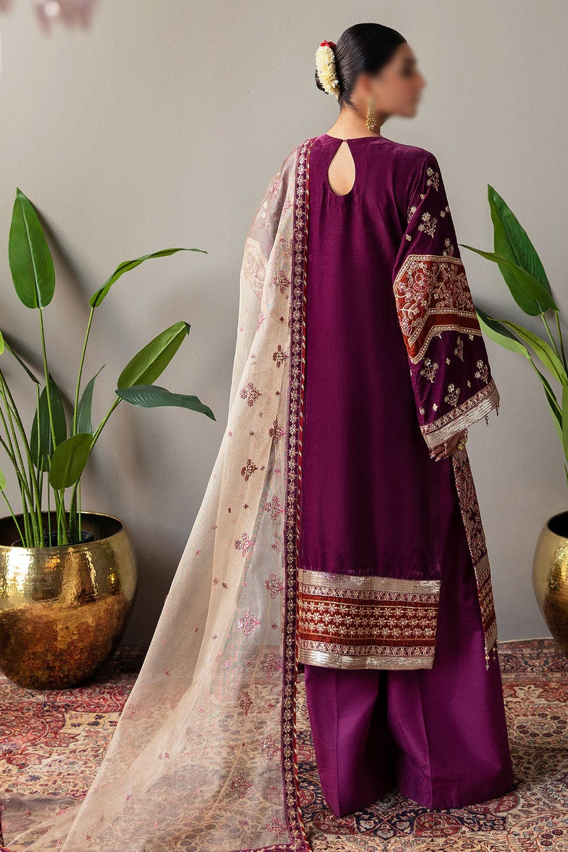 Emaan Adeel MAKHMAL VELVET EDITION 2023 has been styled in the image for photography and illustrative purposes.