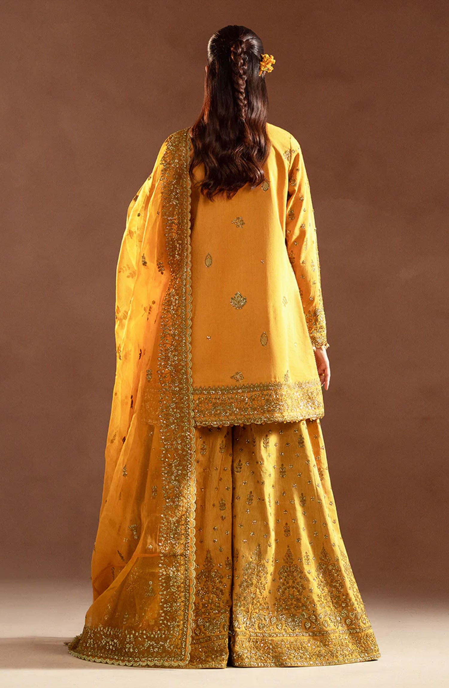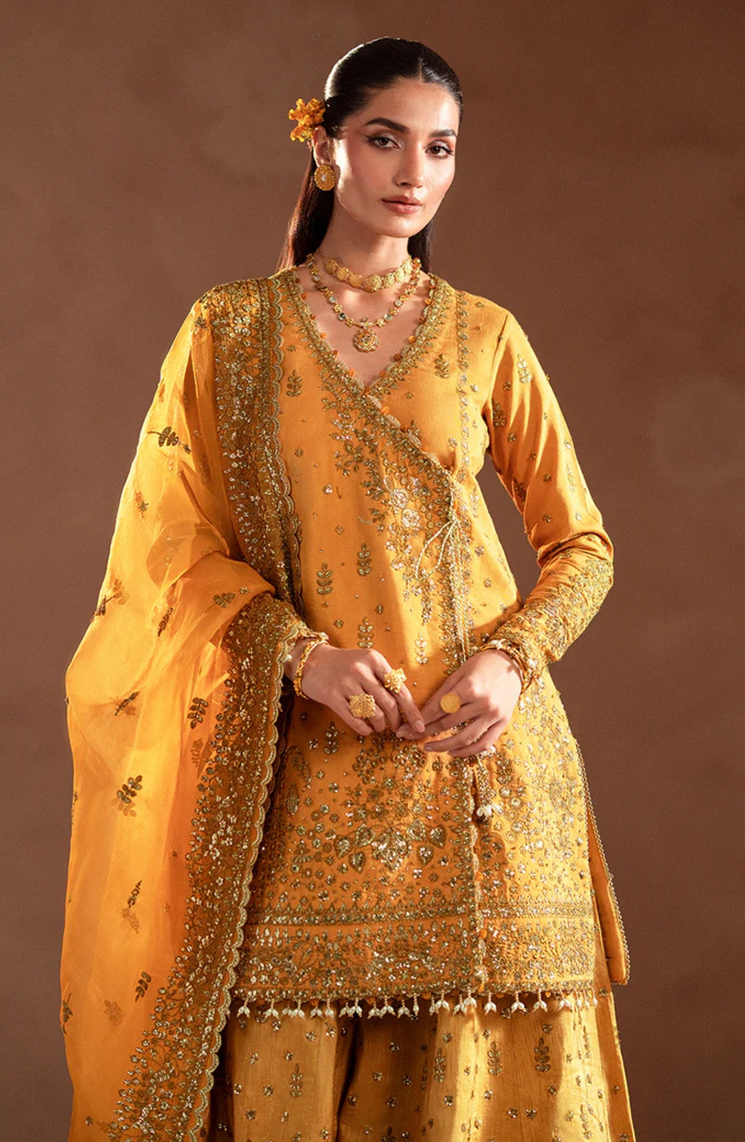Emaan Adeel Selene Unstitched Raw Silk Collection has been styled in the image for photography and illustrative purposes.
