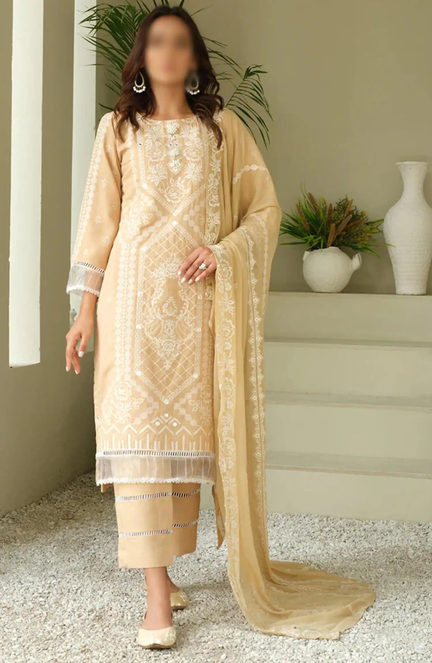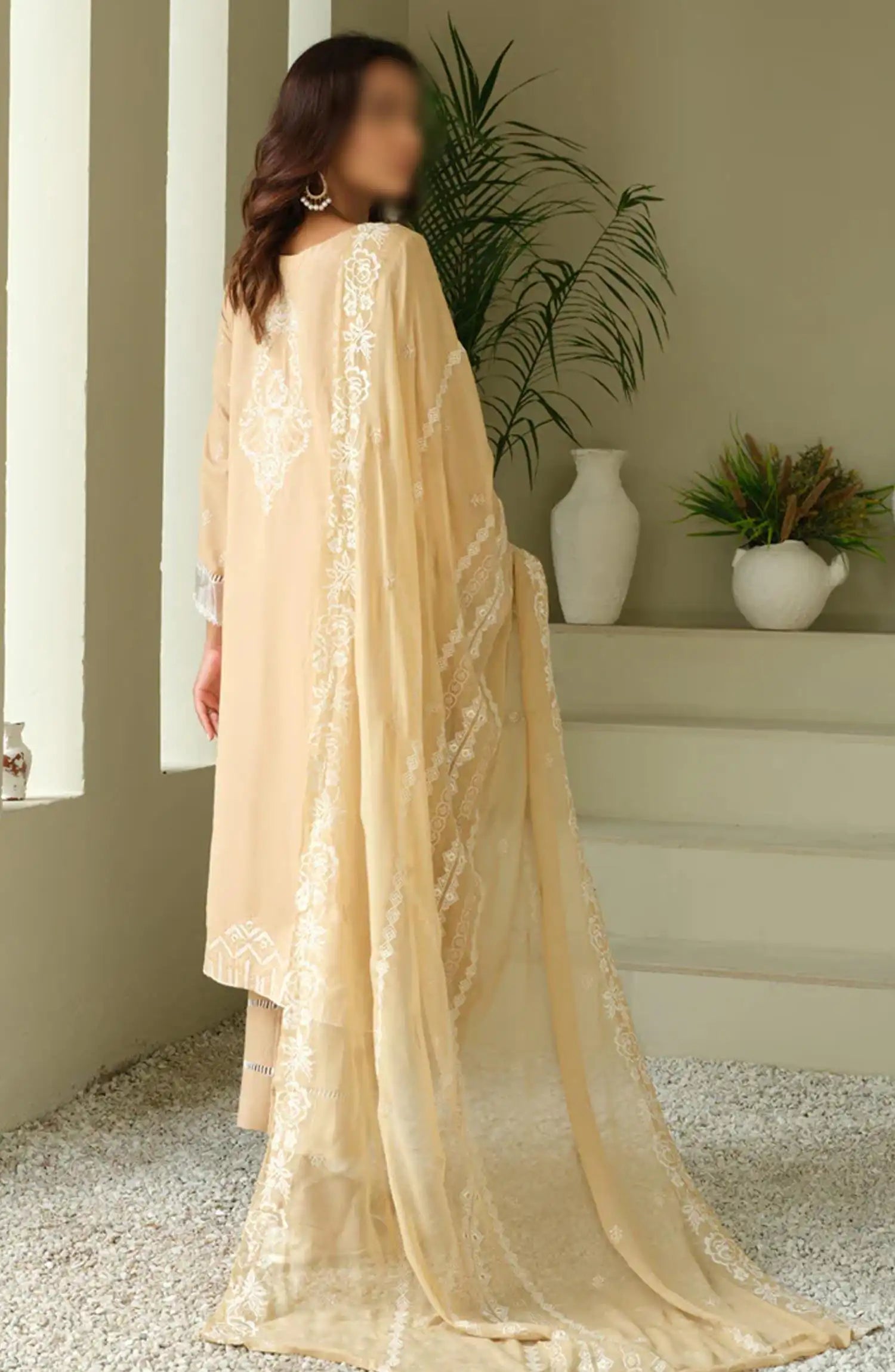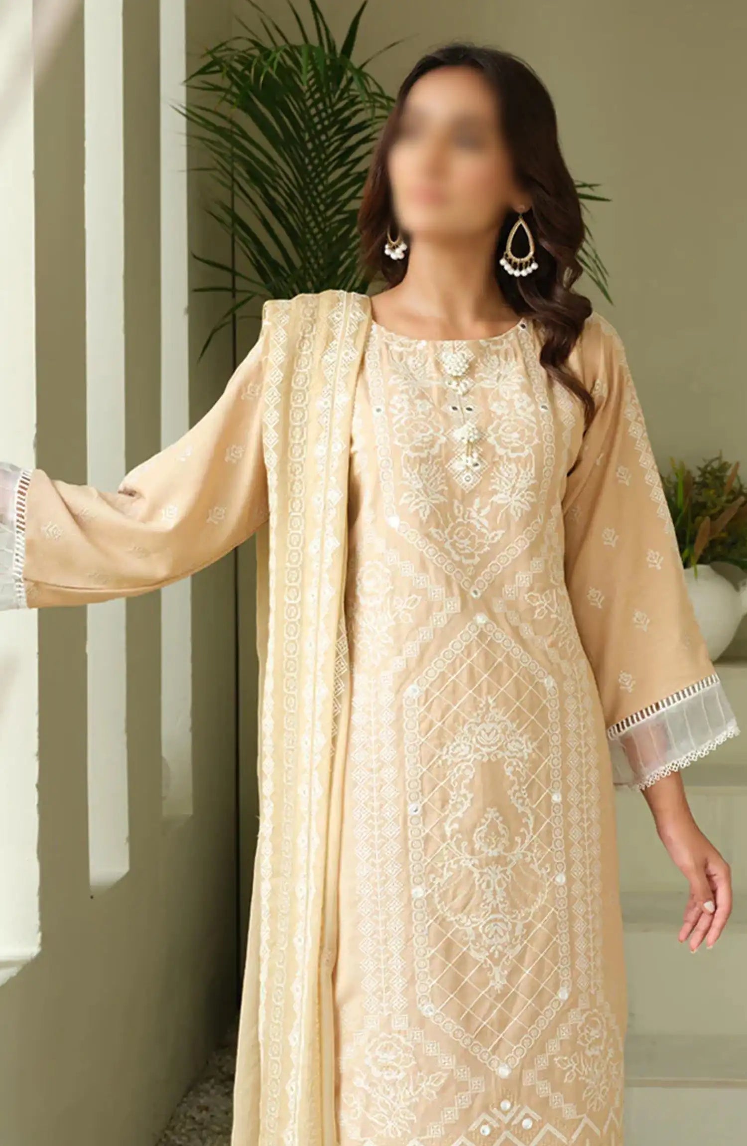 Embroidered Karandi Collection with Embroidered Chiffon Dupatta by Marjjan has been styled in the image for photography and illustrative purposes.