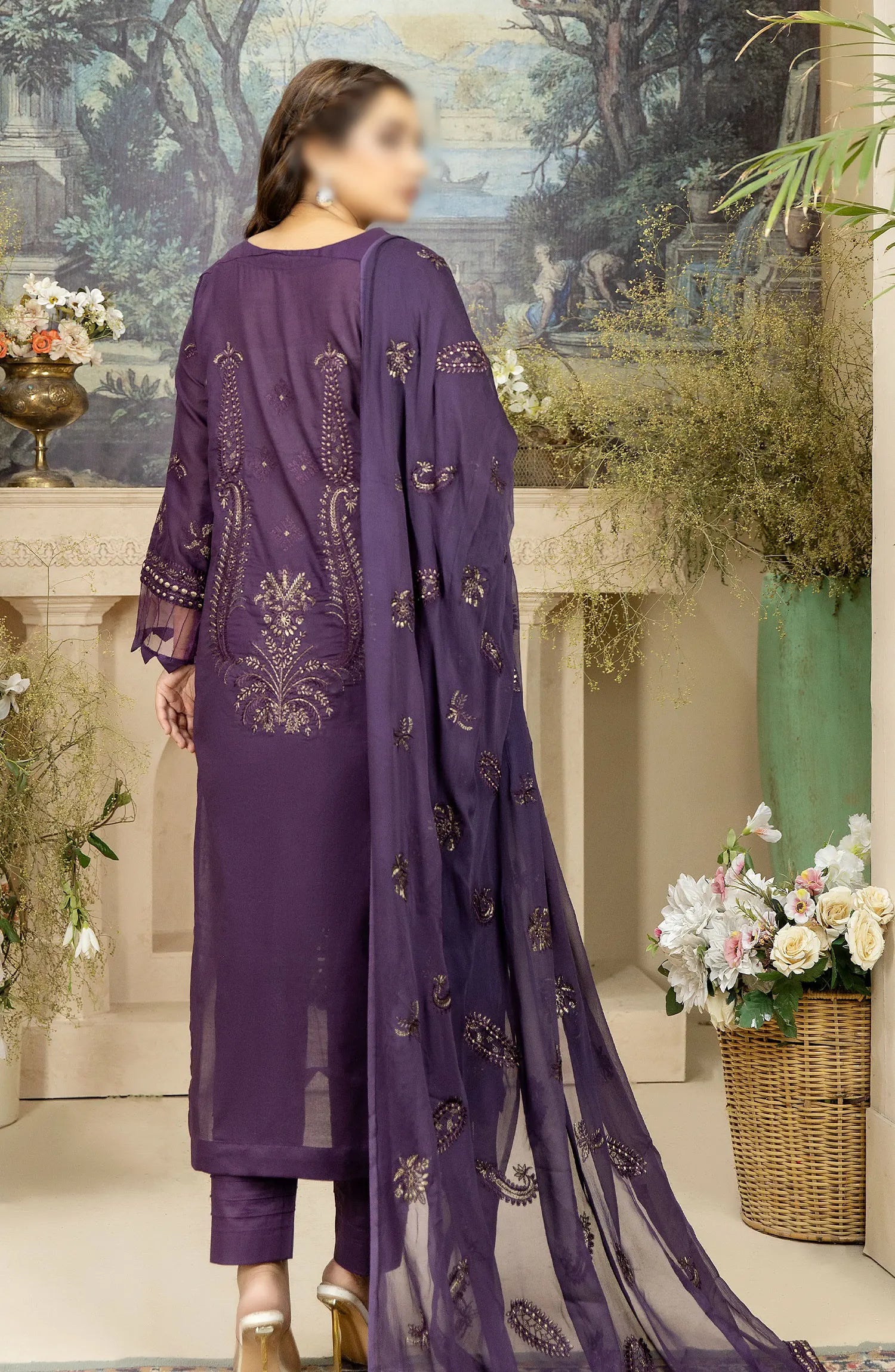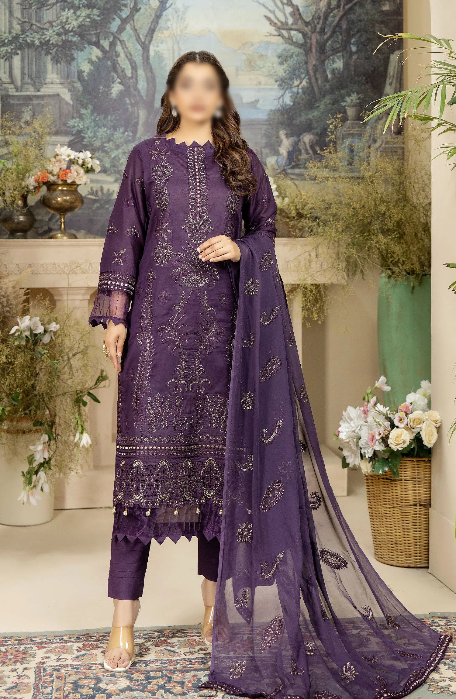Embroidered Lawn Collection with Zari work by Marjjan has been styled in the image for photography and illustrative purposes.