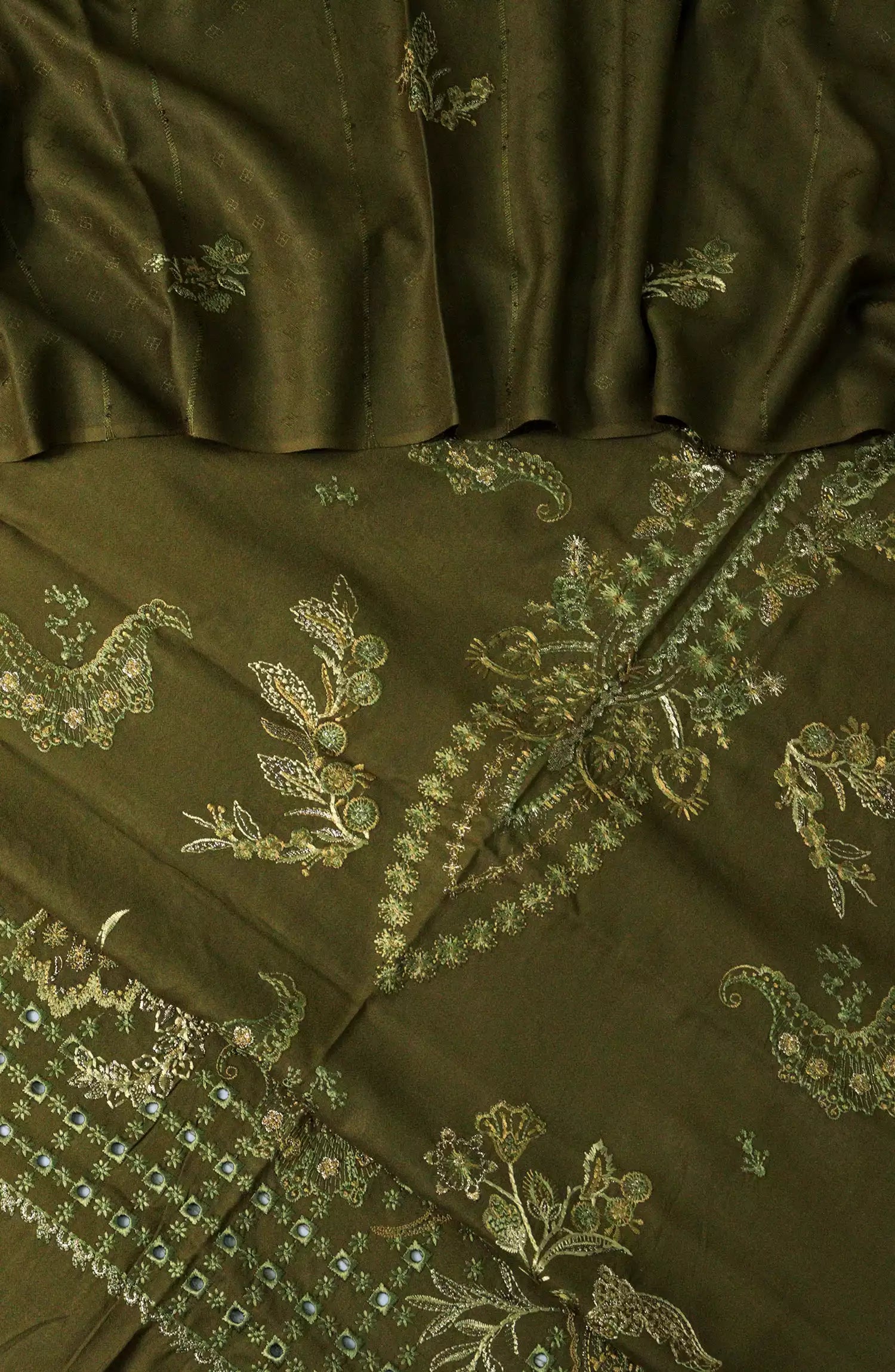 Embroidered Wool Collection with Emb Jacquard Wool shawl by Marjjan has been styled in the image for photography and illustrative purposes.