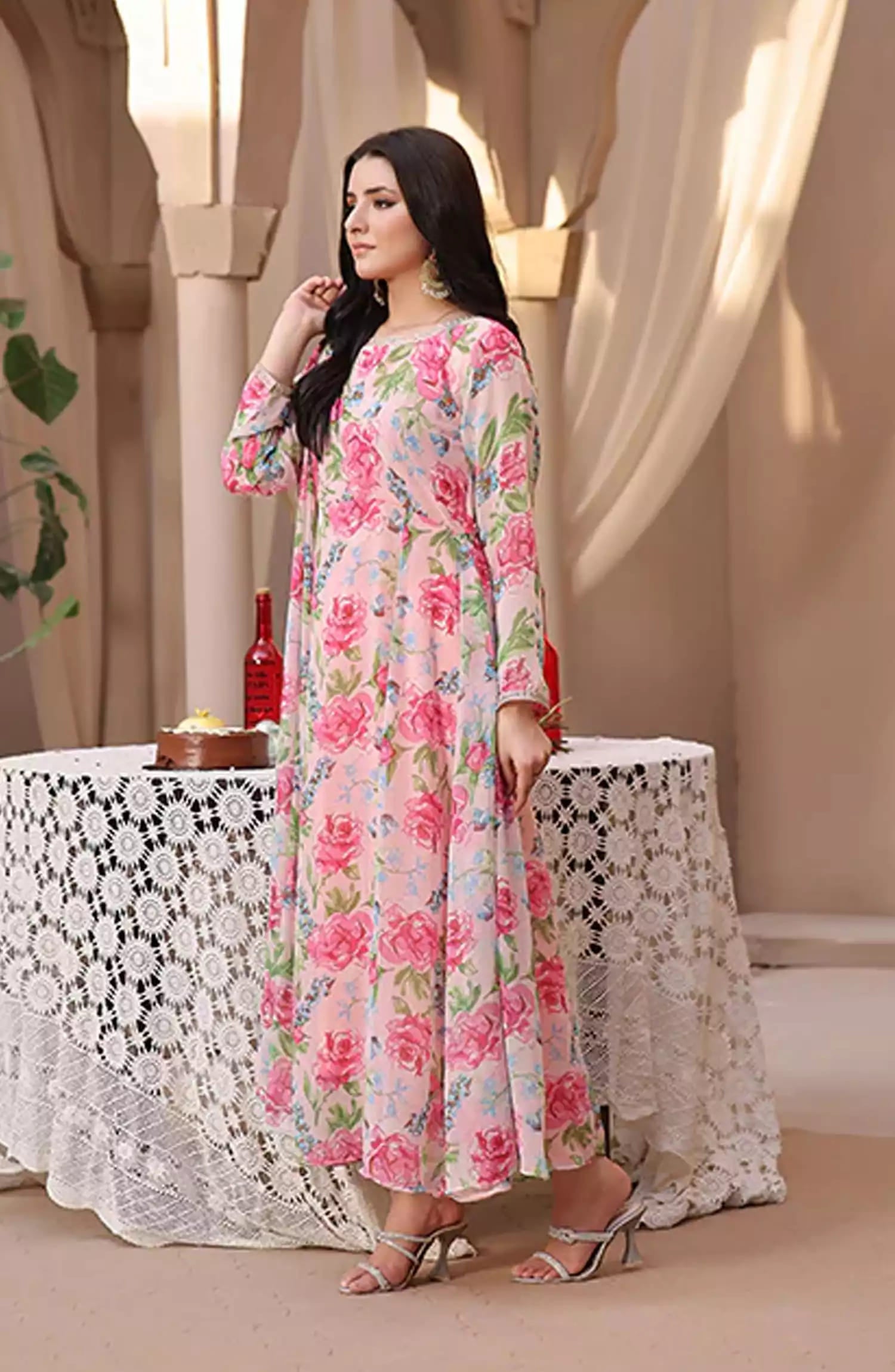 Presenting "Pink Fantasy" â a spellbinding dress in a rich, enchanting Pink Floral Tone. The chiffon maxi is adorned with a meticulously lace neck, creating a dazzling design. Paired with crepe bottoms, the ensemble is completed with a Chiffon dupatta. "Pink Fantasy" is a masterpiece of elegance and sophistication.