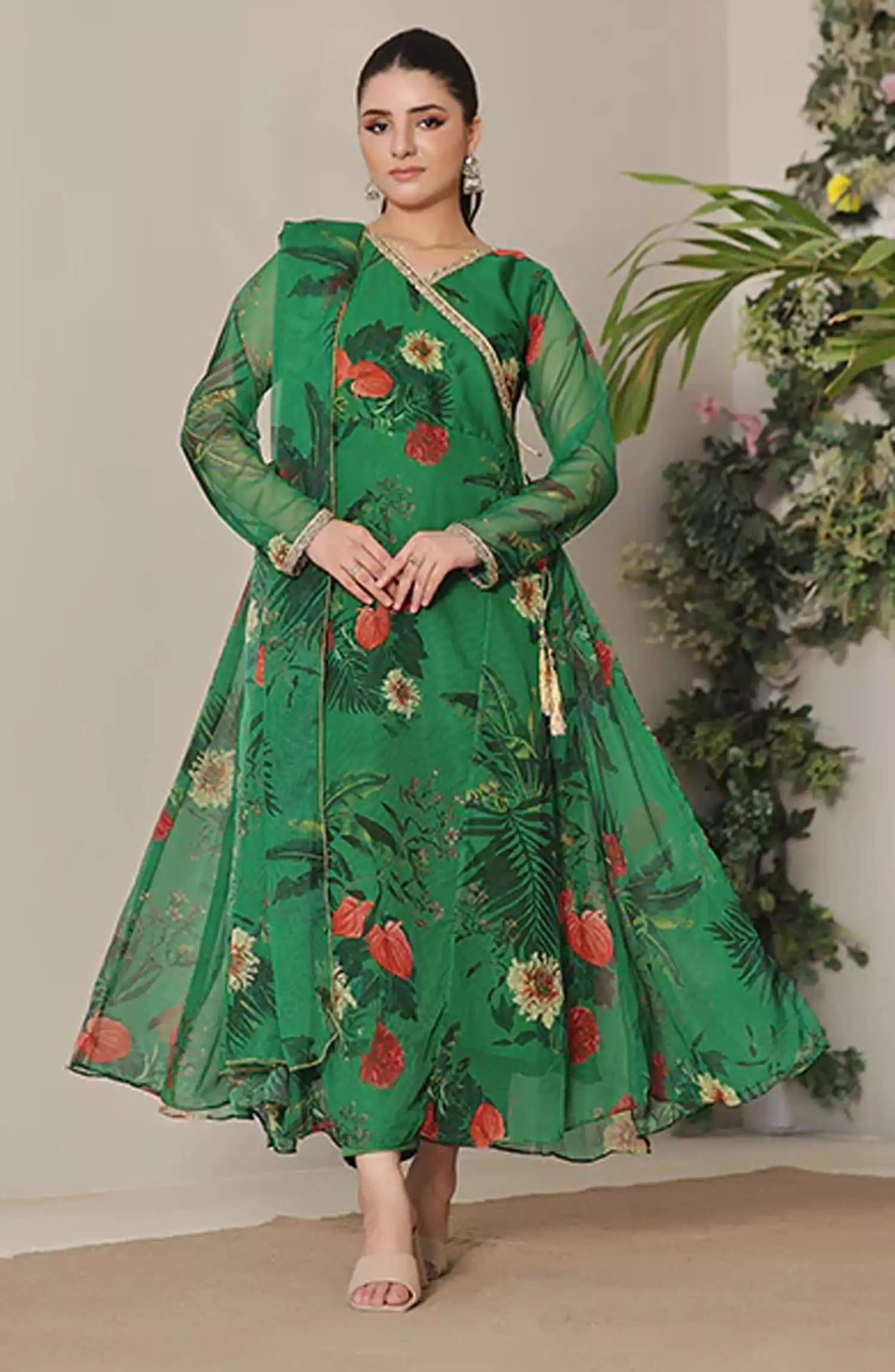 Experience the refreshing "Whisper Tale" with this stunning angharkha neckline. The Whisper Tale canvas on chiffon fabric creates a timeless look, enhanced by details on the neck. Delicate chiffon dupatta adds a touch of elegance. It is paired with a crepe bottoms and an chiffon dupatta.