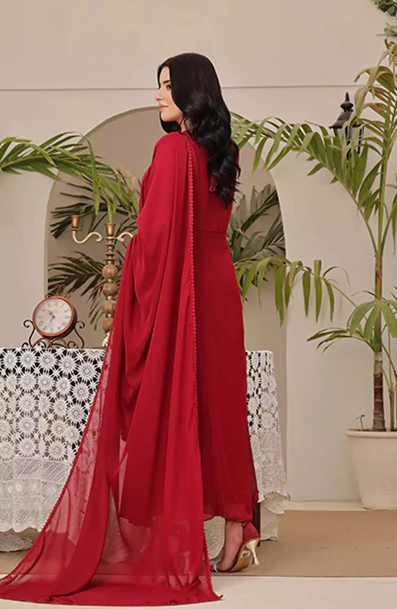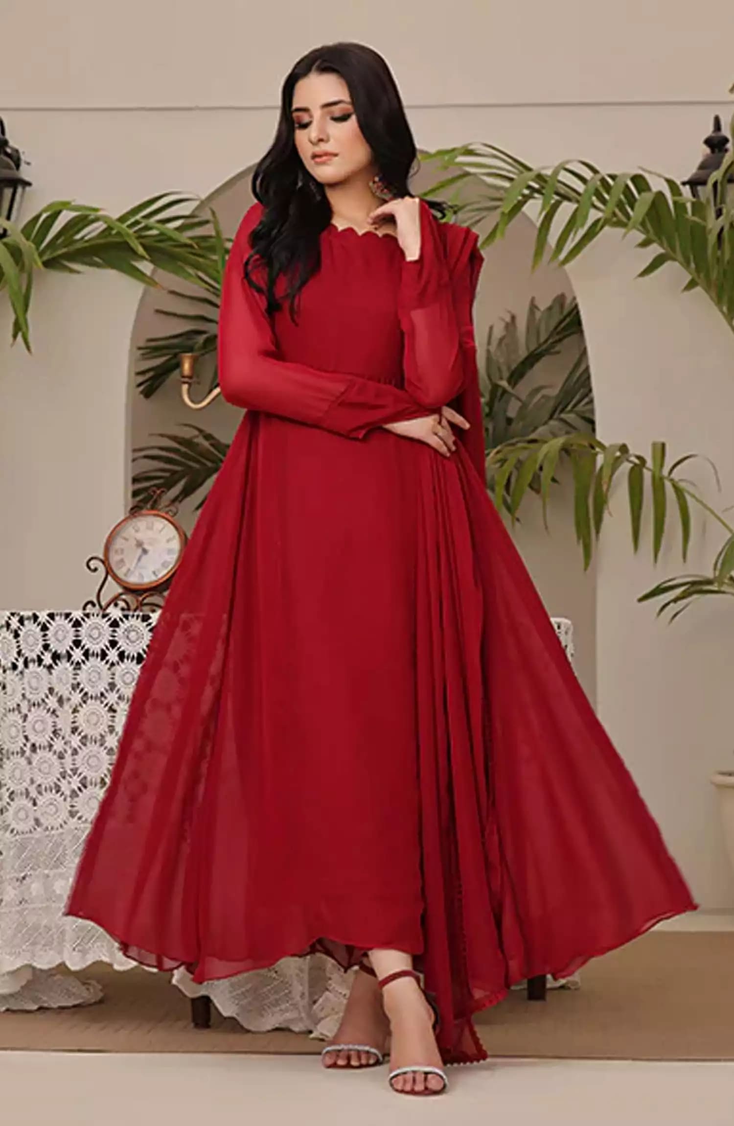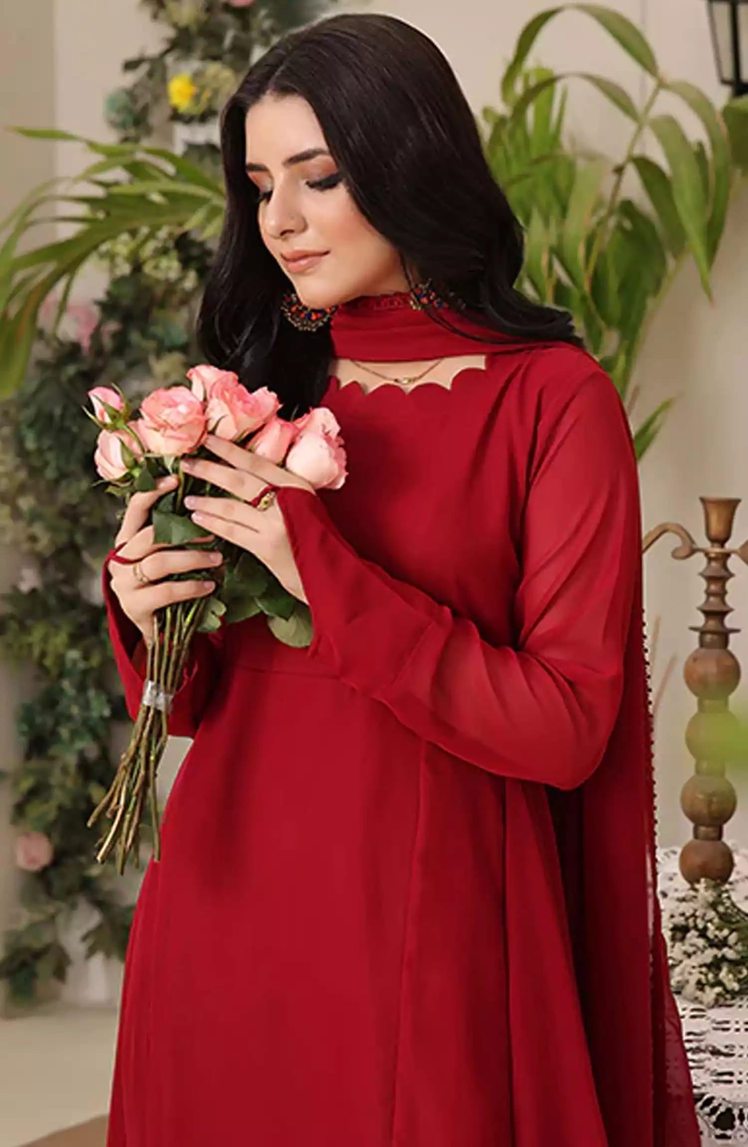 Experience the refreshing "Rouge" with this stunning neckline. The Rouge canvas on chiffon fabric creates a timeless look, enhanced by details on the neck. Delicate lace on dupatta adds a touch of elegance. It is paired with a crepe bottoms and an chiffon dupatta.