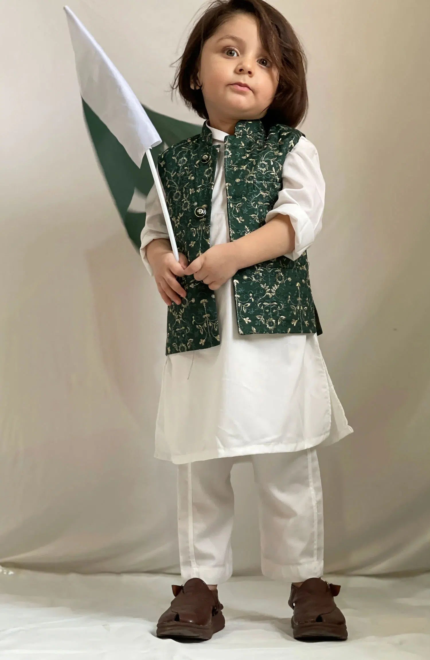 Includes Leaf Green embroidered waistcoat & white kameez shalwar