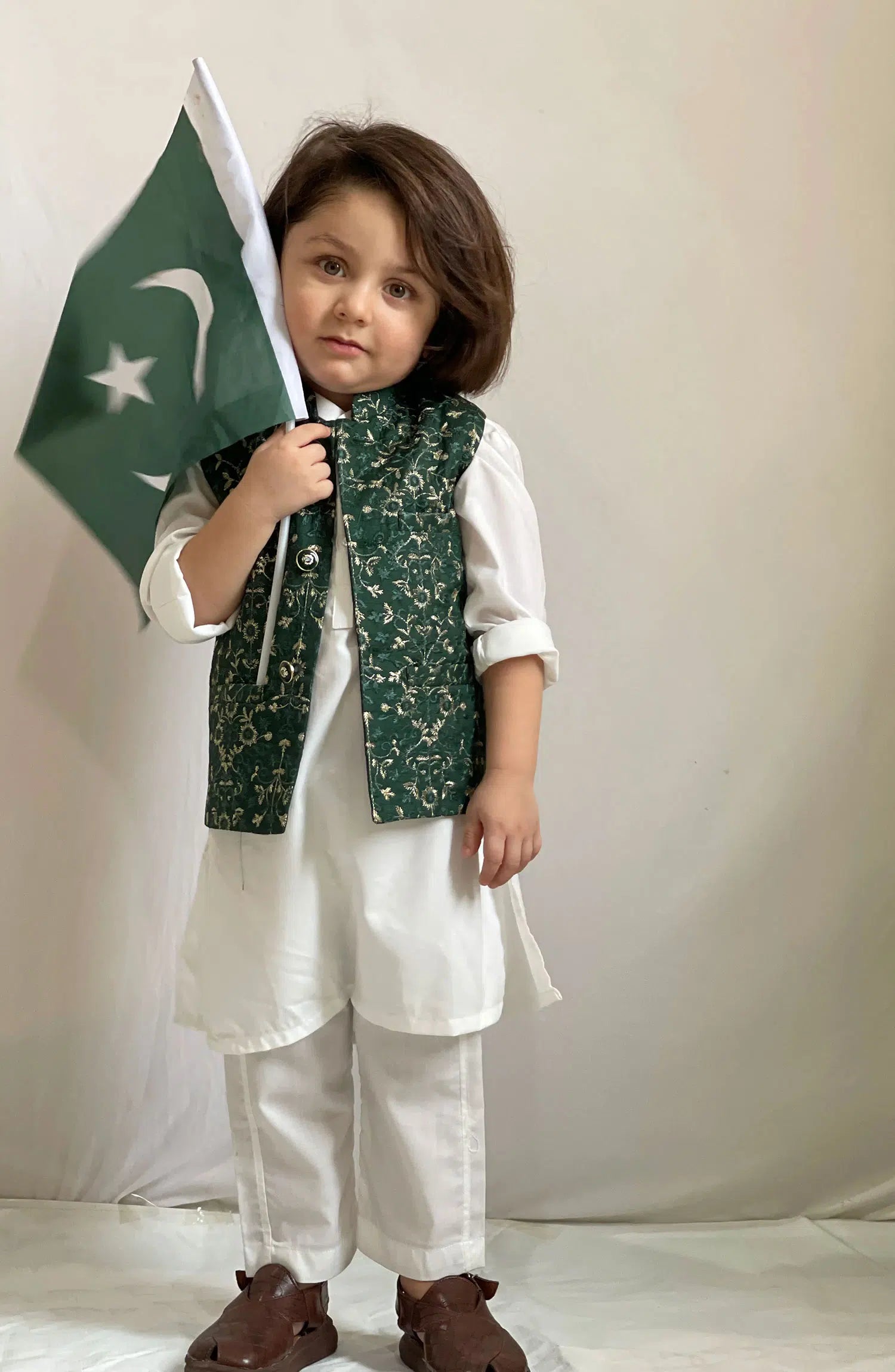 This dark green waistcoat with white shalwar kameez is a stunning piece with intricate embroidery. It looks elegant and majestic. The green colors adds a touch of sophistication, while the embroidery adds a unique and eye-catching detail. Itâs the perfect choice for our natinonal independance day when you want to make a statement.