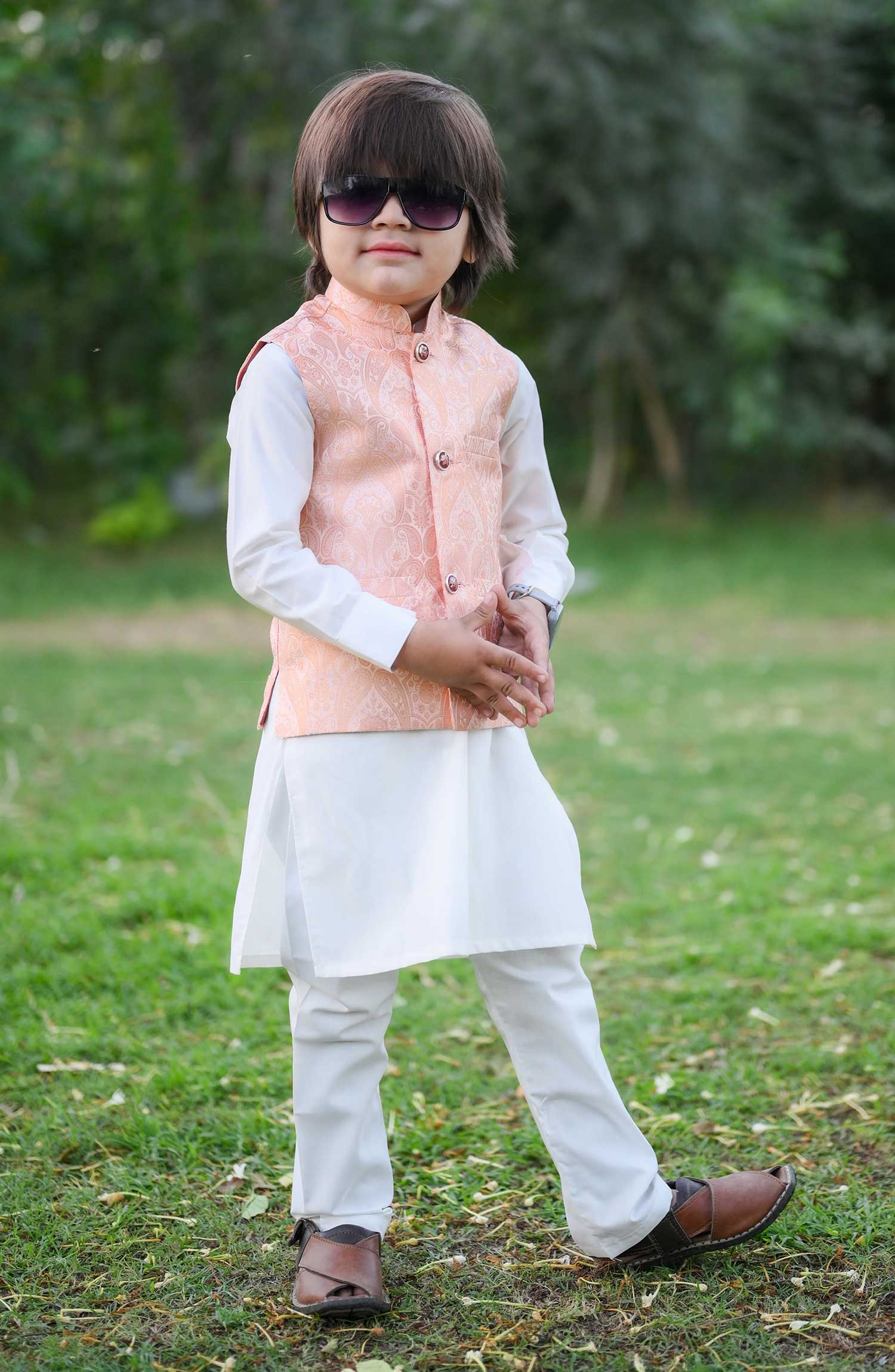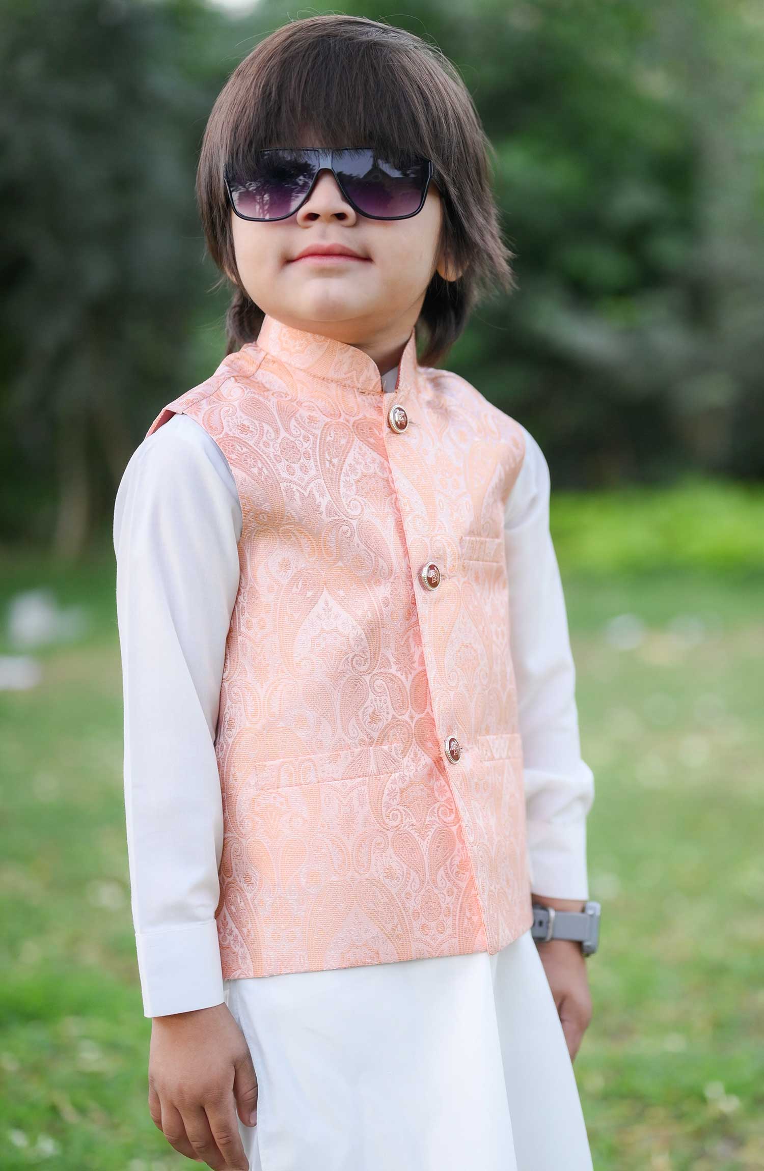 The combination of peach and golden is always a classic and sophisticated choice. The white kurta adds a touch of elegance, while the jamawar peach waistcoat with its intricate detailing and shimmering fabric takes the outfit to another level. It's a perfect choice for special occasions or formal events where you want to make a statement. You'll definitely turn heads and feel like a true fashion icon in this ensemble!