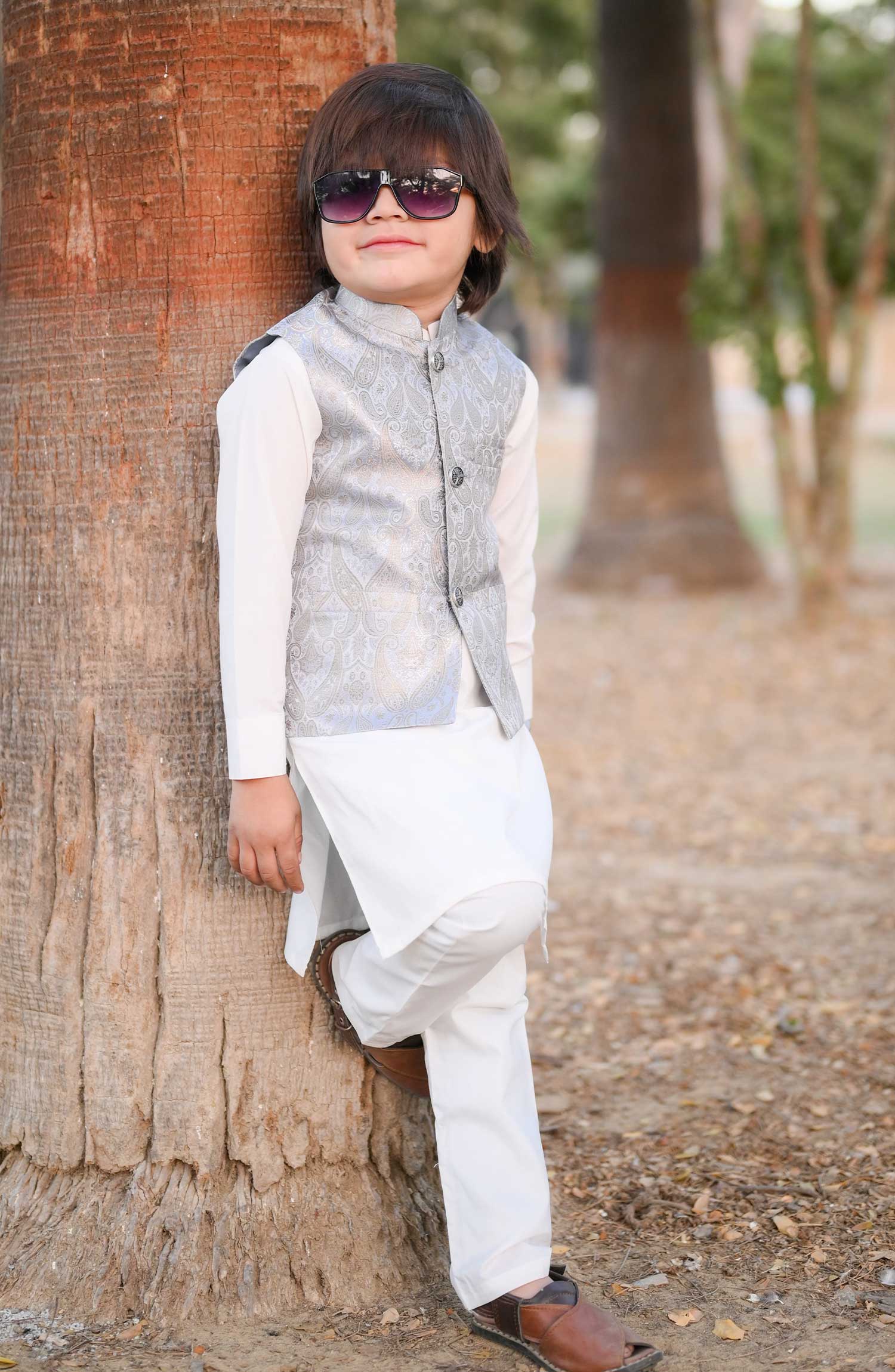 The combination of grey and silver is always a classic and sophisticated choice. The white kurta adds a touch of elegance, while the jamawar grey waistcoat with its intricate detailing and shimmering fabric takes the outfit to another level. It's a perfect choice for special occasions or formal events where you want to make a statement. You'll definitely turn heads and feel like a true fashion icon in this ensemble!
