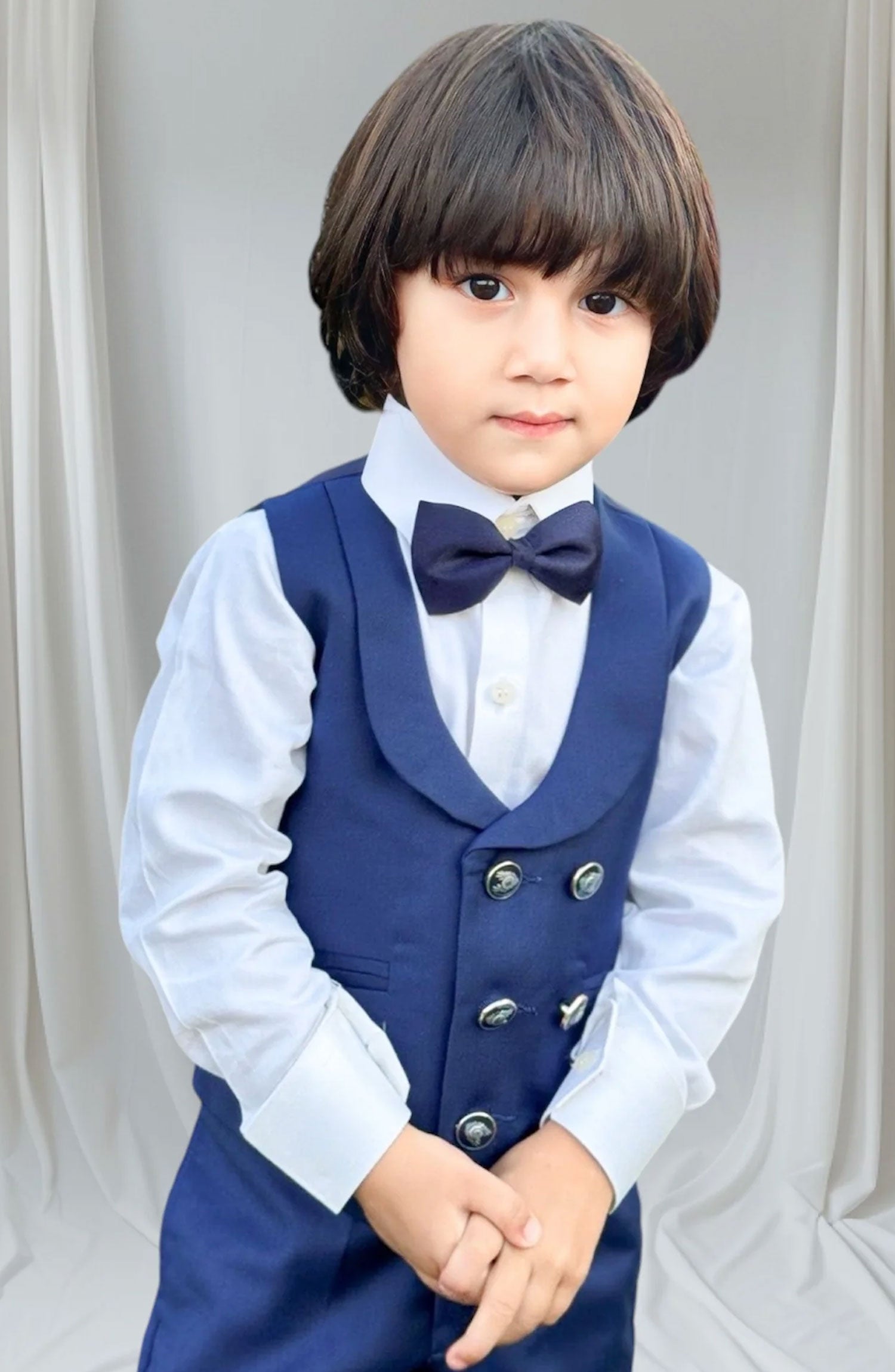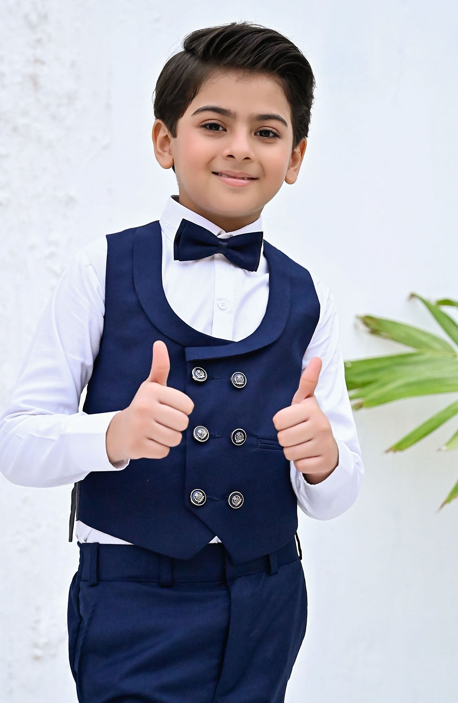 The suit is made of rich blue fabric, tailored to perfection. The waistcoat adds an extra touch of elegance, with its matching blue color and polished buttons. The pants are perfectly tailored with a slim fit. The bow tie adds a charming touch, completing the sophisticated look. Itâs a timeless and stylish ensemble thatâs perfect for any special occasion.