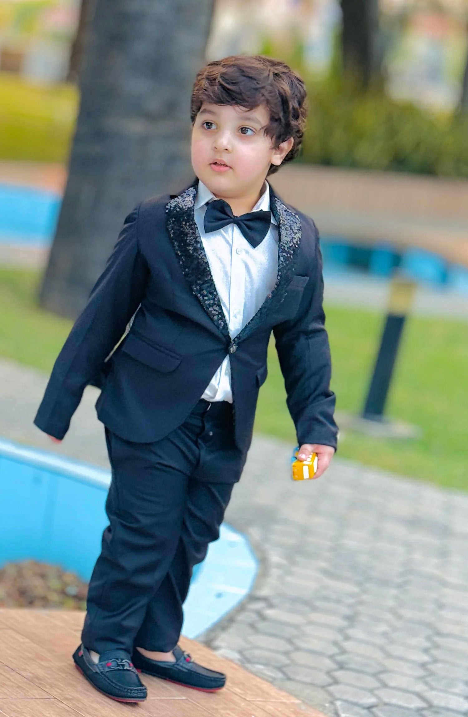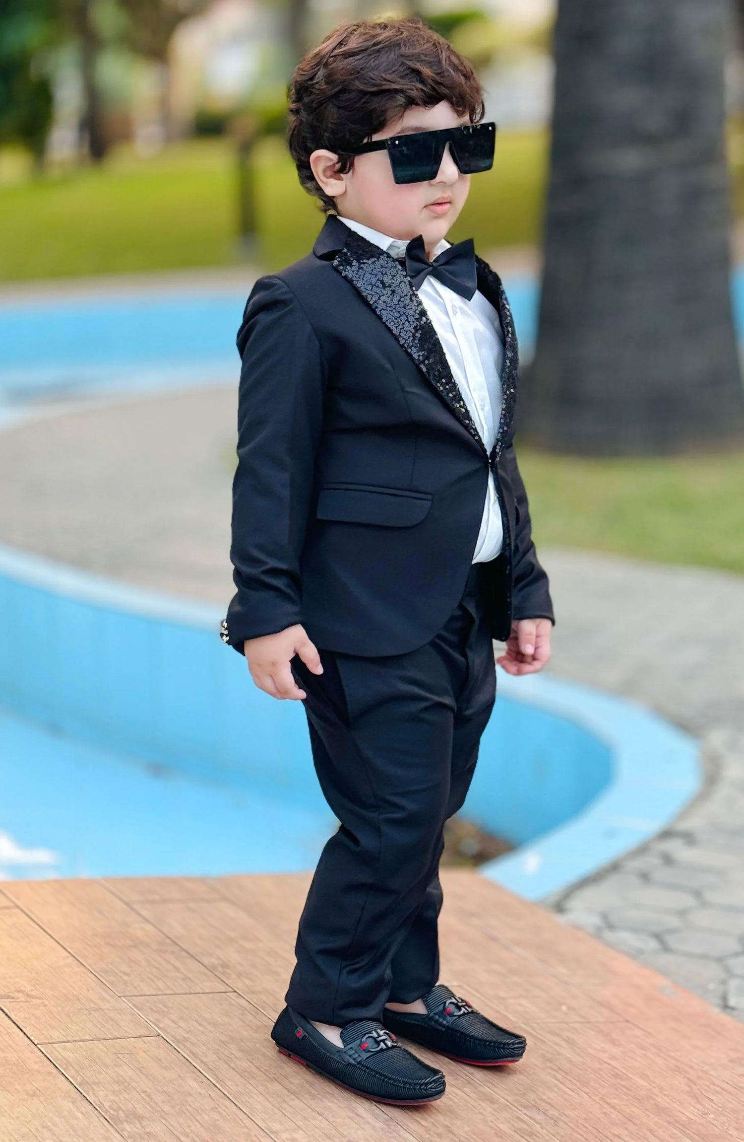 The suit is a classic shade of black, accentuating your style with atouch of sophistication. The bow tie adds a charming and elegent flair to the outfit along with the sequin detailing. Itâs the perfect ensemble for any formal occasion.