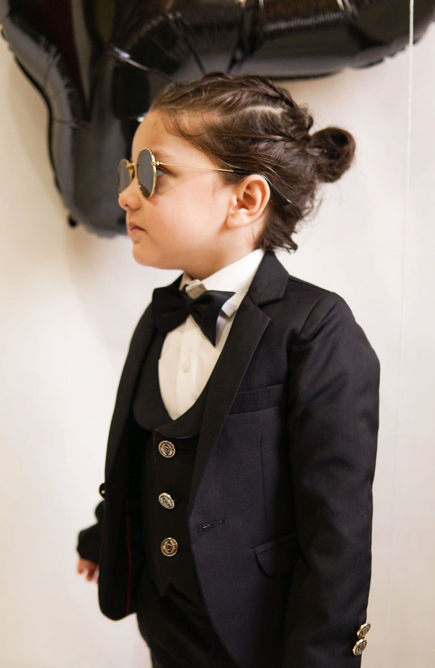 The suit features a sleek black coat with a tailored fit, giving you a polished and sophisticated look. The pants are perfectly matched, providing a clean and streamlined silhouette. The waistcoat adds an extra touch of style, with its matching black fabric and button detailing. The bow completes the ensemble, adding a touch of elegance and charm.Its a classic and timeless outfit that exudes confidence and class.